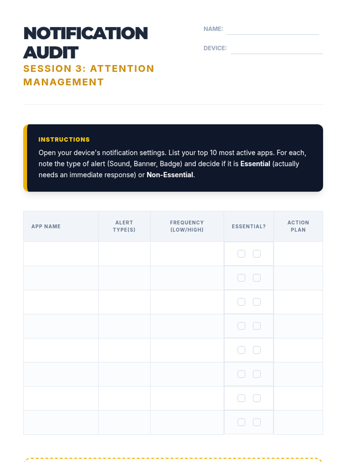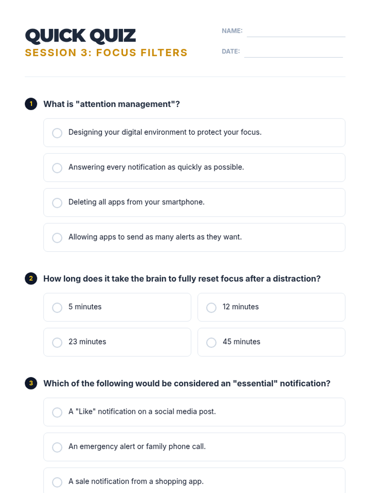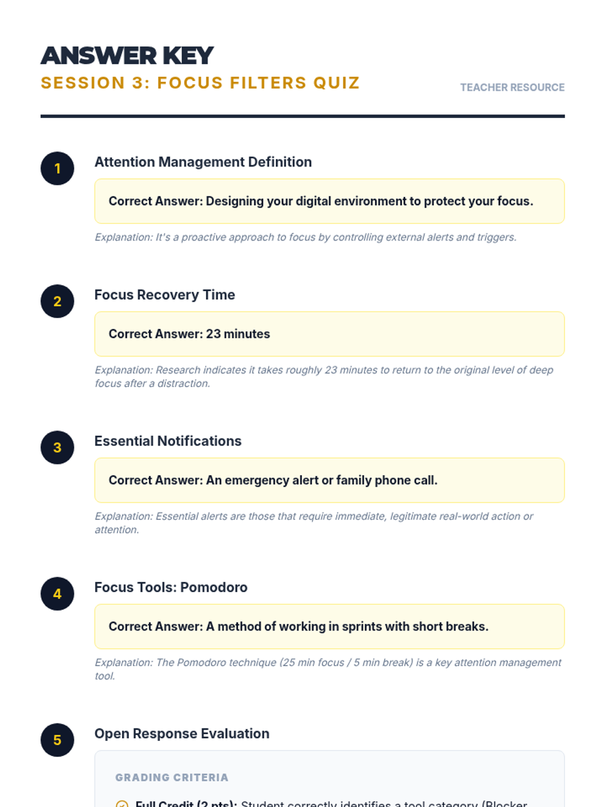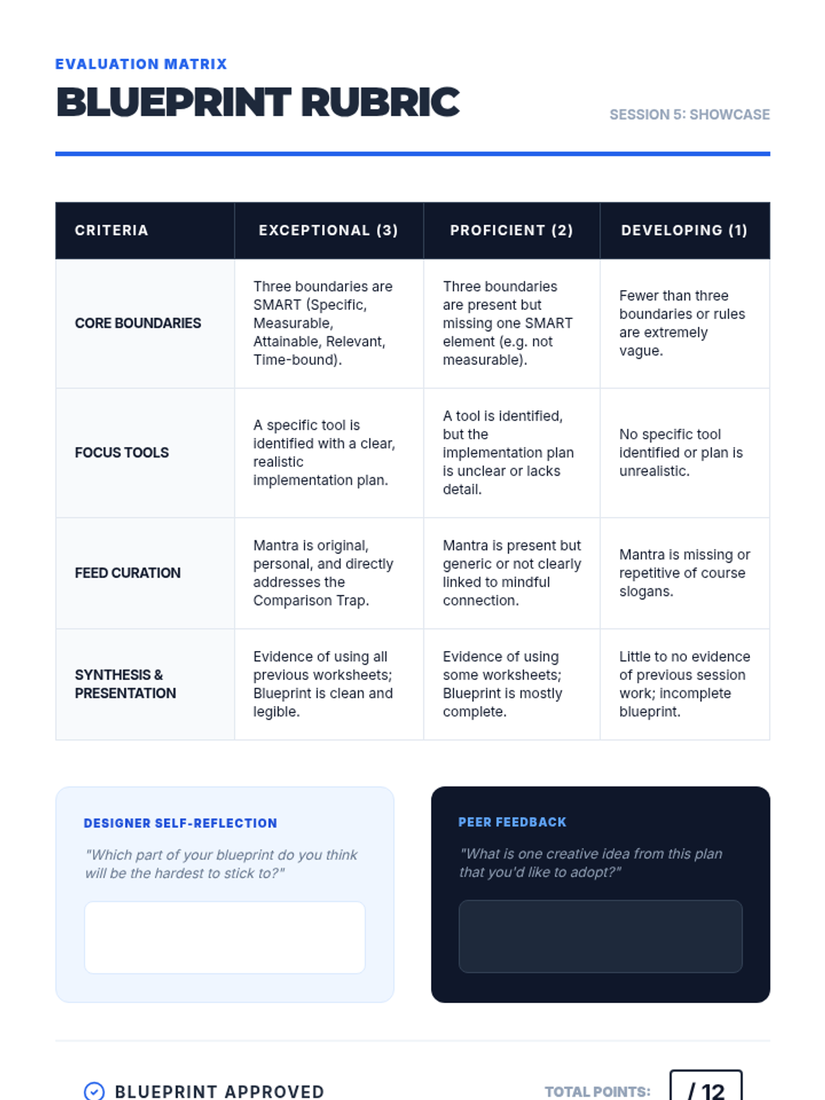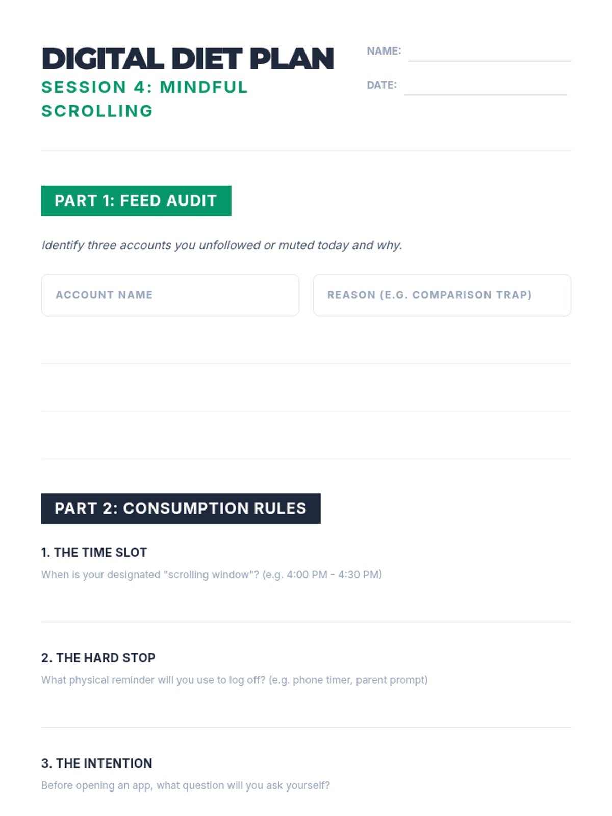 A 5-session digital wellbeing course for 11th graders designed to help them balance their online and offline lives. Students explore digital habits, set tech boundaries, manage notifications, analyze social media impact, and culminate their learning in a personalized wellness project.