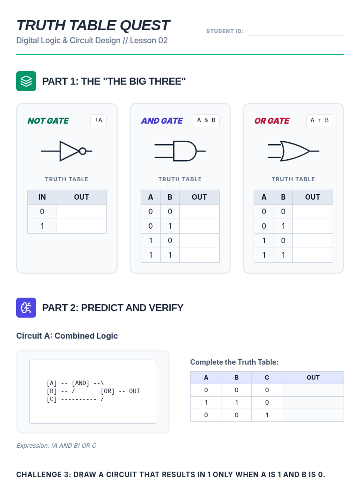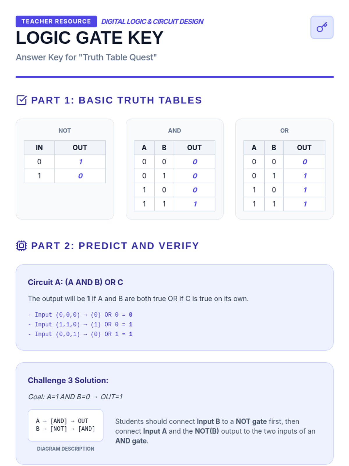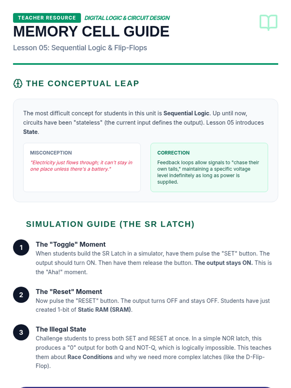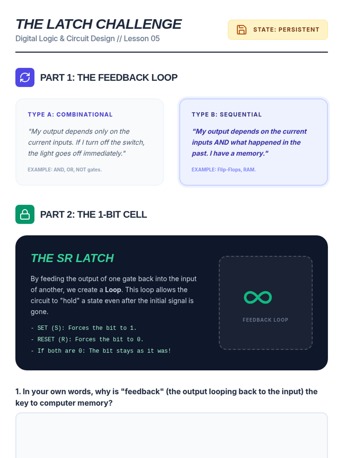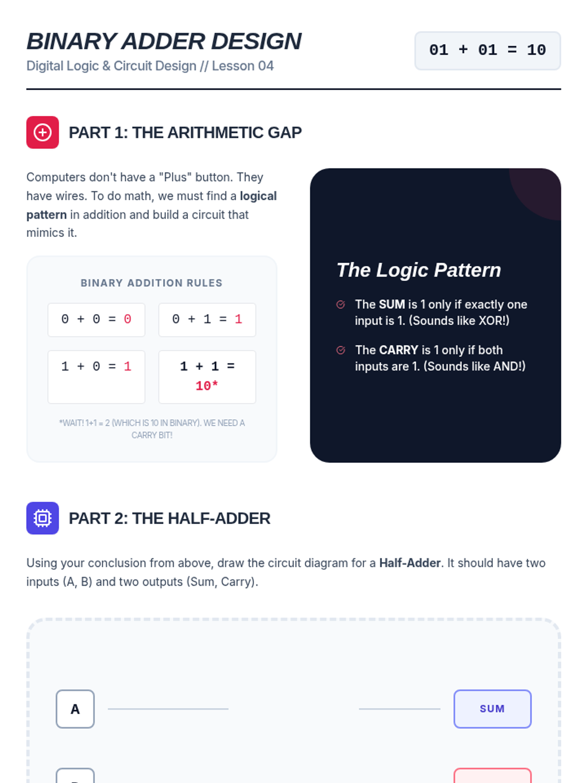 A comprehensive 5-lesson unit for 10th-grade students exploring the physical and logical foundations of modern computing, from transistors to memory cells. Students build a conceptual and practical understanding of how binary arithmetic and logic are executed by hardware.