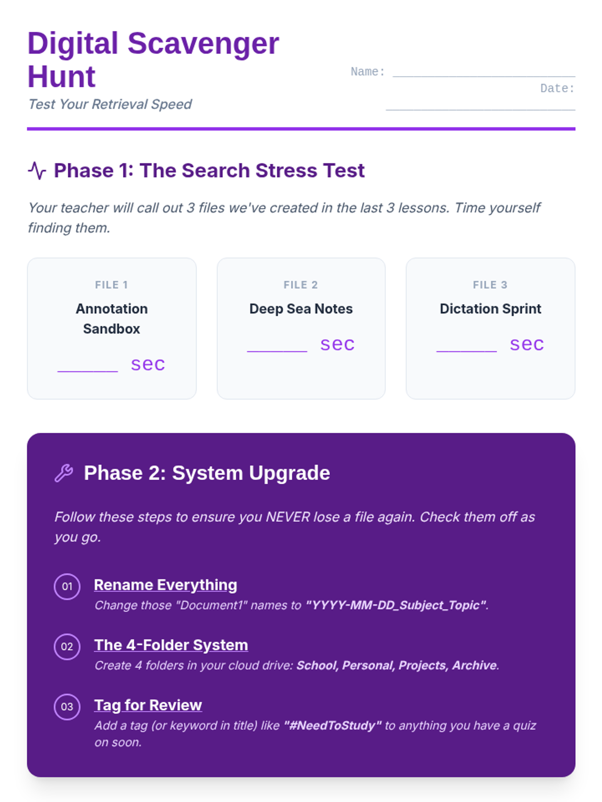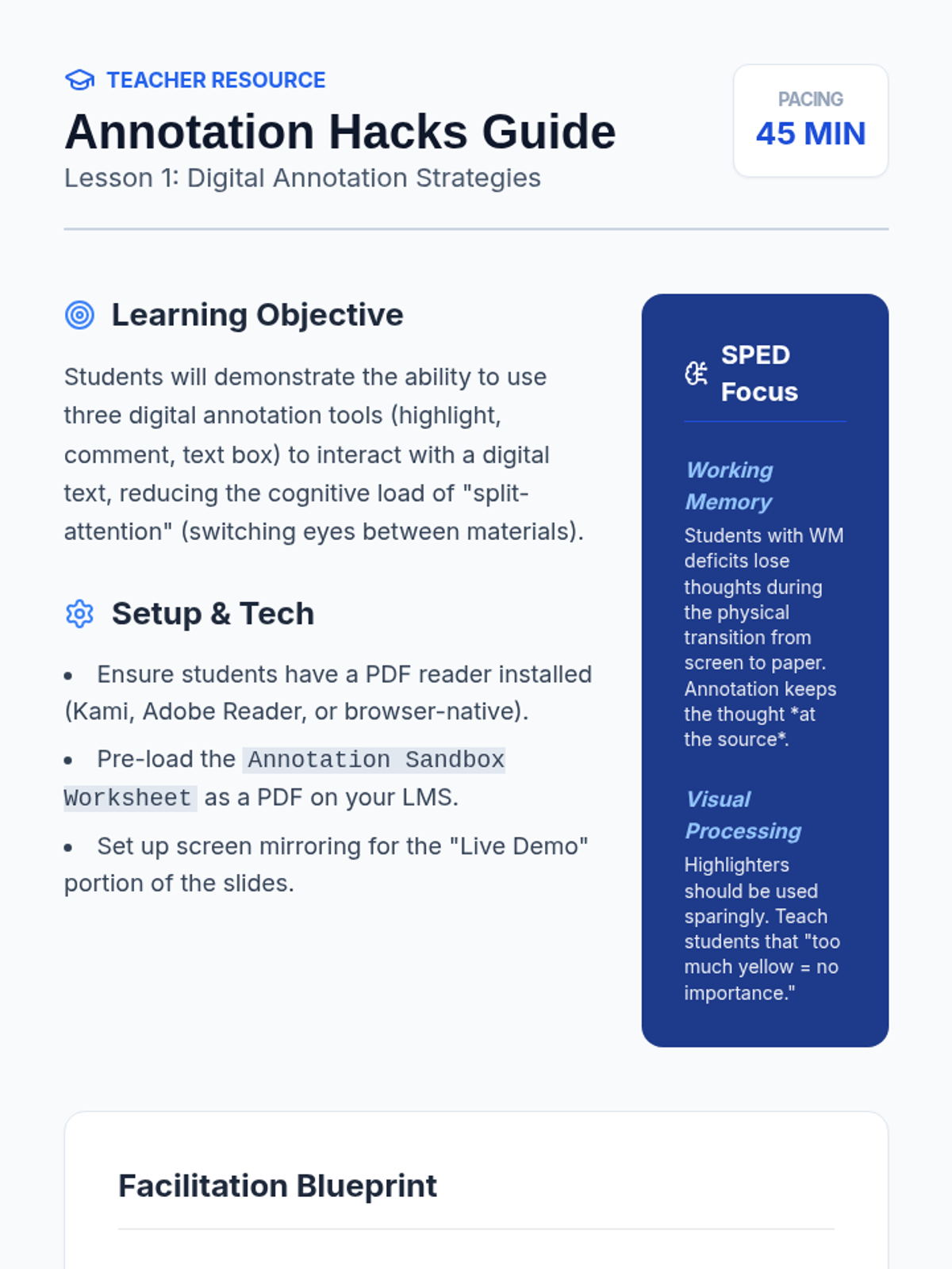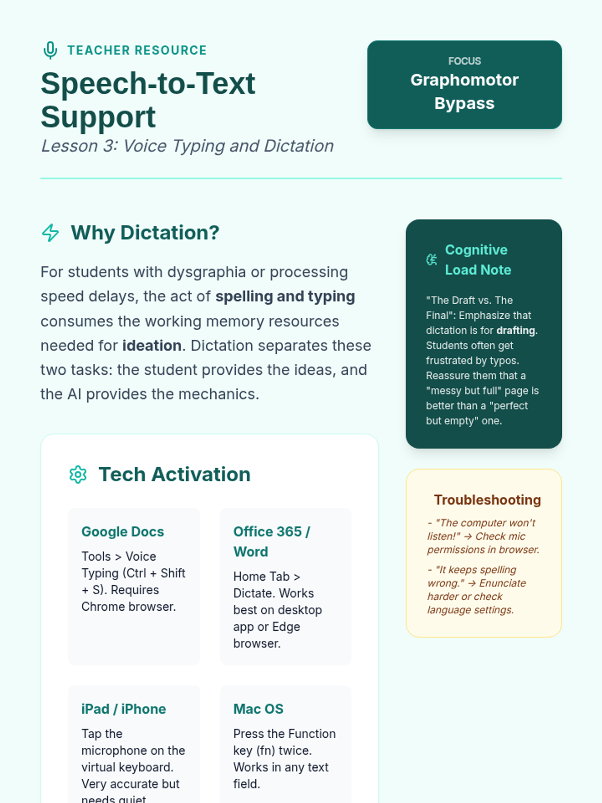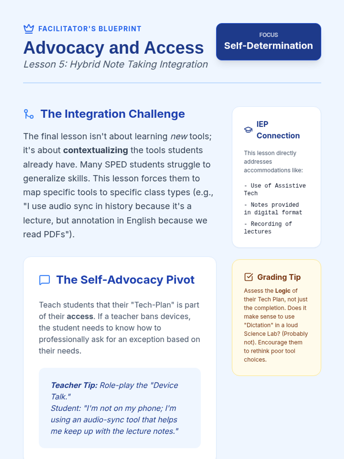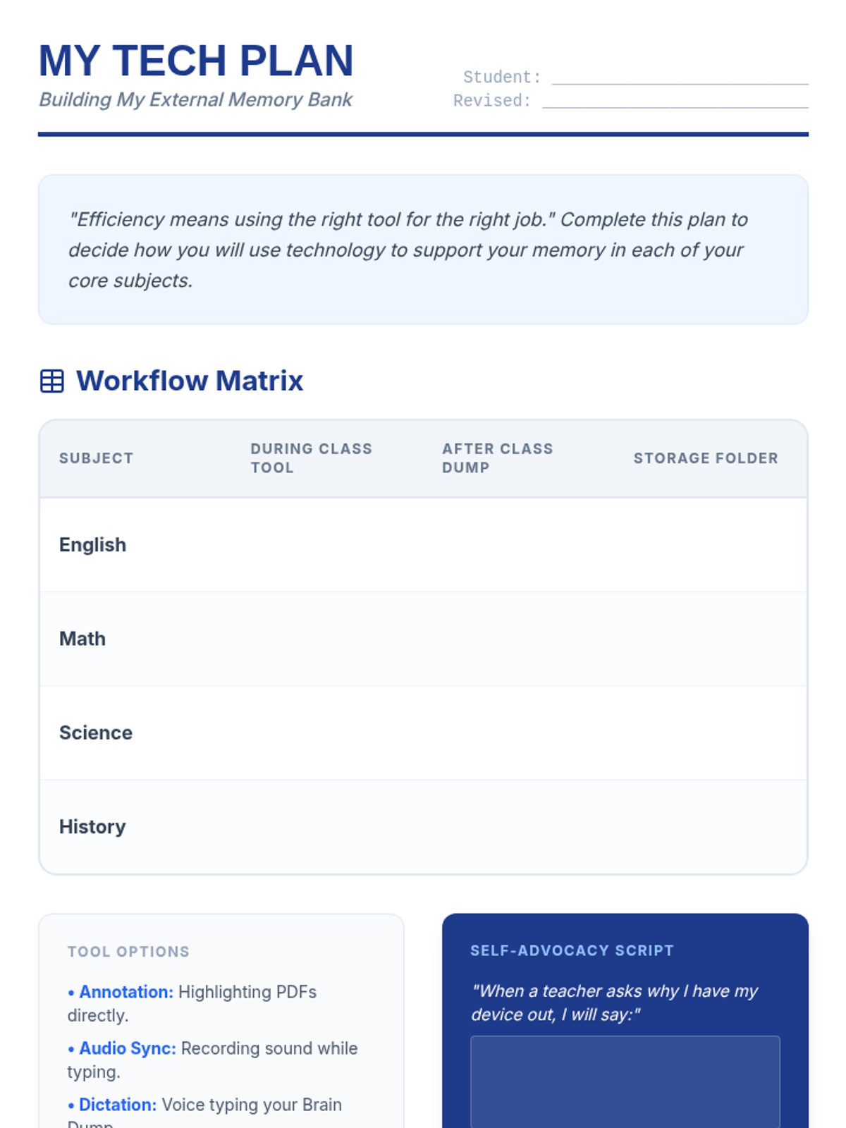 A 5-lesson sequence for 9th-grade students with Special Education needs, focusing on digital tools to offload working memory during note-taking. Students learn annotation, audio syncing, dictation, and digital organization to create a personalized, efficient workflow.