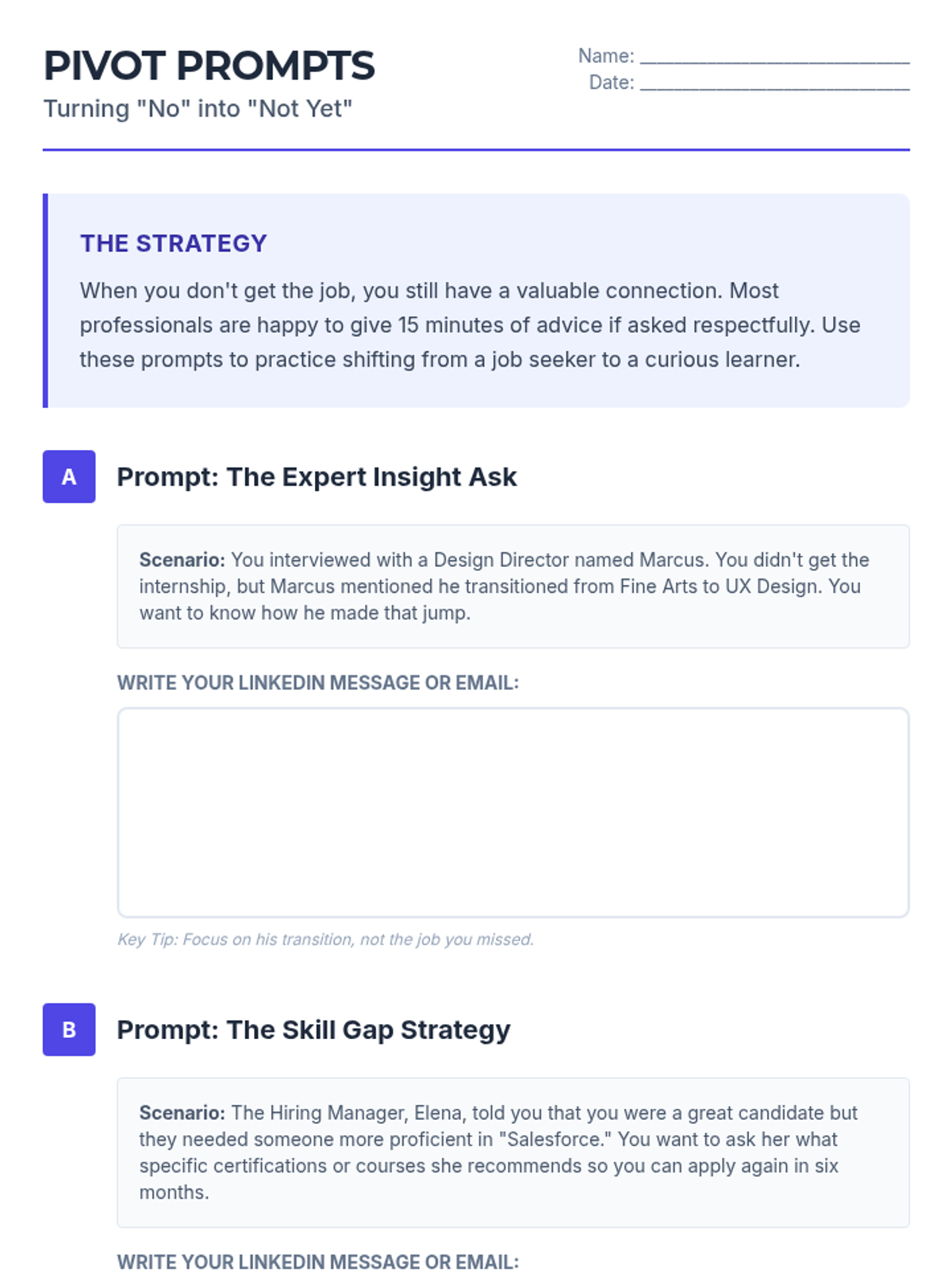 A career-readiness sequence designed for older students and undergraduates to identify their current skills, potential growth areas, and personality types using the Ikigai and Quadrant of Success models. Students move from auditing their time to creating a strategic roadmap for professional development.