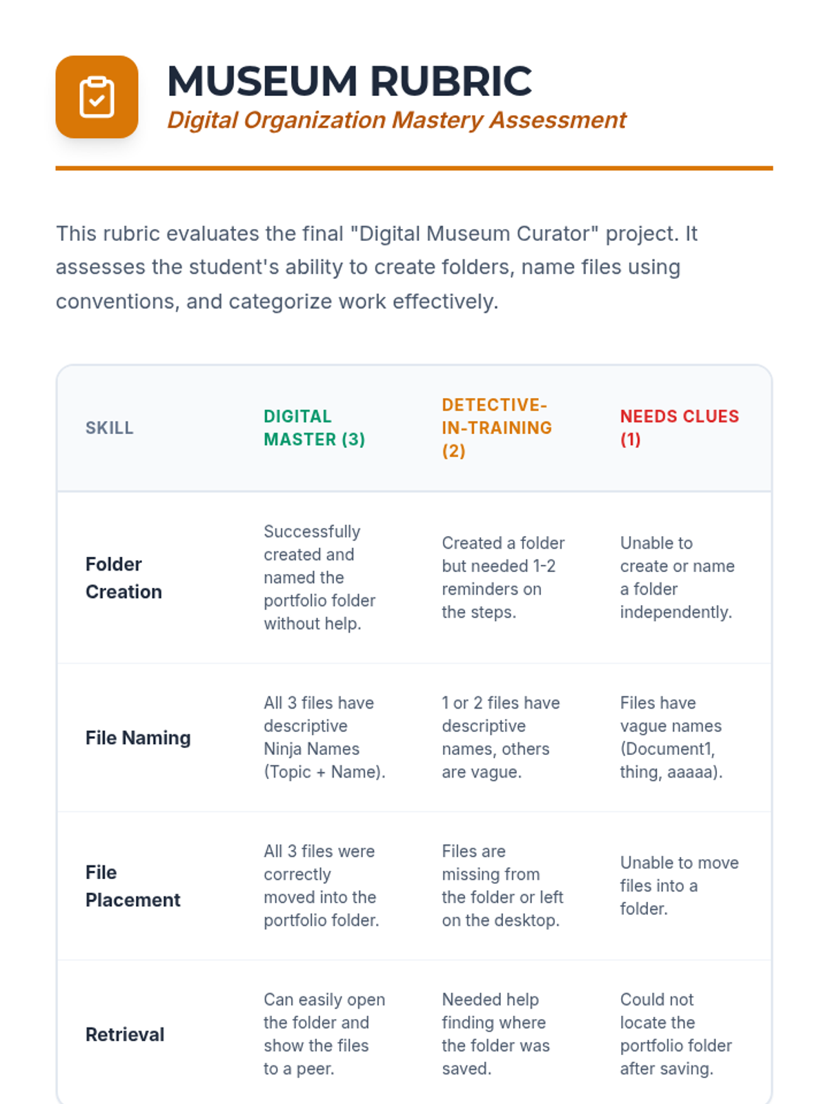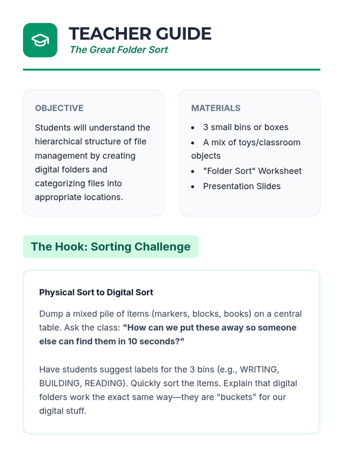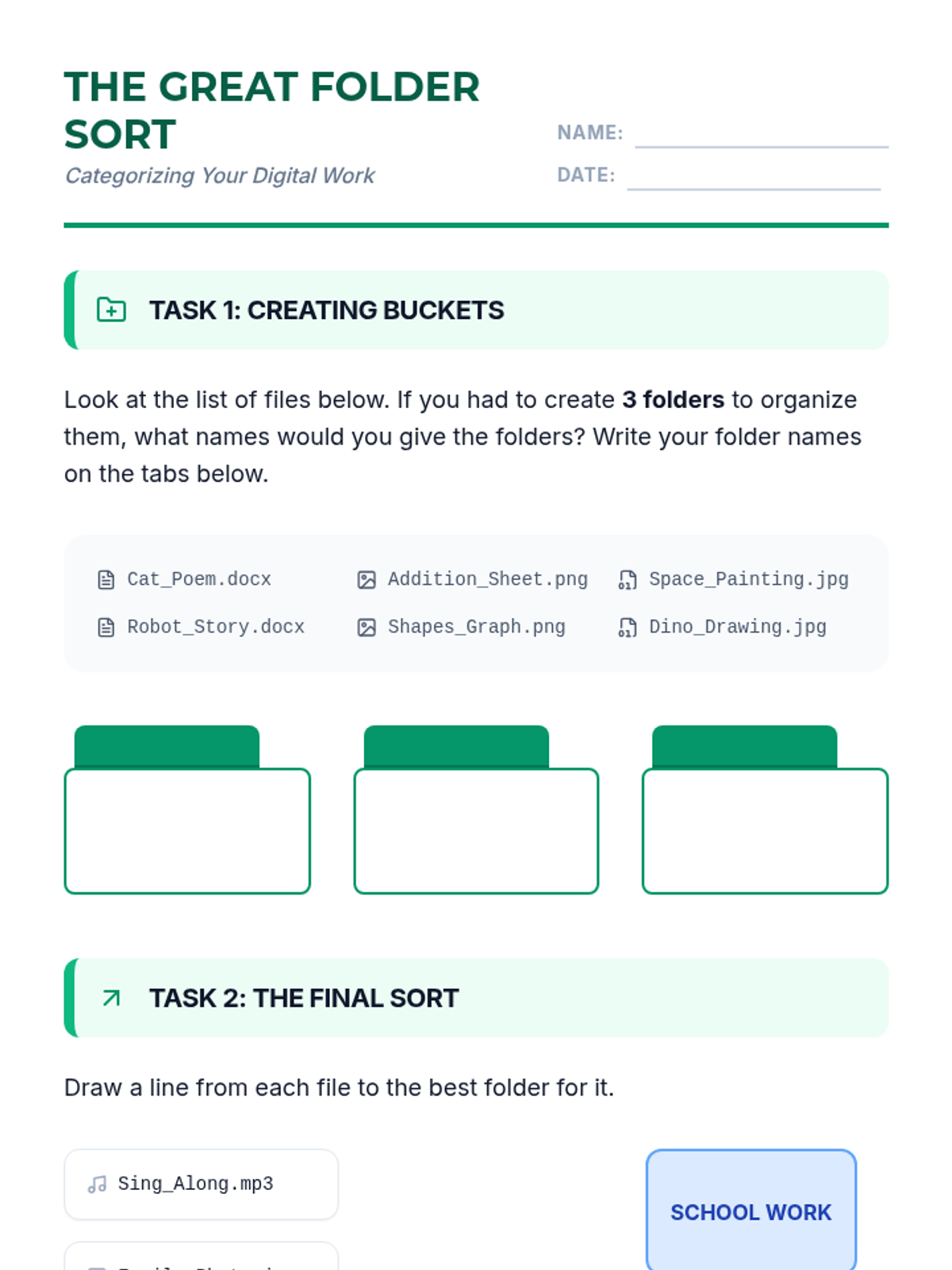 This project-based sequence introduces 2nd-grade students to digital file management through concrete analogies. Students learn to navigate the desktop, name files properly, organize work into folders, and retrieve information, culminating in a digital portfolio project.