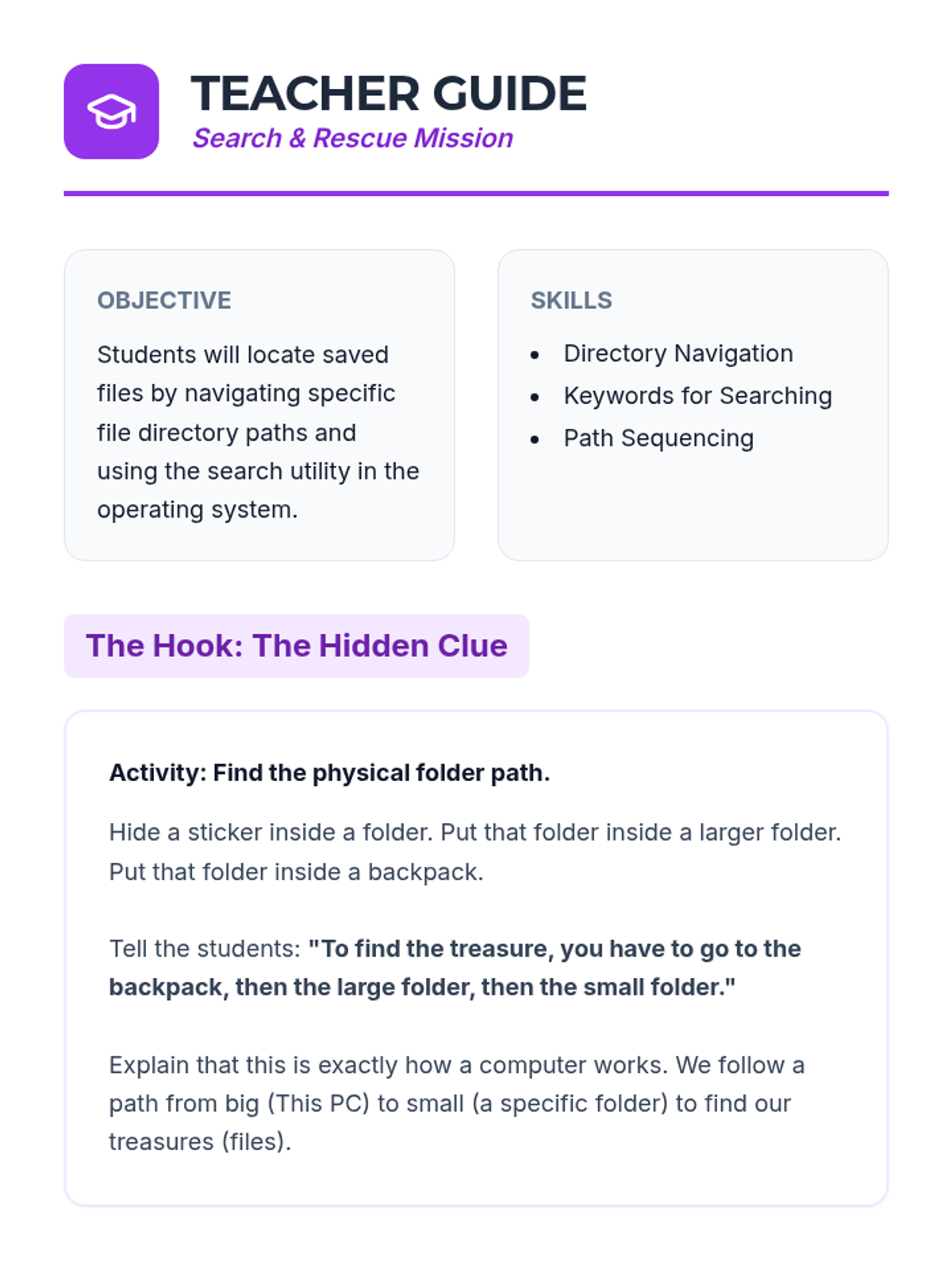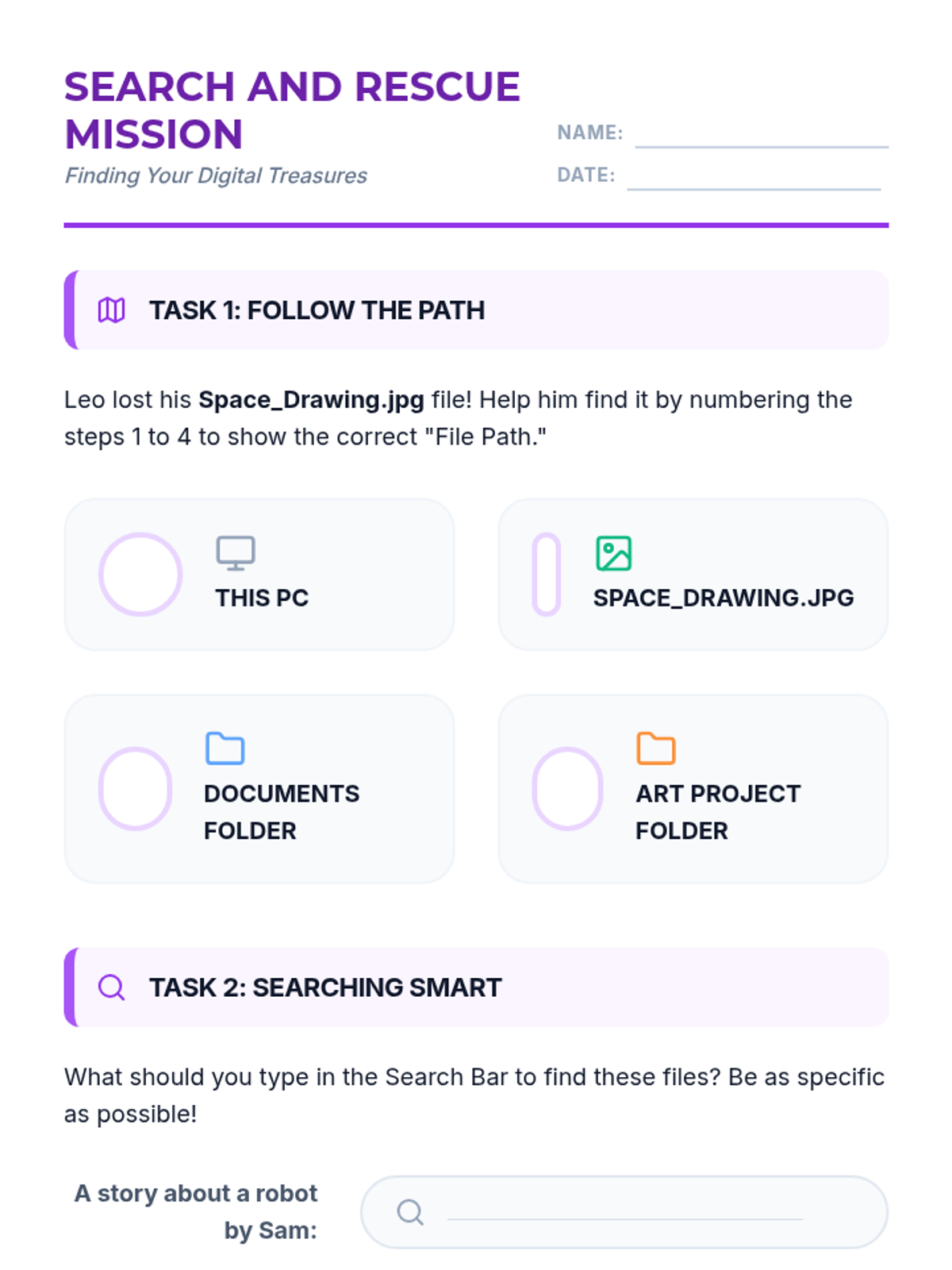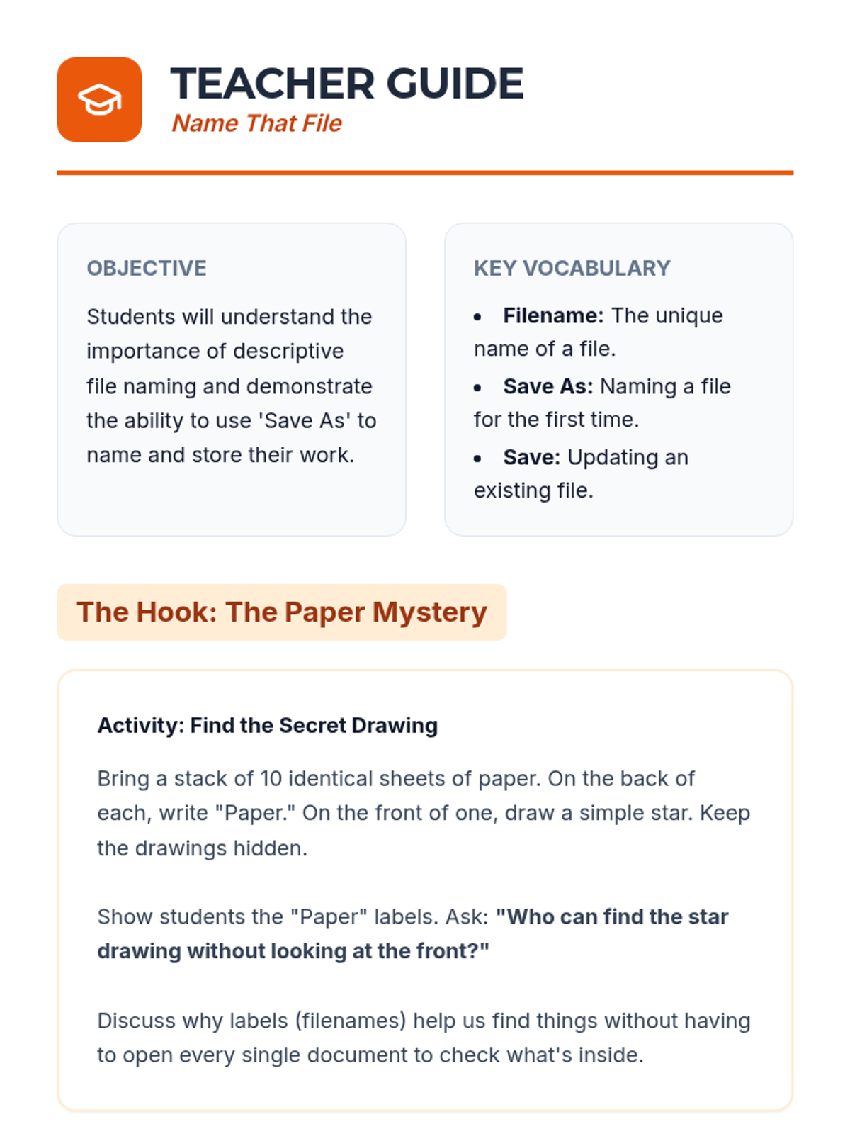 This project-based sequence introduces 2nd-grade students to digital file management through concrete analogies. Students learn to navigate the desktop, name files properly, organize work into folders, and retrieve information, culminating in a digital portfolio project.