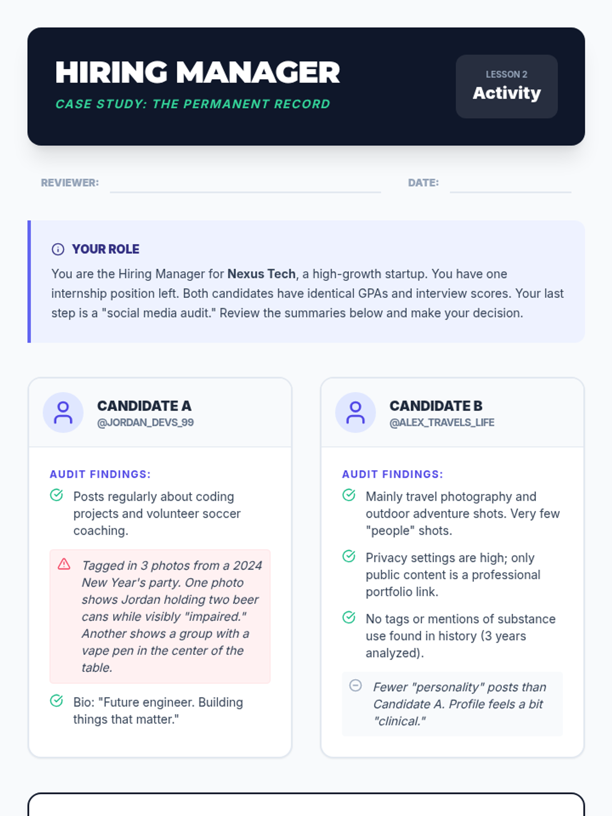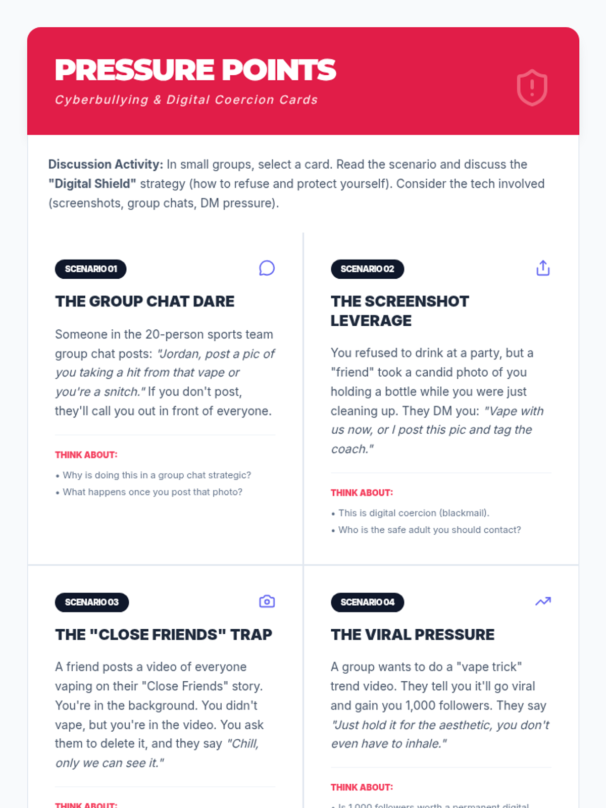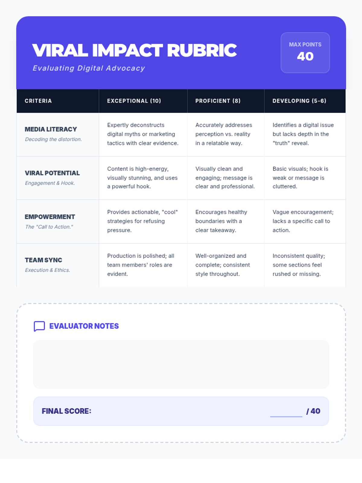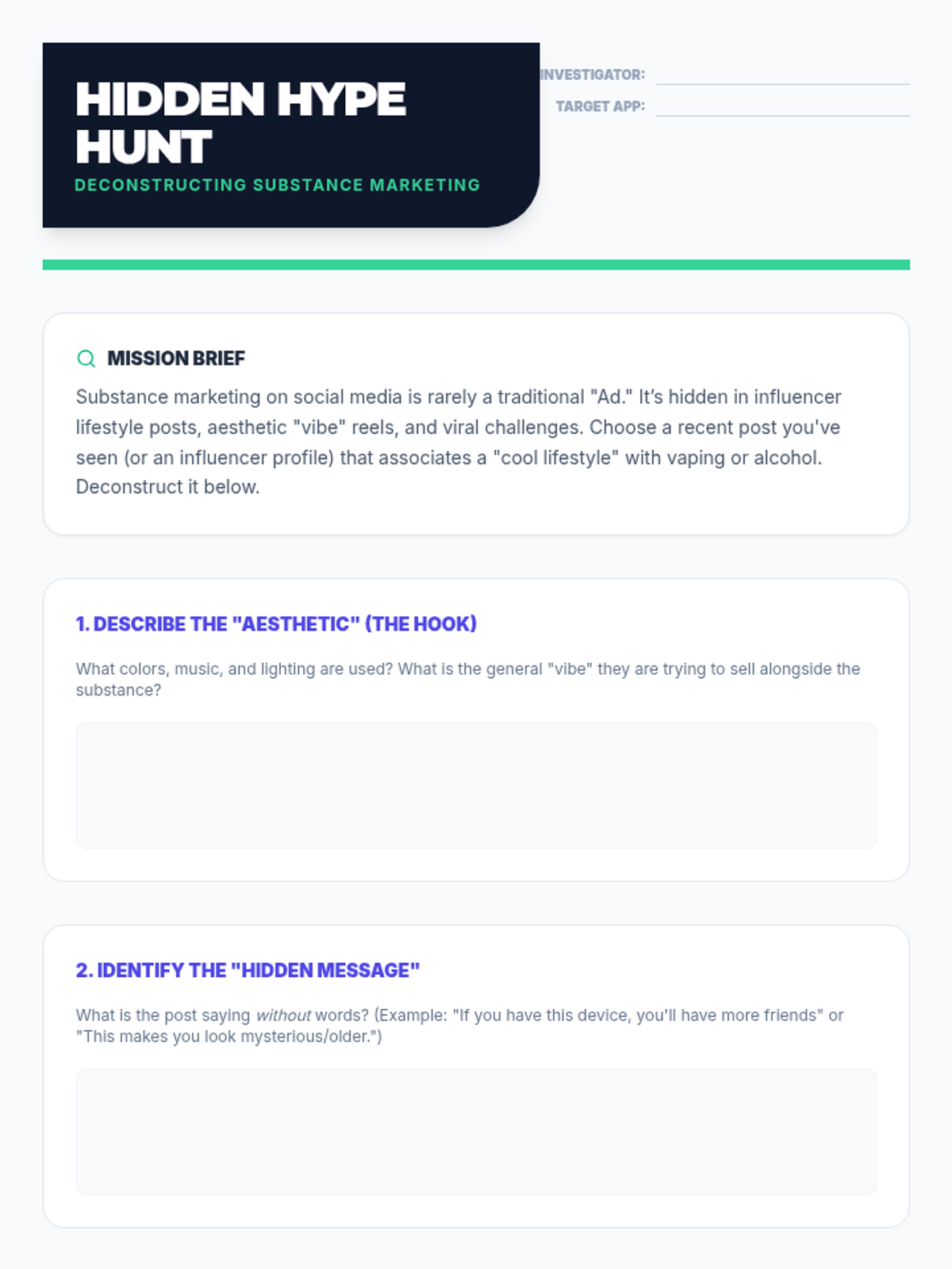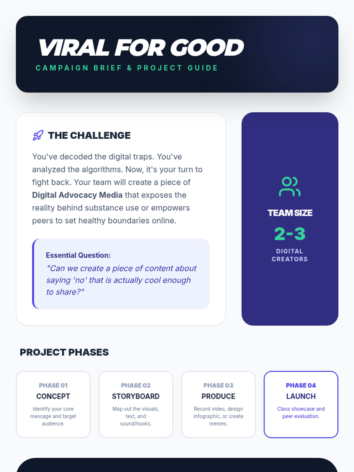 This sequence explores how social media distortions fuel peer pressure regarding substance use. Students will develop media literacy skills to decode influencer culture, analyze digital footprints, and create their own advocacy content to empower their peers.