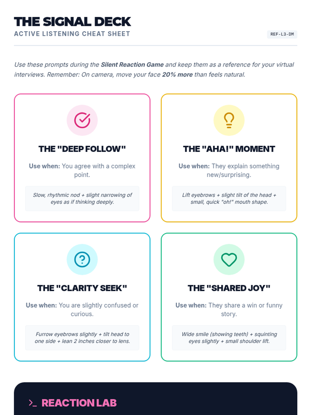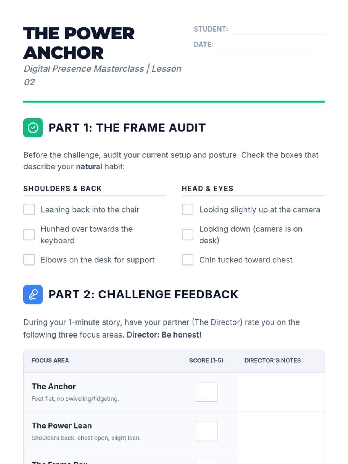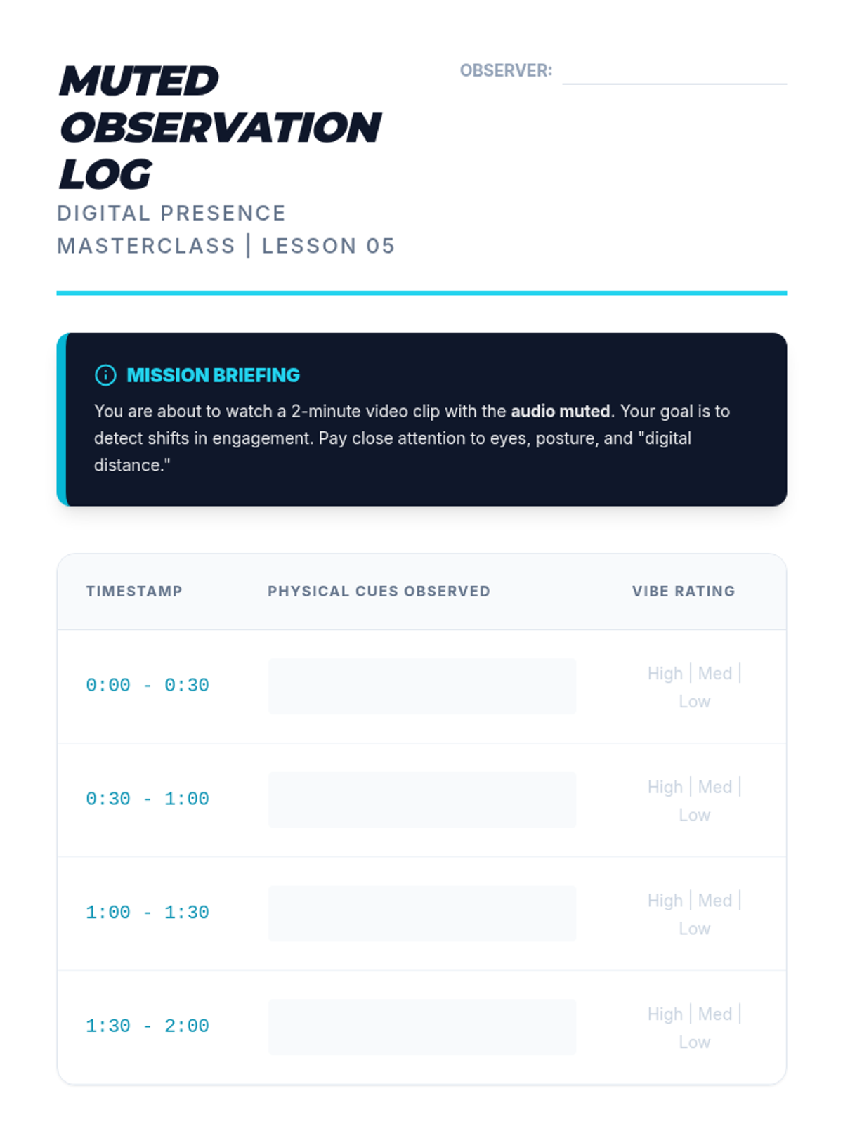 A comprehensive 8th-grade unit on mastering the nuances of non-verbal communication in virtual settings. Students learn the geometry of digital eye contact, posture within the camera frame, active listening cues without audio, and how to project a professional image through dress and social awareness in digital formats.