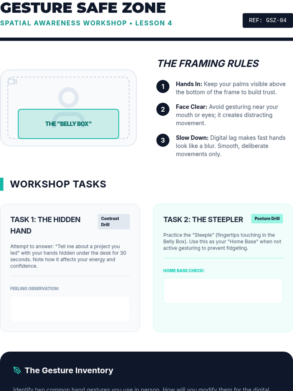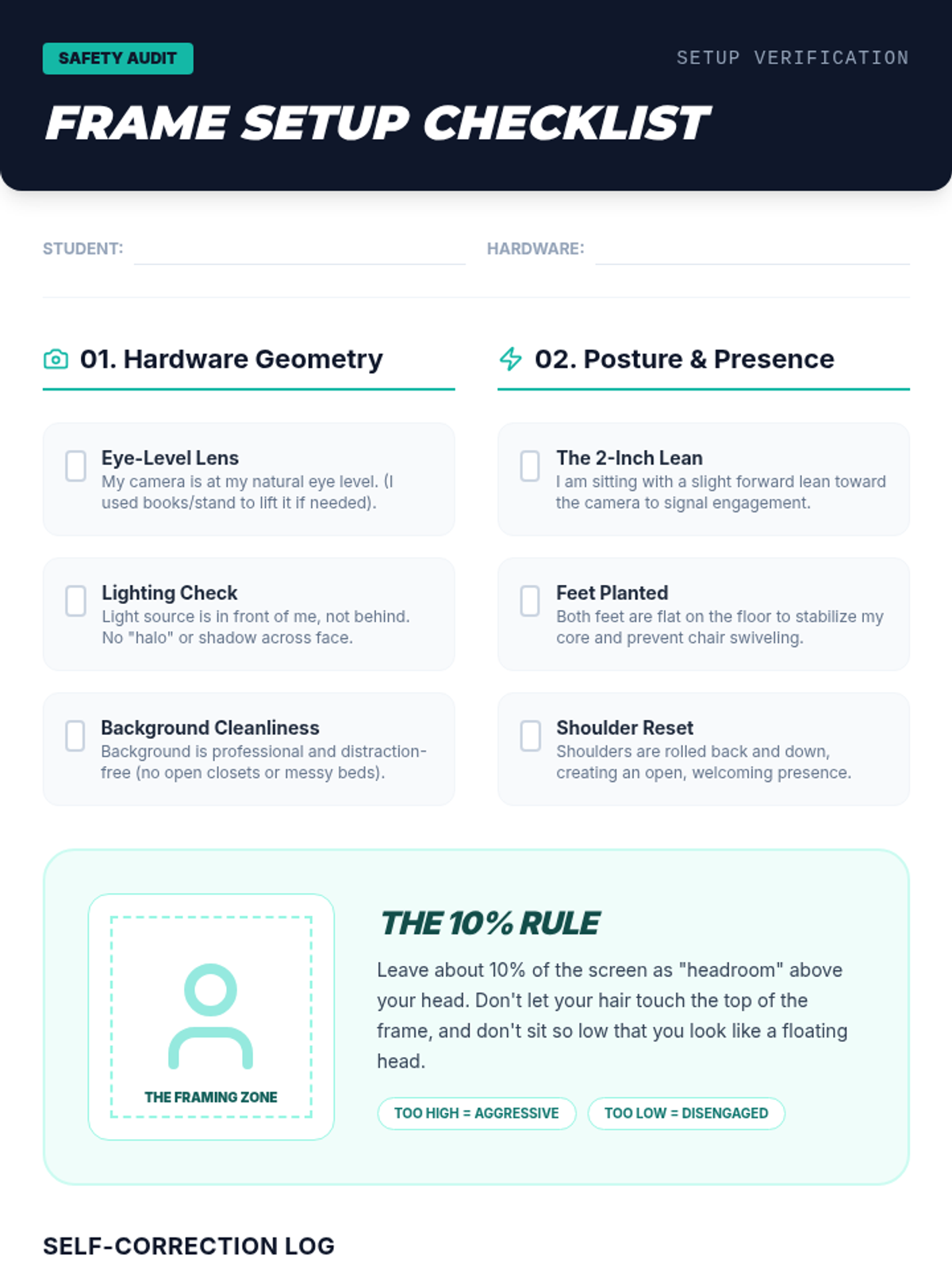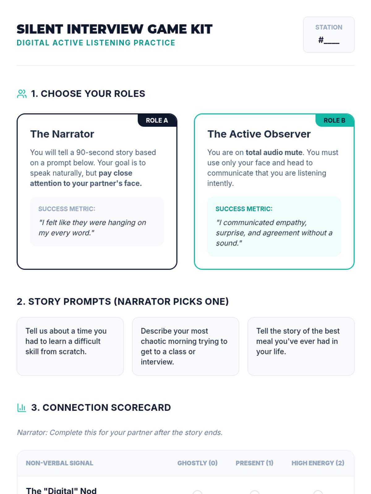 This sequence helps undergraduate students bridge the gap between in-person and digital communication. It focuses on adapting non-verbal cues—eye contact, active listening, posture, and gestures—specifically for the 2D constraints of a video call to build trust and professional warmth.