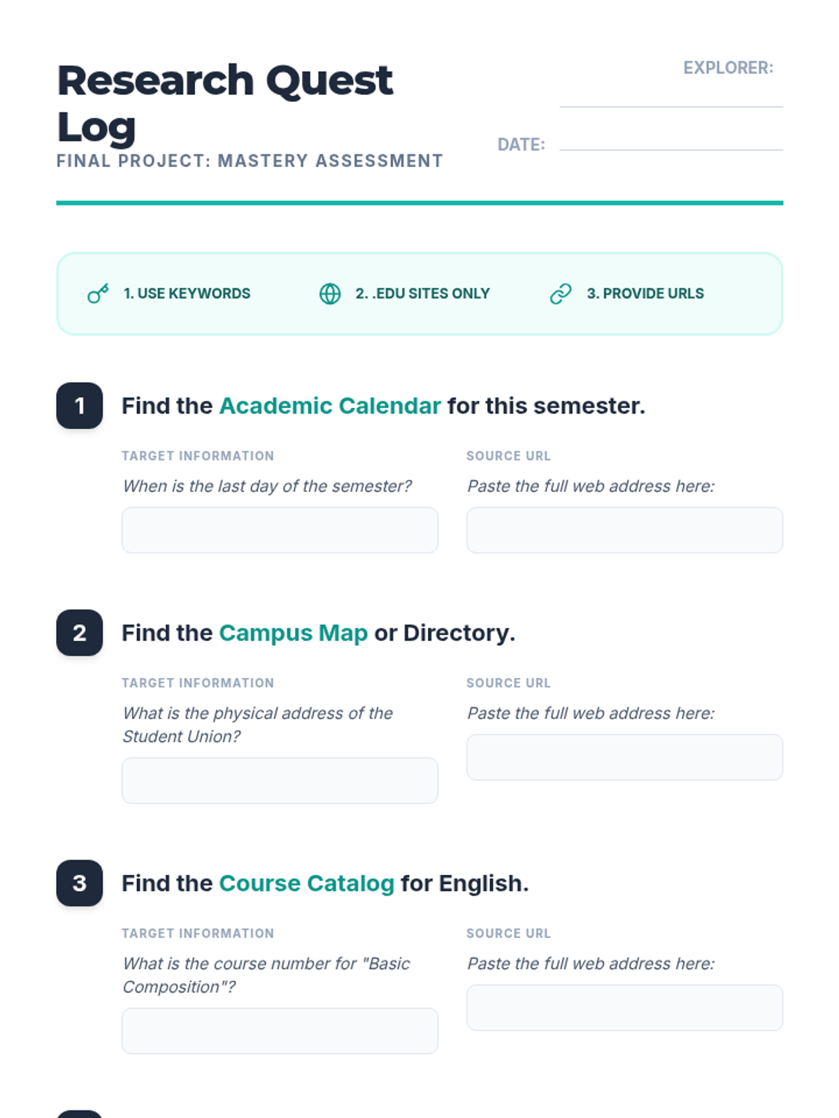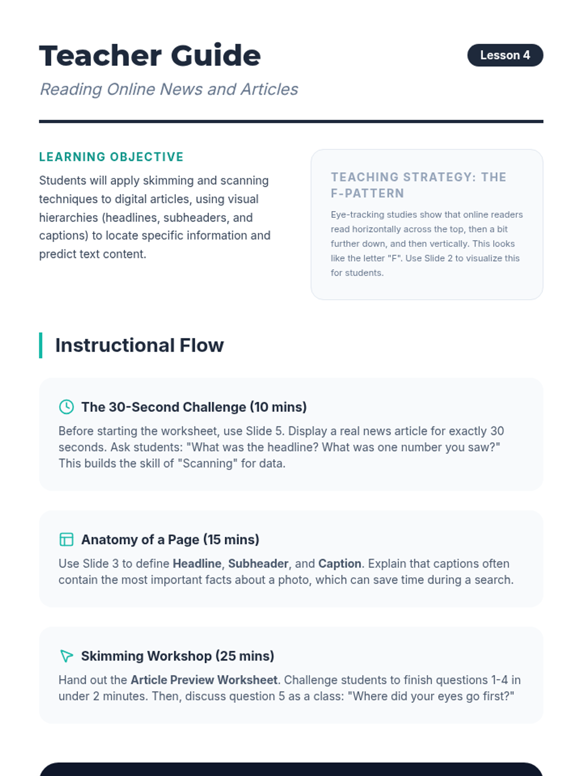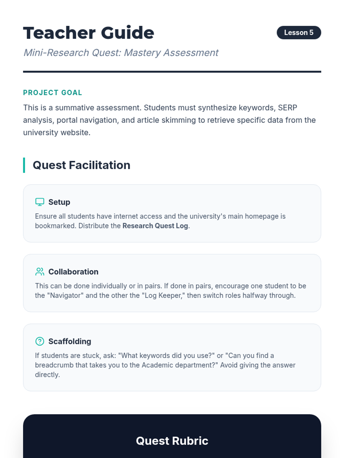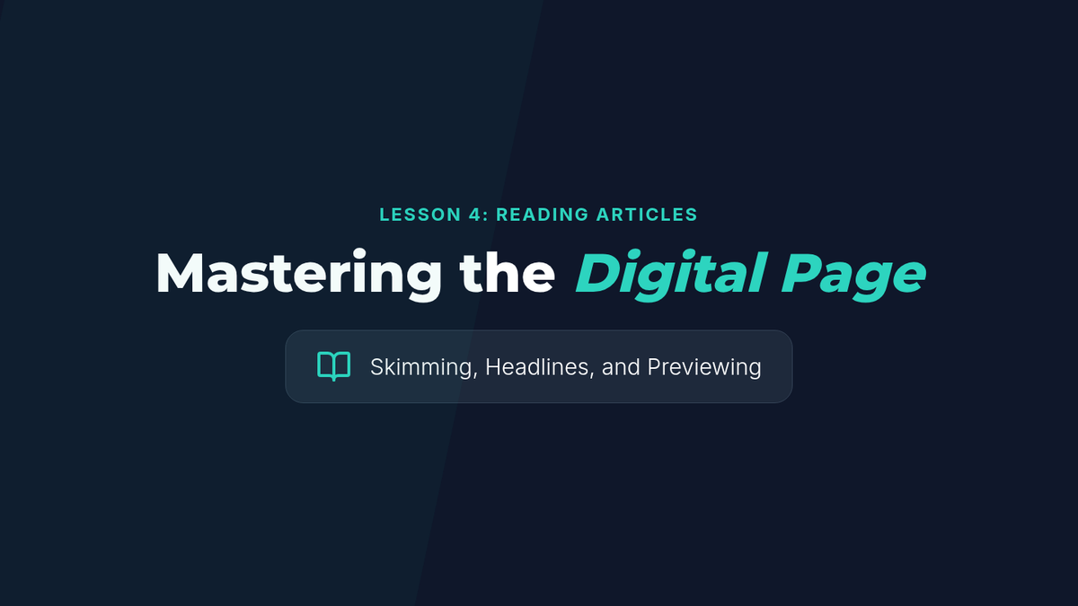 A 5-lesson sequence designed for undergraduate ELL students to develop essential digital literacy and reading skills. Students learn to formulate search queries, analyze search engine results, navigate university portals, and preview online articles, culminating in a digital research scavenger hunt.