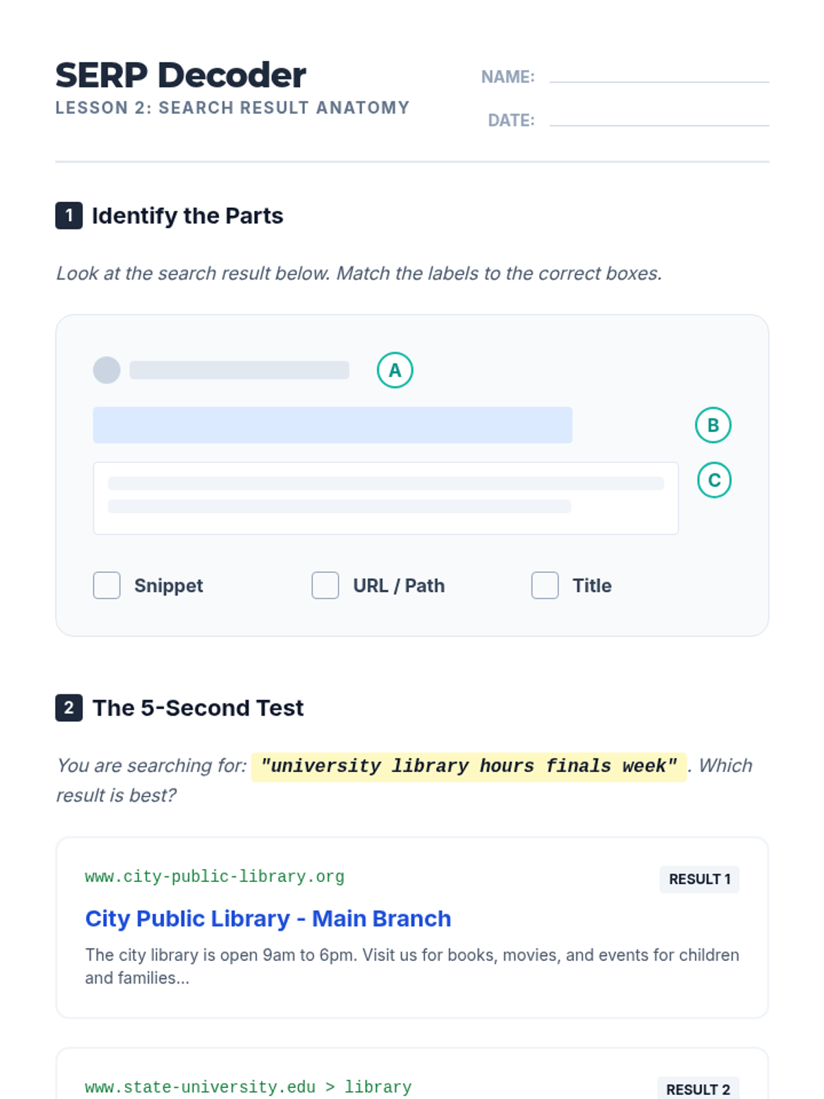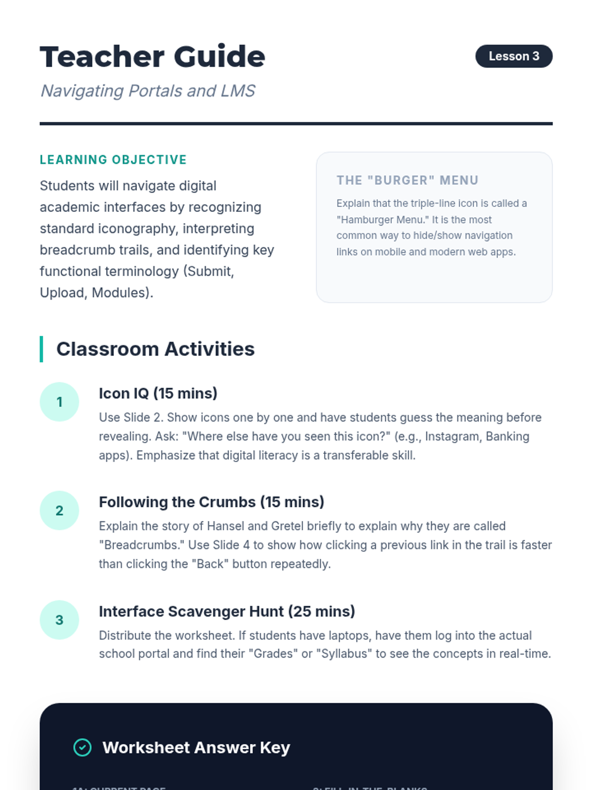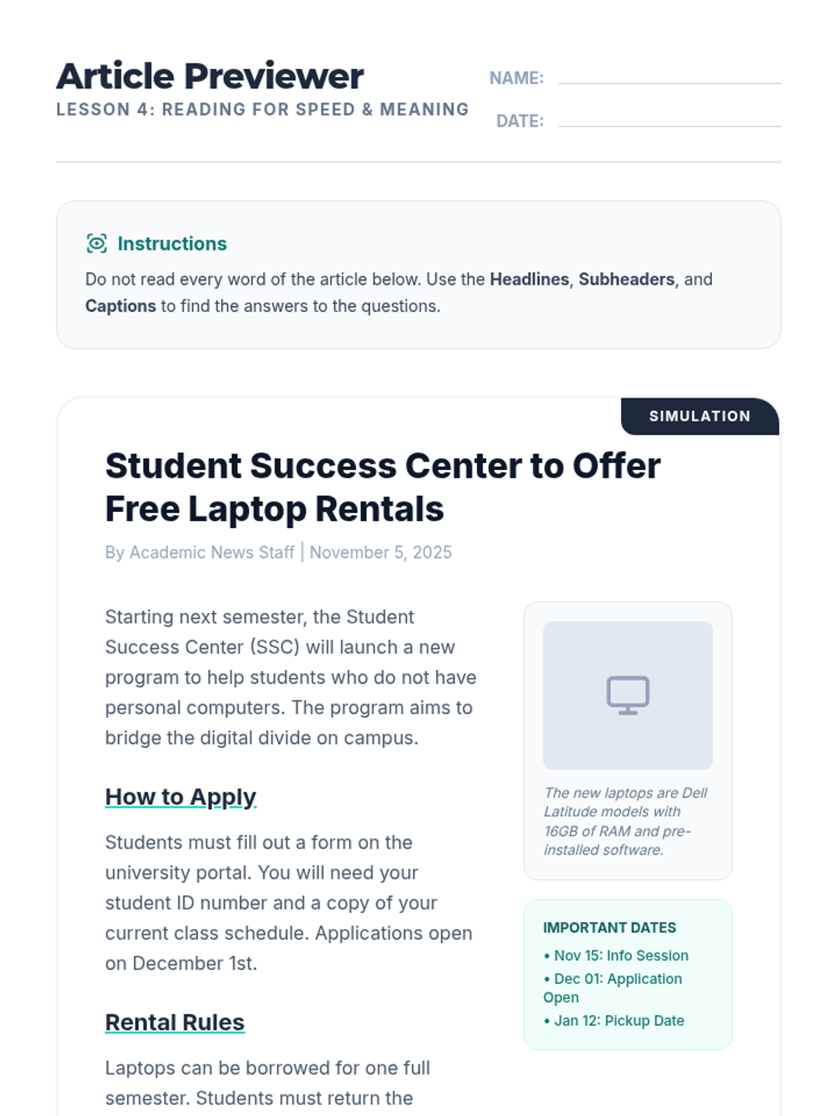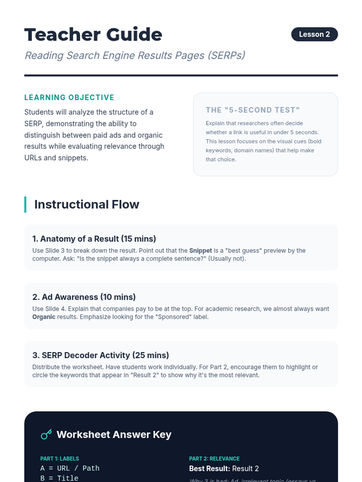 A 5-lesson sequence designed for undergraduate ELL students to develop essential digital literacy and reading skills. Students learn to formulate search queries, analyze search engine results, navigate university portals, and preview online articles, culminating in a digital research scavenger hunt.