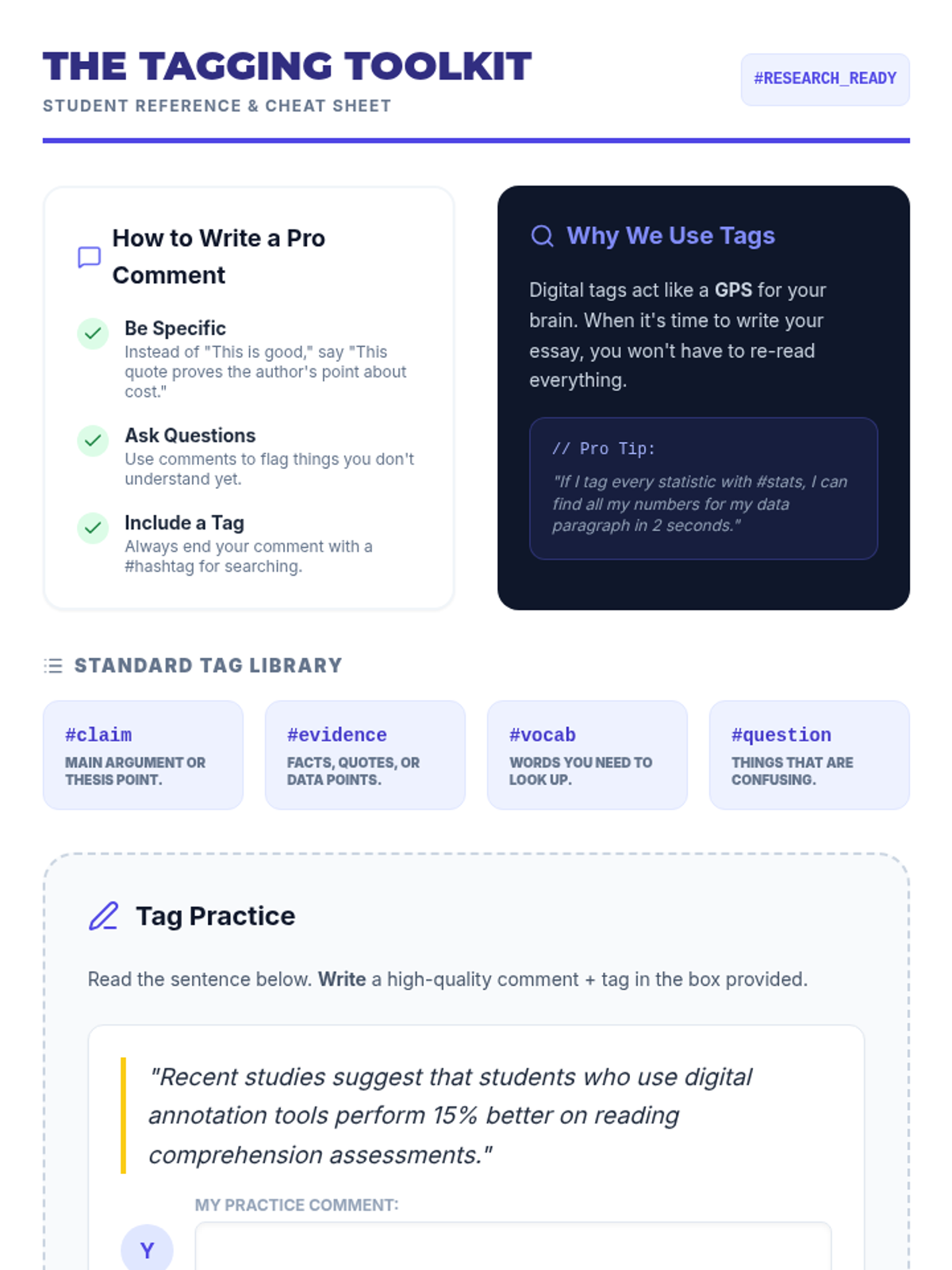 This sequence teaches 10th-grade students with academic support needs how to master digital annotation tools. It covers highlighting, tagging, collaborative commenting, and synthesizing digital notes into a research portfolio.