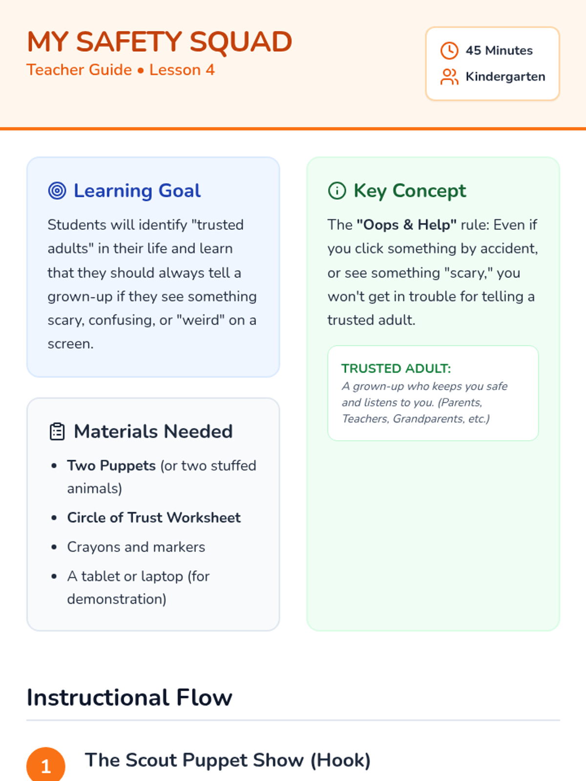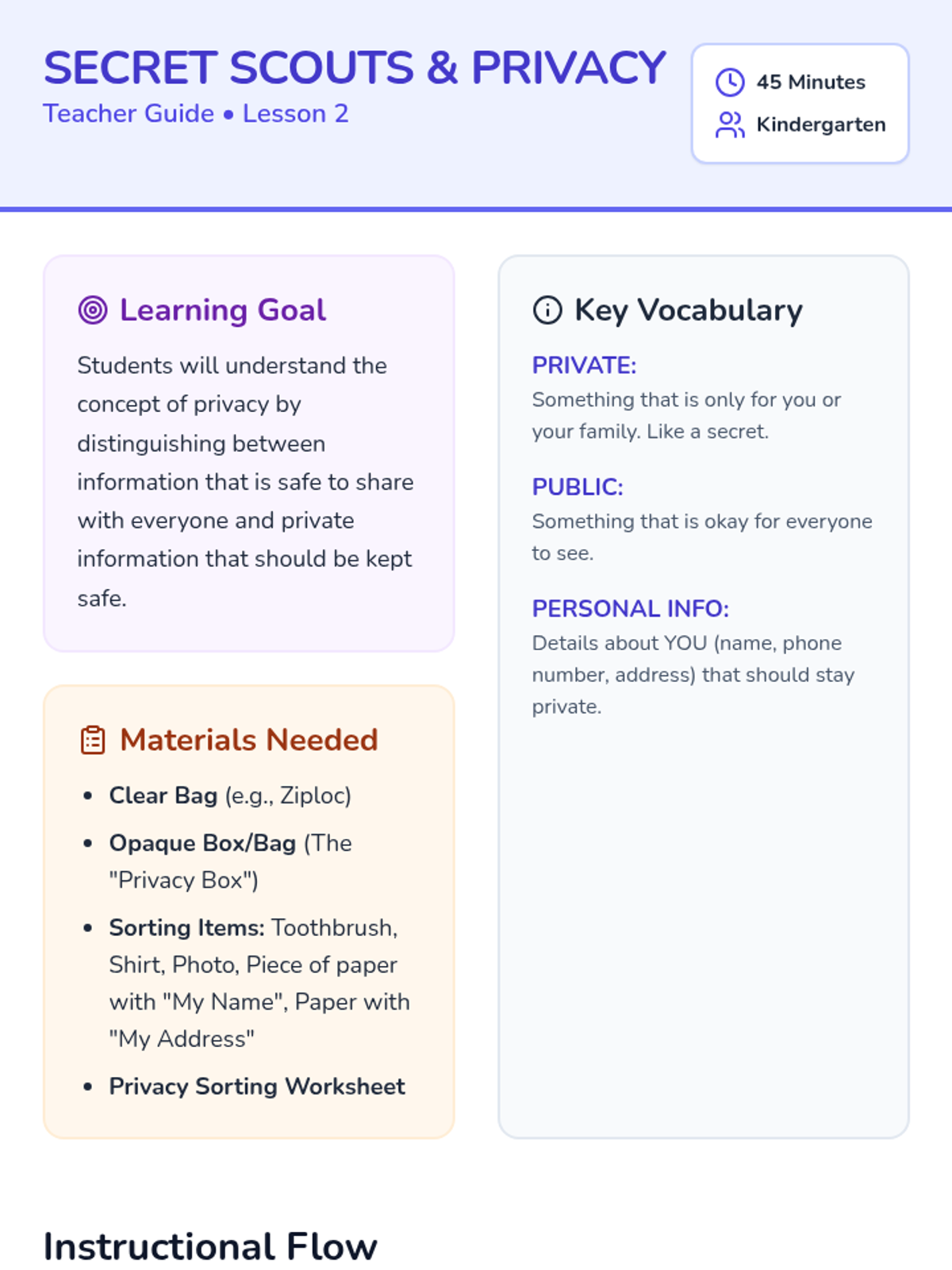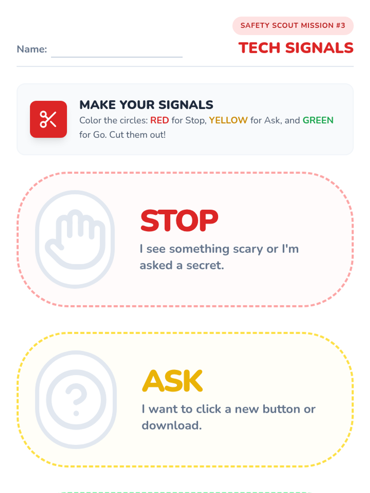 A foundational sequence for Kindergarten students exploring digital safety, privacy, and responsible device use through a 'Safety Scout' lens. Students learn to identify devices, distinguish between public and private information, practice seeking permission, and balance screen time with physical activity.