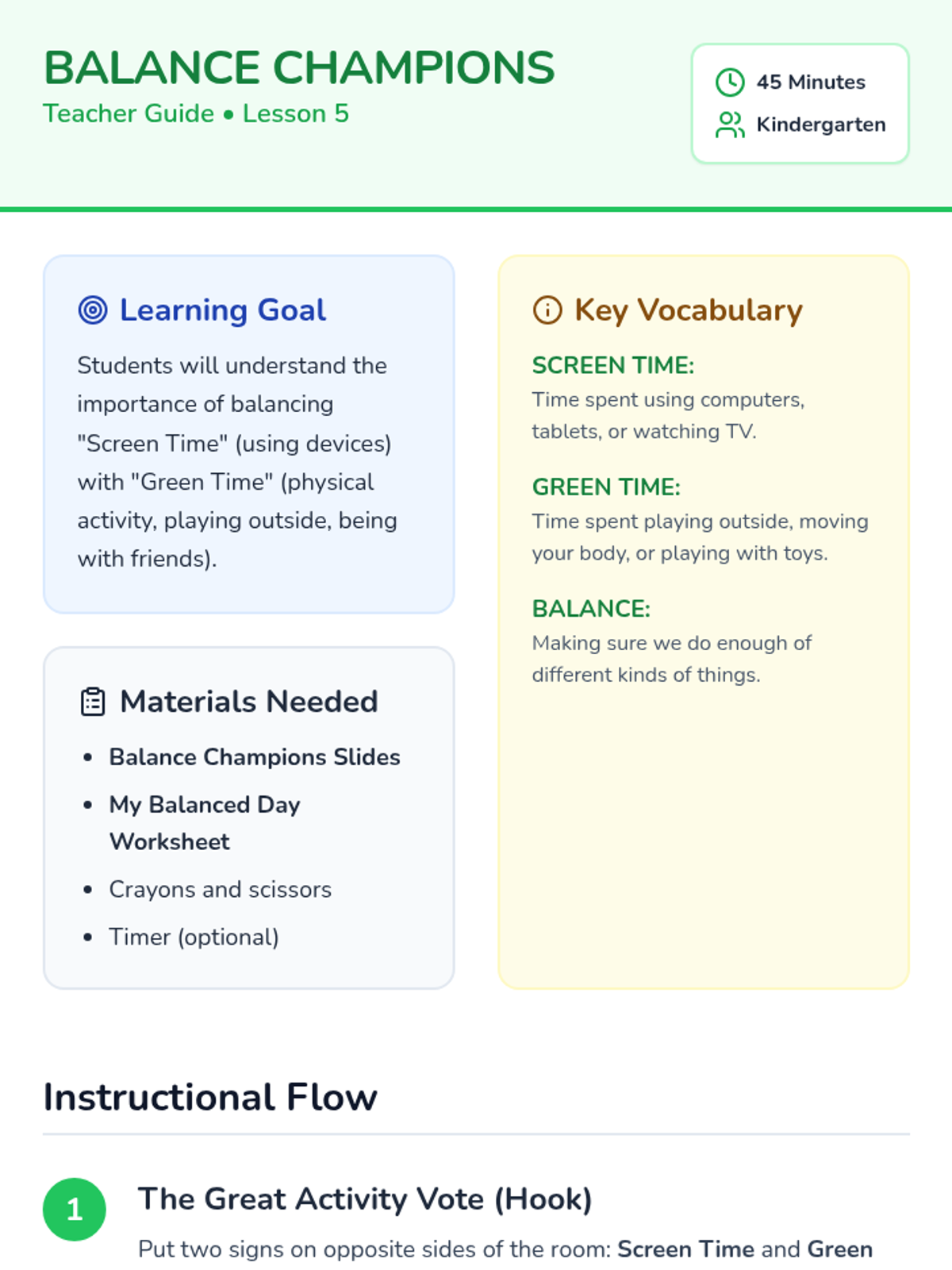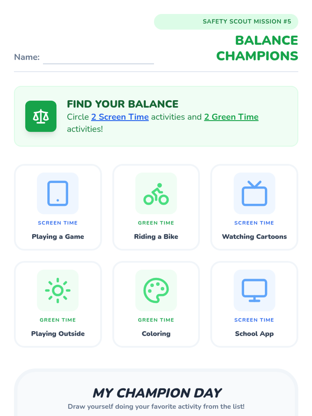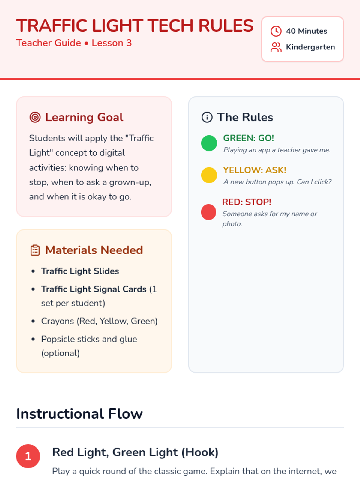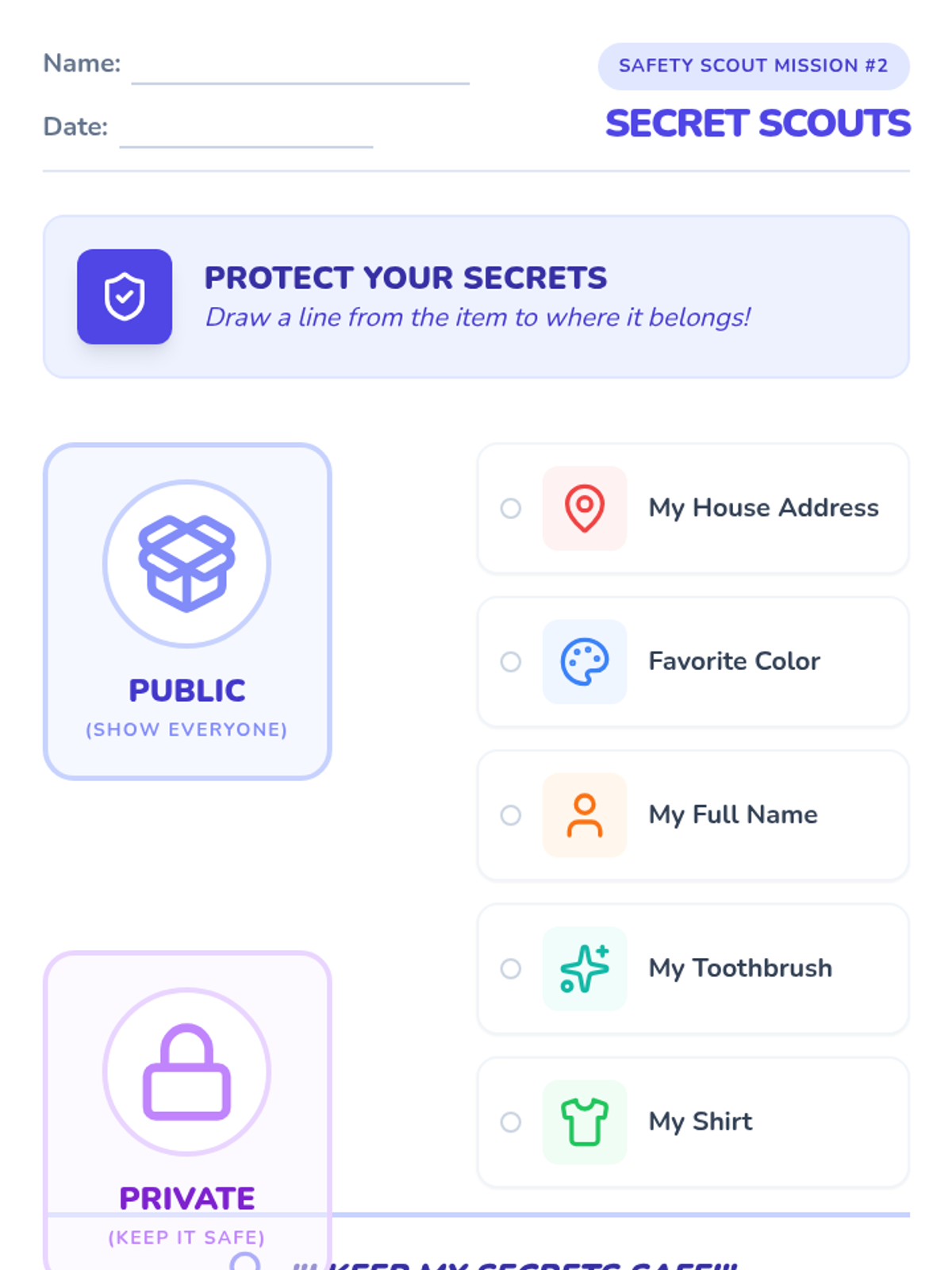 A foundational sequence for Kindergarten students exploring digital safety, privacy, and responsible device use through a 'Safety Scout' lens. Students learn to identify devices, distinguish between public and private information, practice seeking permission, and balance screen time with physical activity.