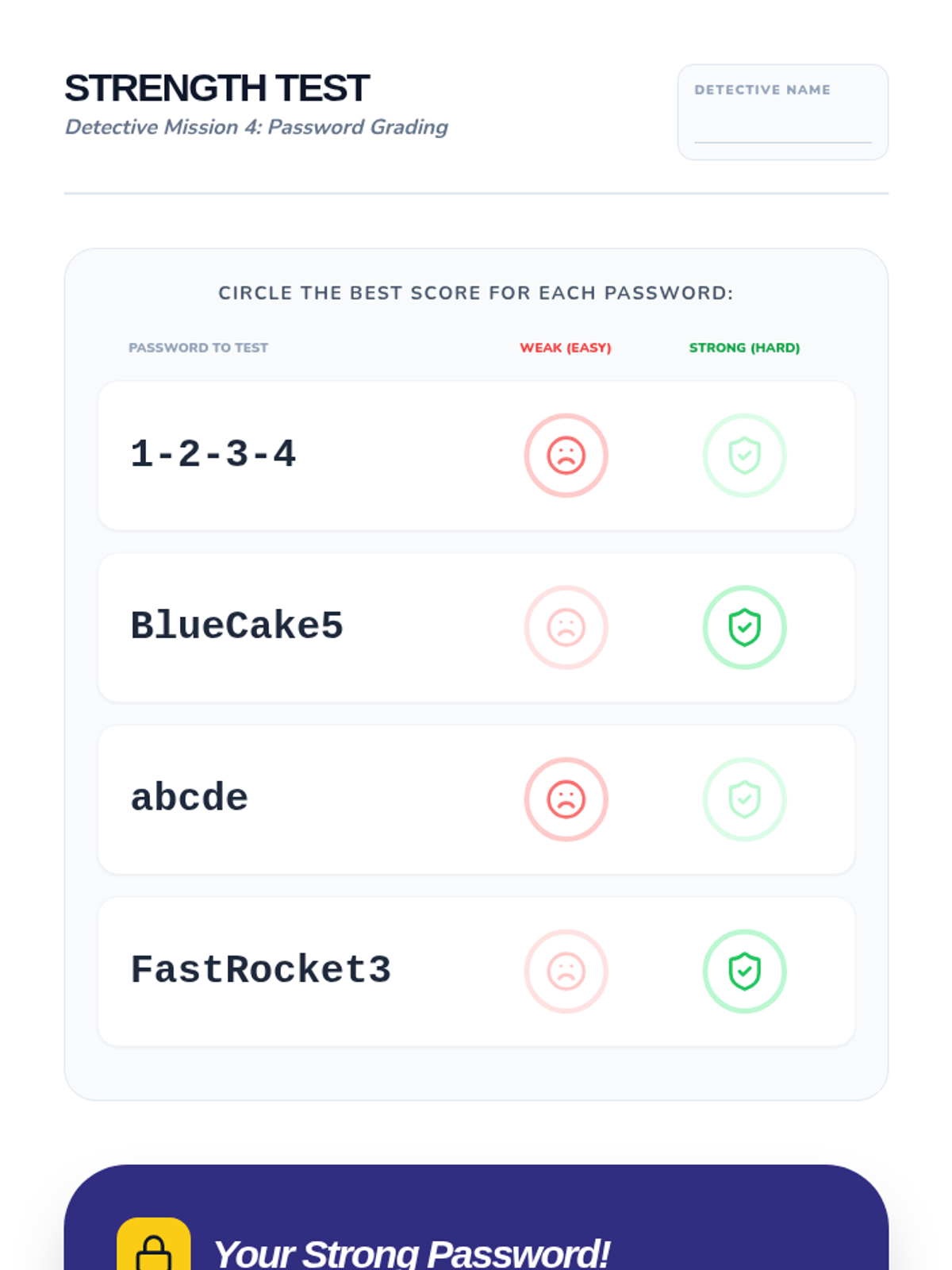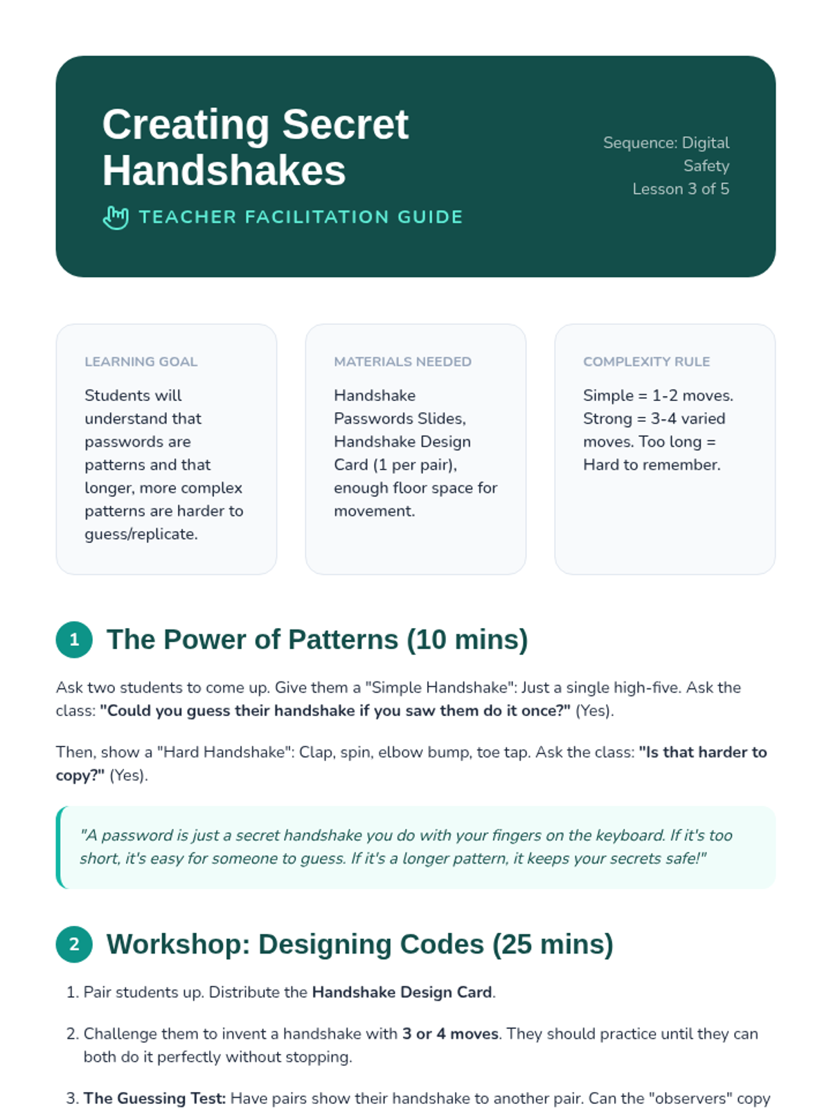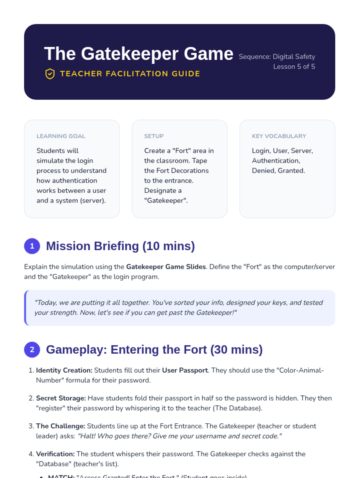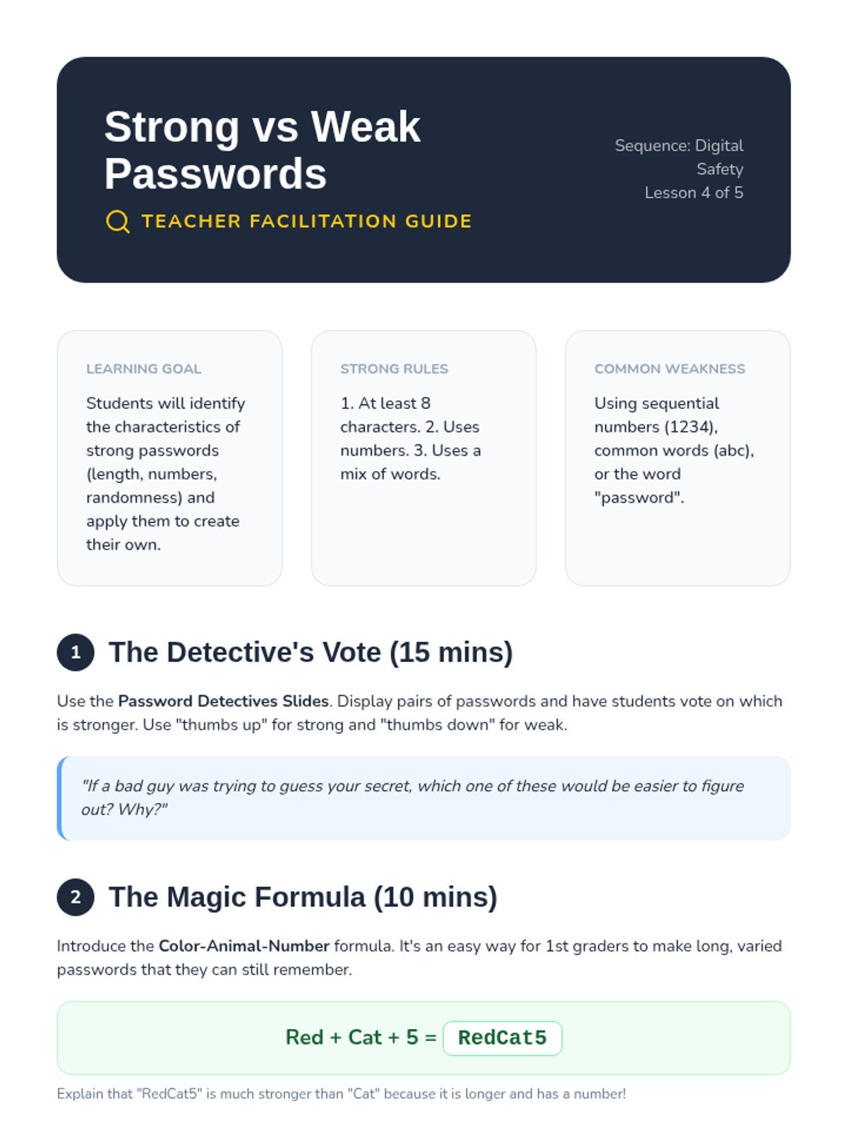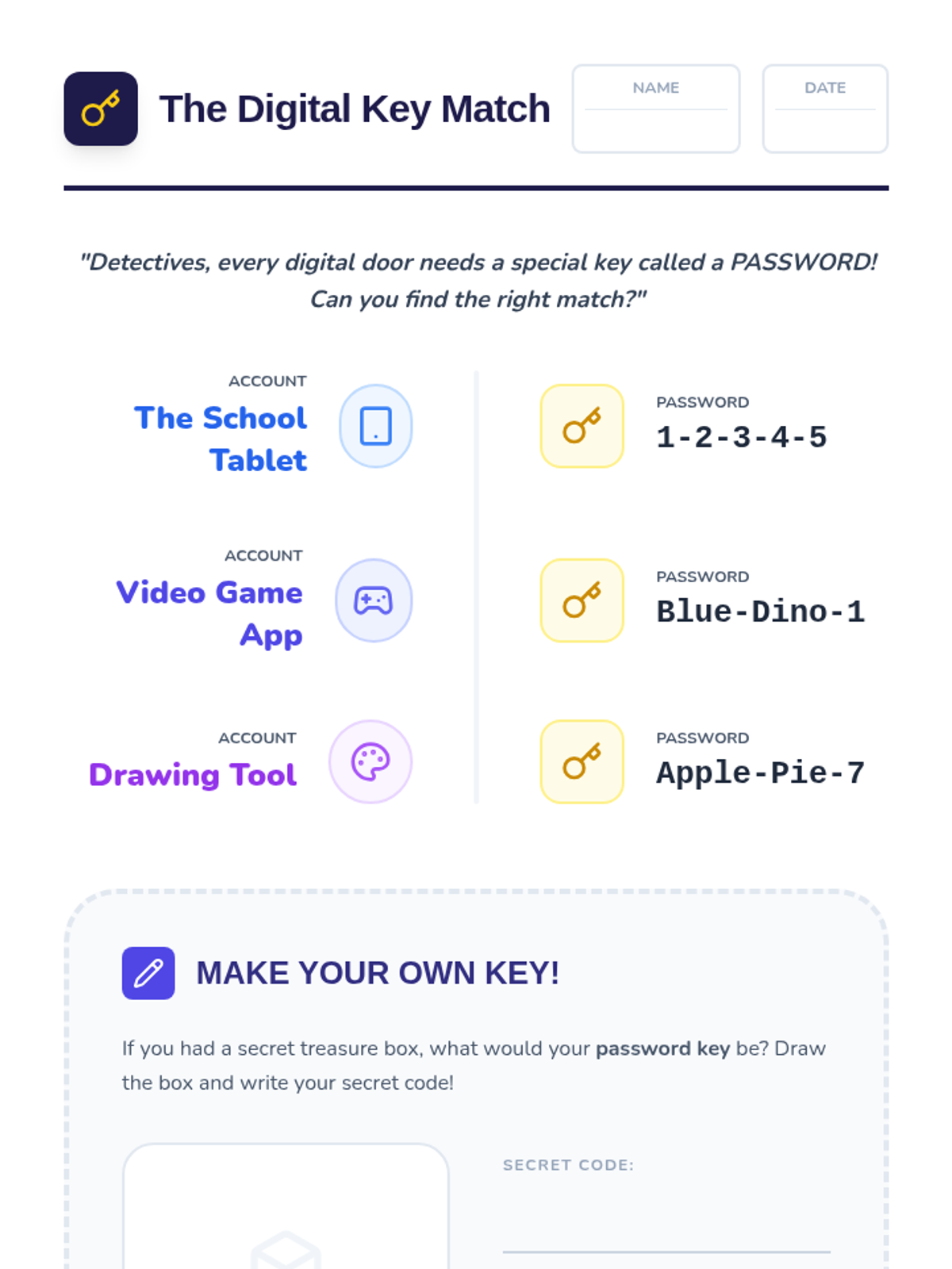 A 1st-grade sequence exploring digital safety through the metaphor of locks and keys. Students learn to distinguish between public and private information, create strong passwords, and understand the login process through role-play and games.