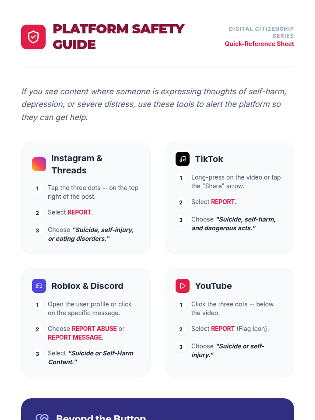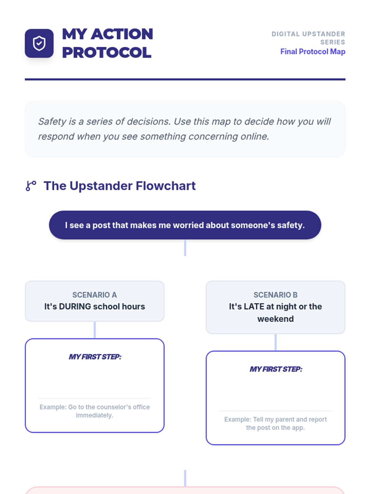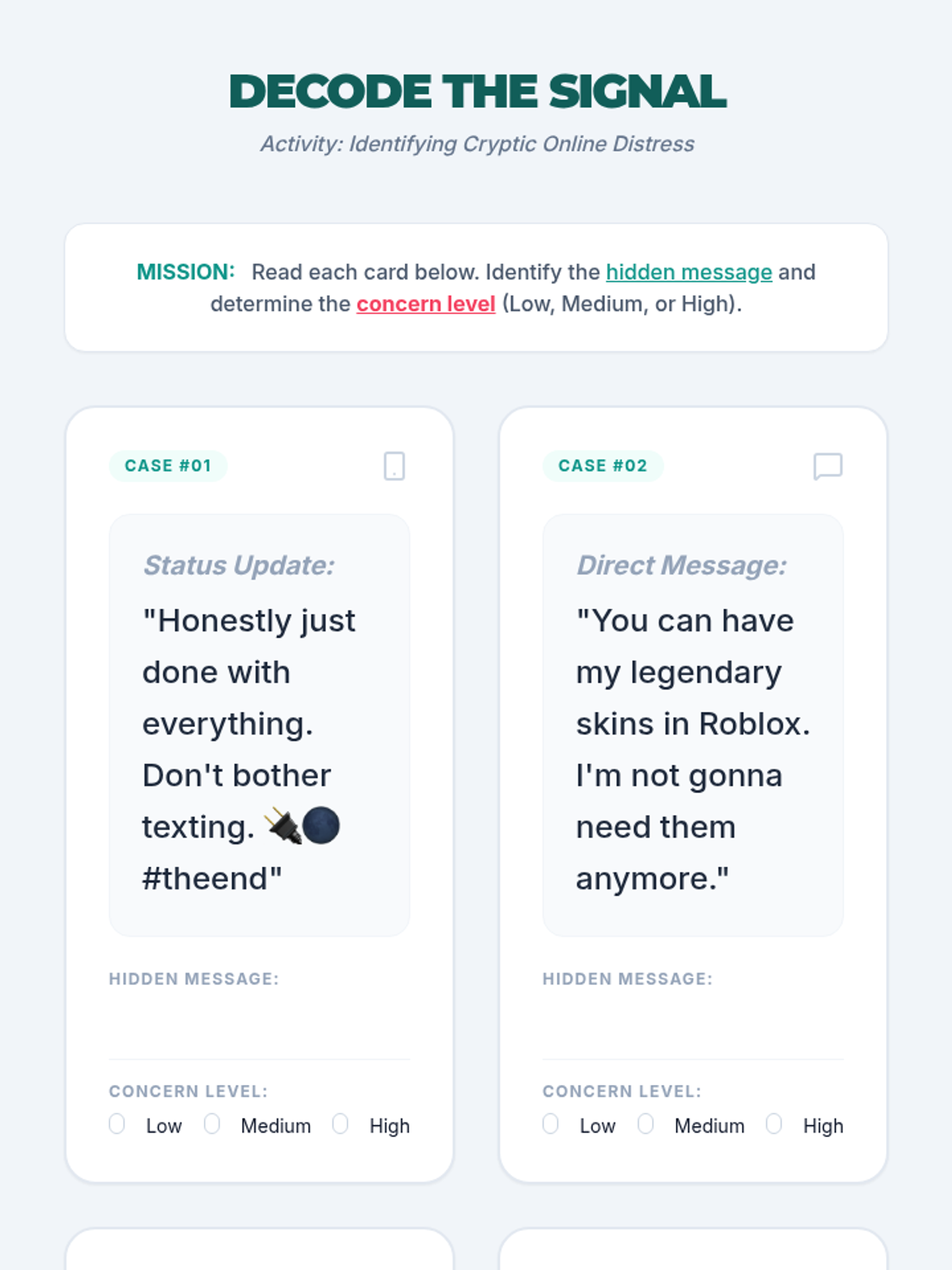 A comprehensive unit for 6th graders on identifying signs of mental health distress in online spaces, understanding the impact of cyberbullying, and learning how to report safety concerns on digital platforms.