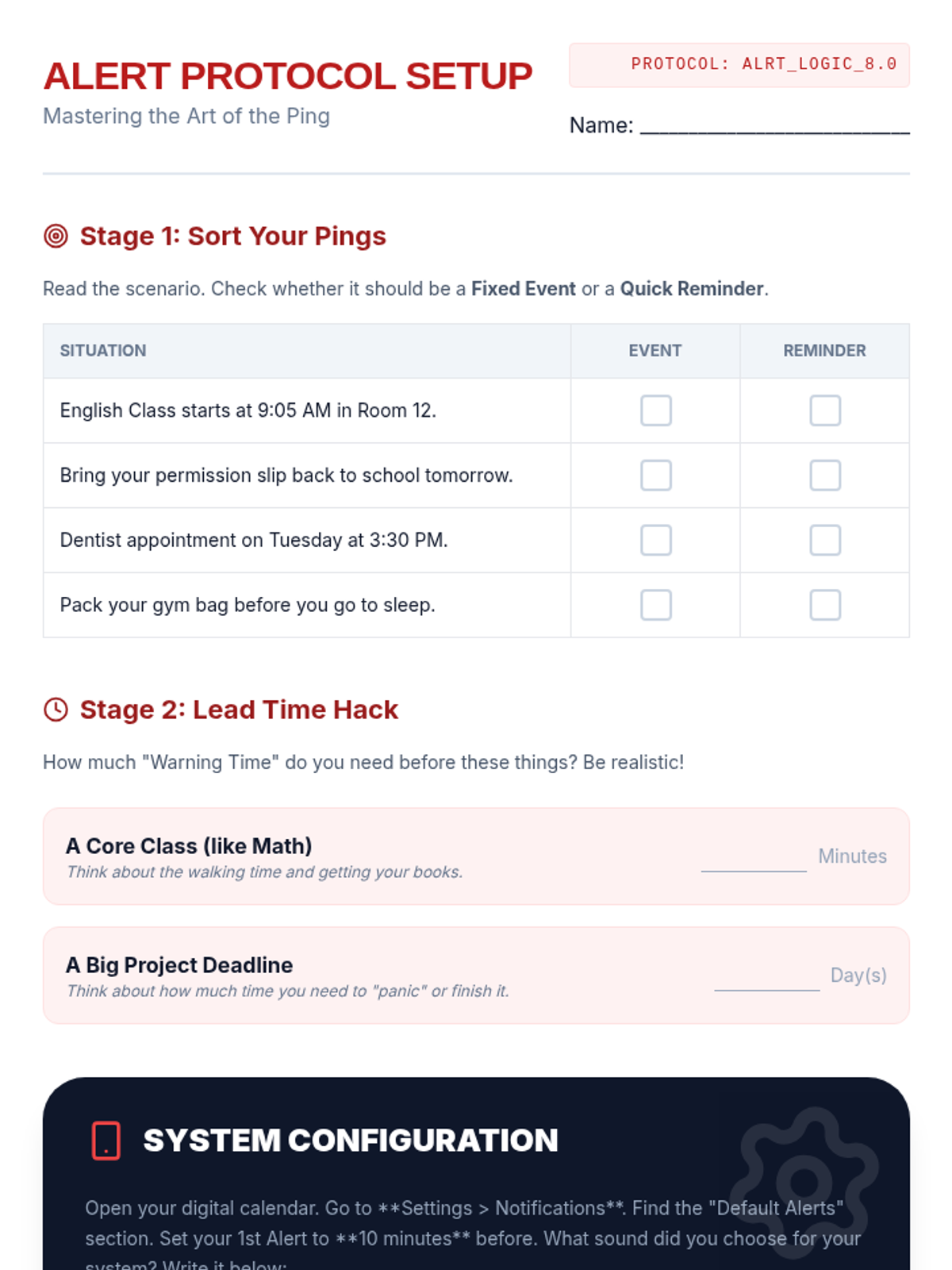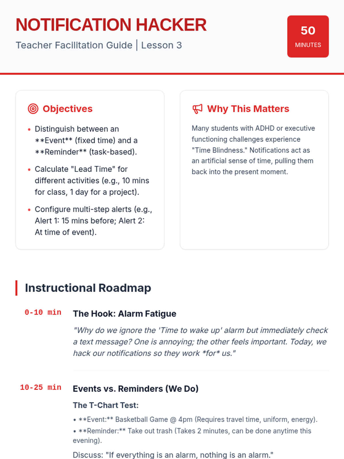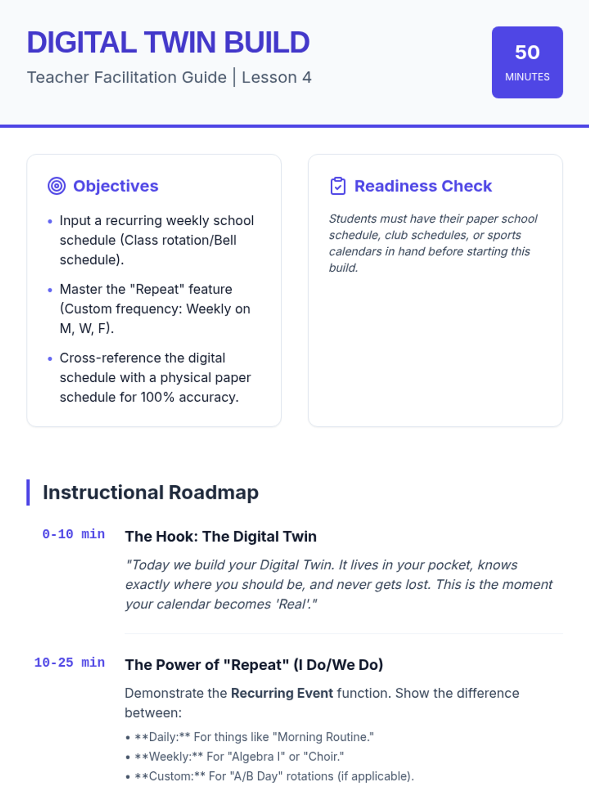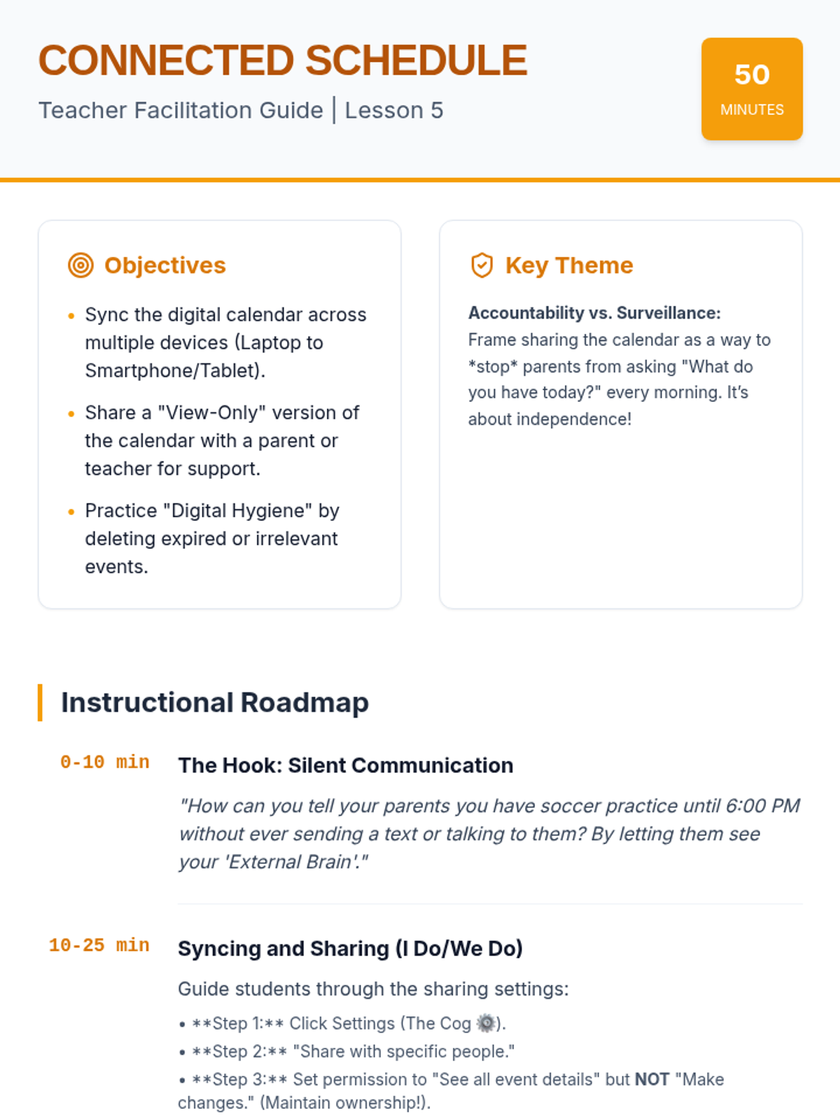 A sequence for 8th grade students to transition from physical to digital scheduling tools, focusing on calendars, reminders, and notifications. Students learn to use technology as an 'external brain' to manage their academic and personal lives.