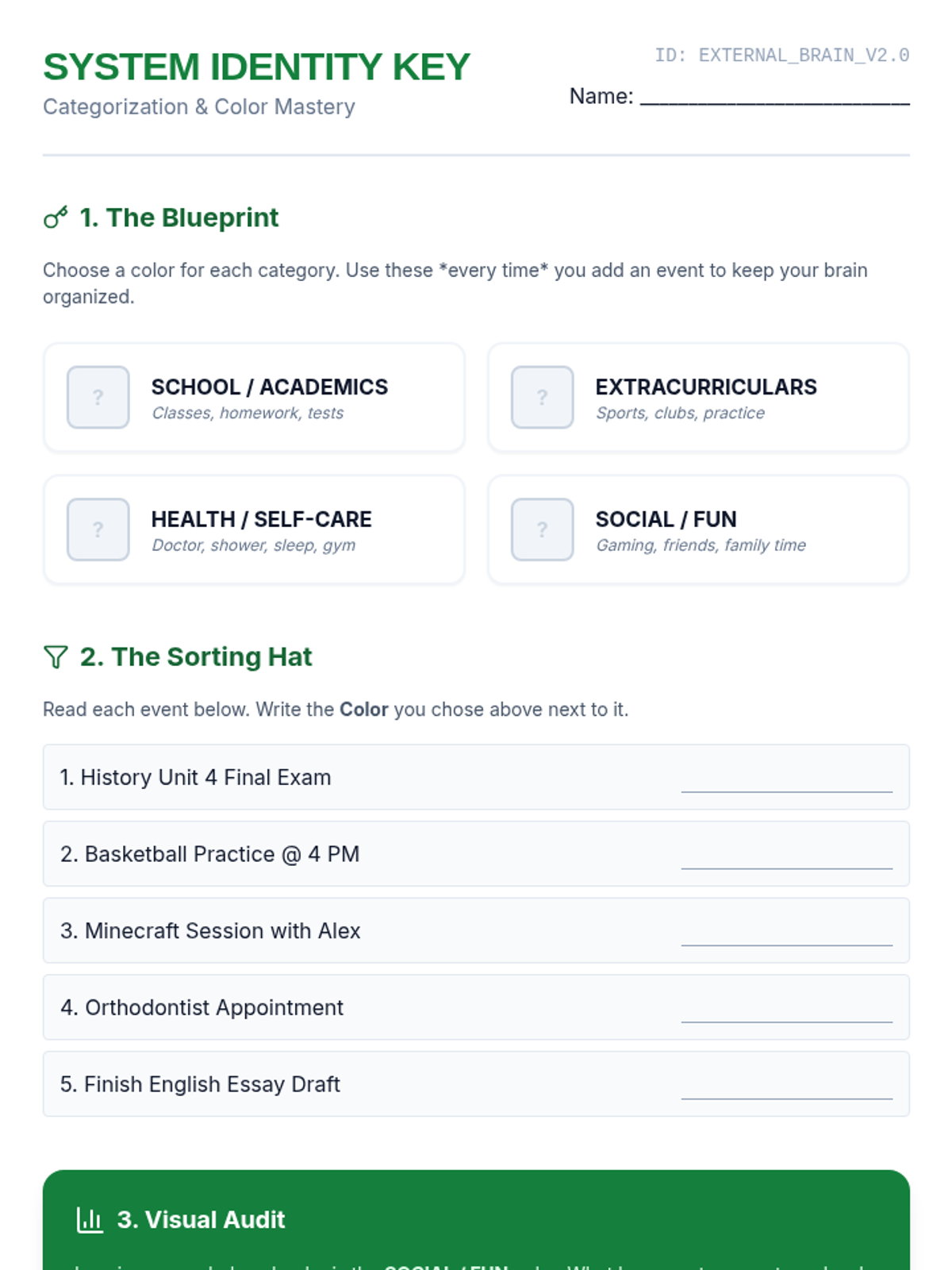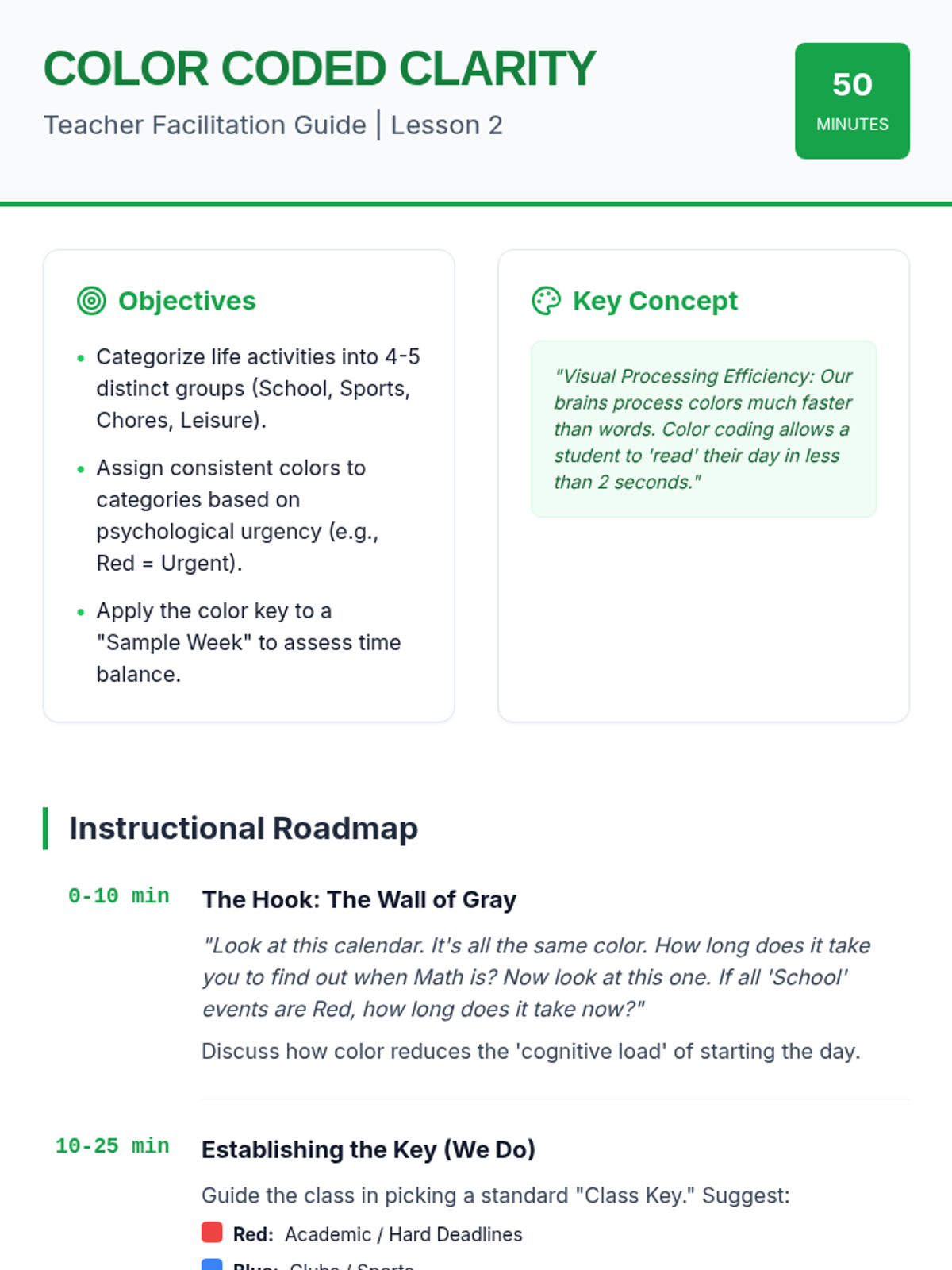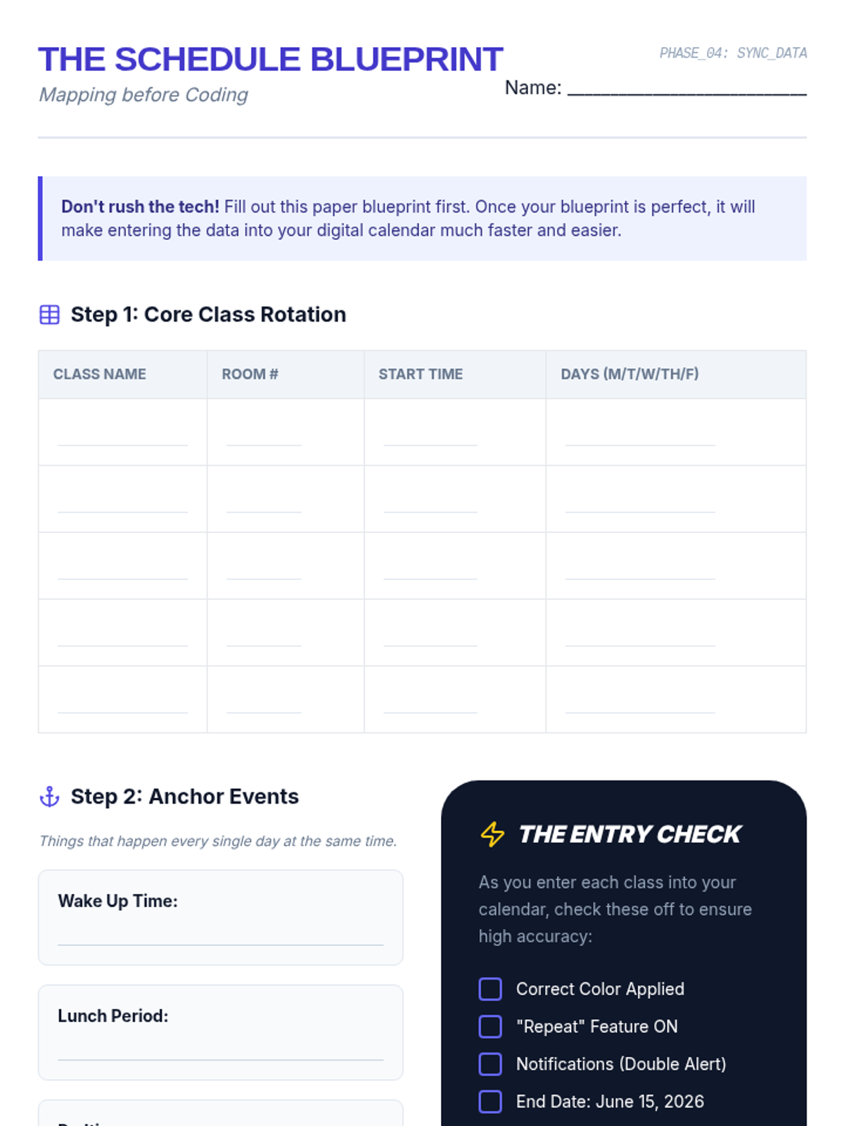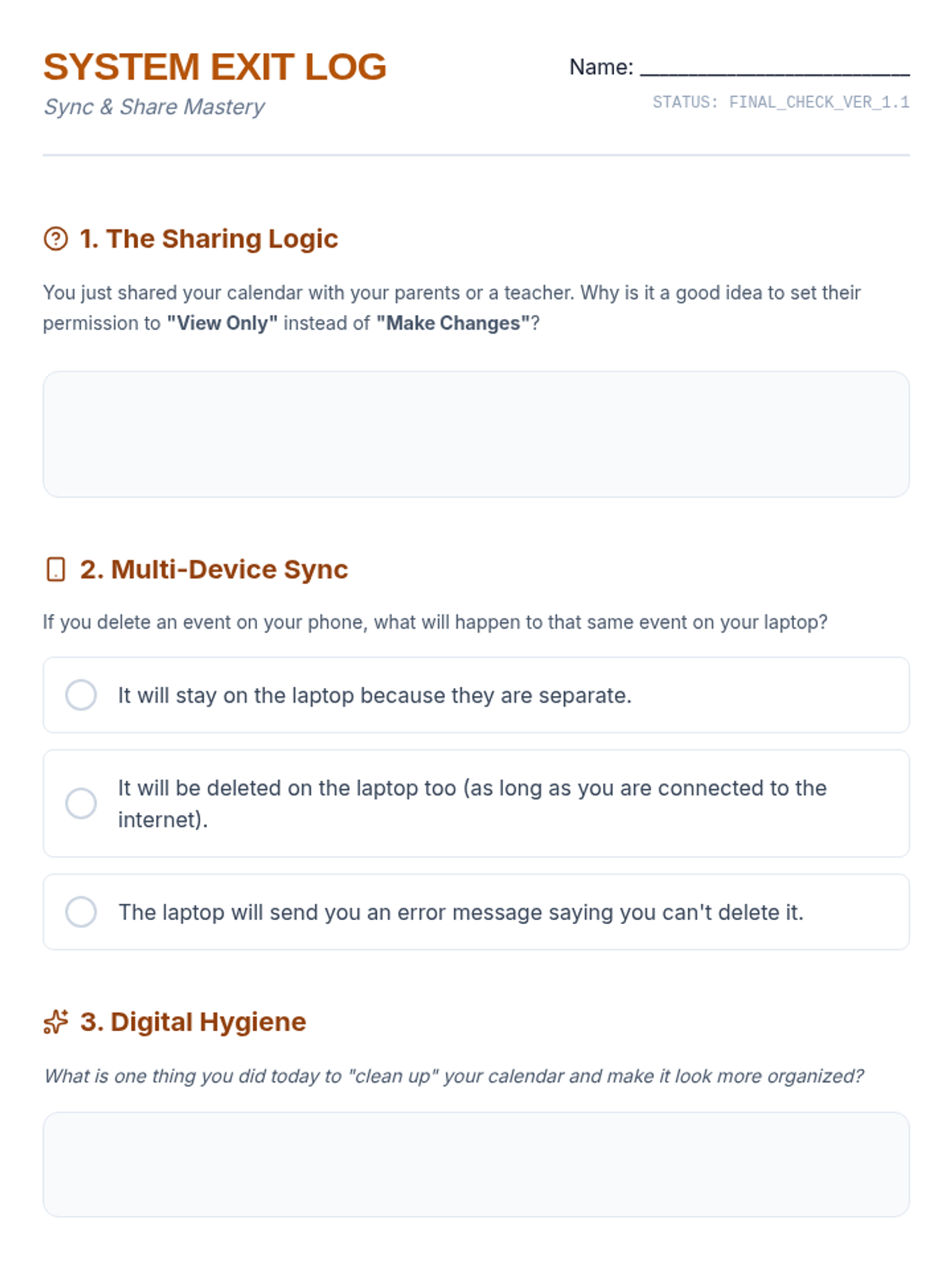 A sequence for 8th grade students to transition from physical to digital scheduling tools, focusing on calendars, reminders, and notifications. Students learn to use technology as an 'external brain' to manage their academic and personal lives.