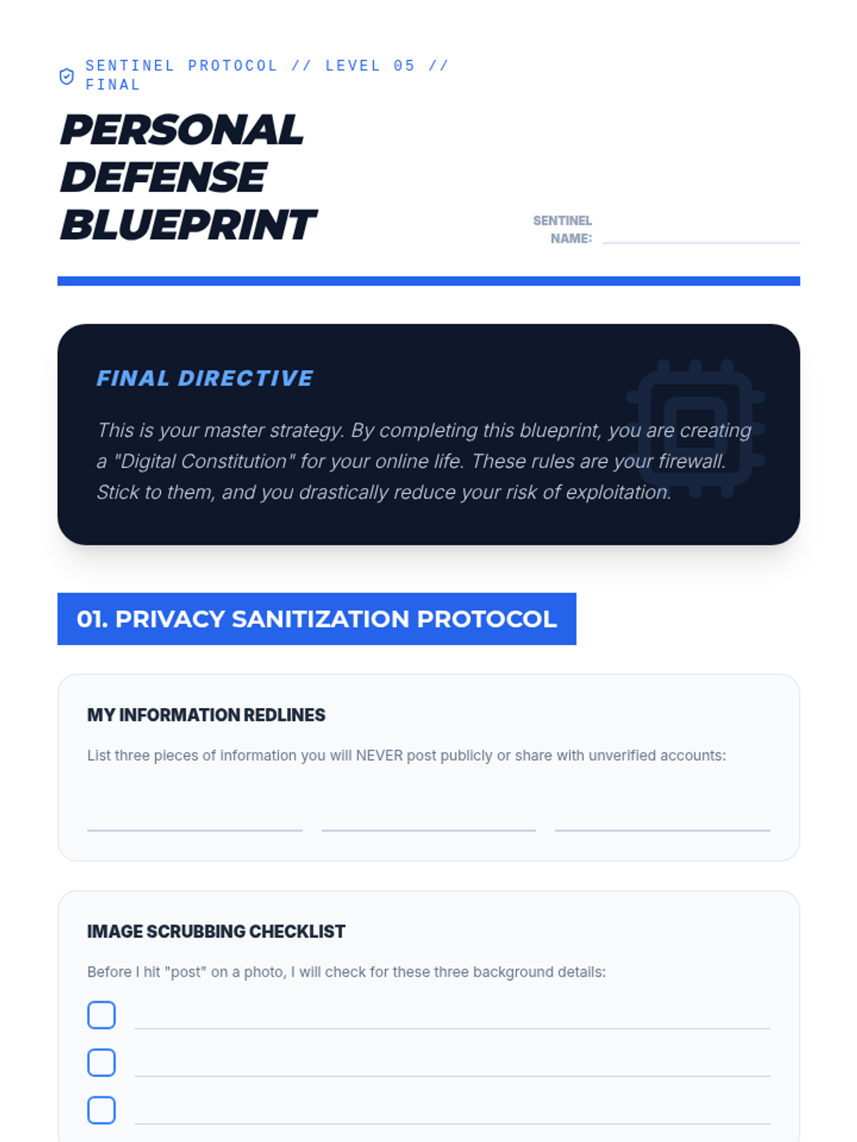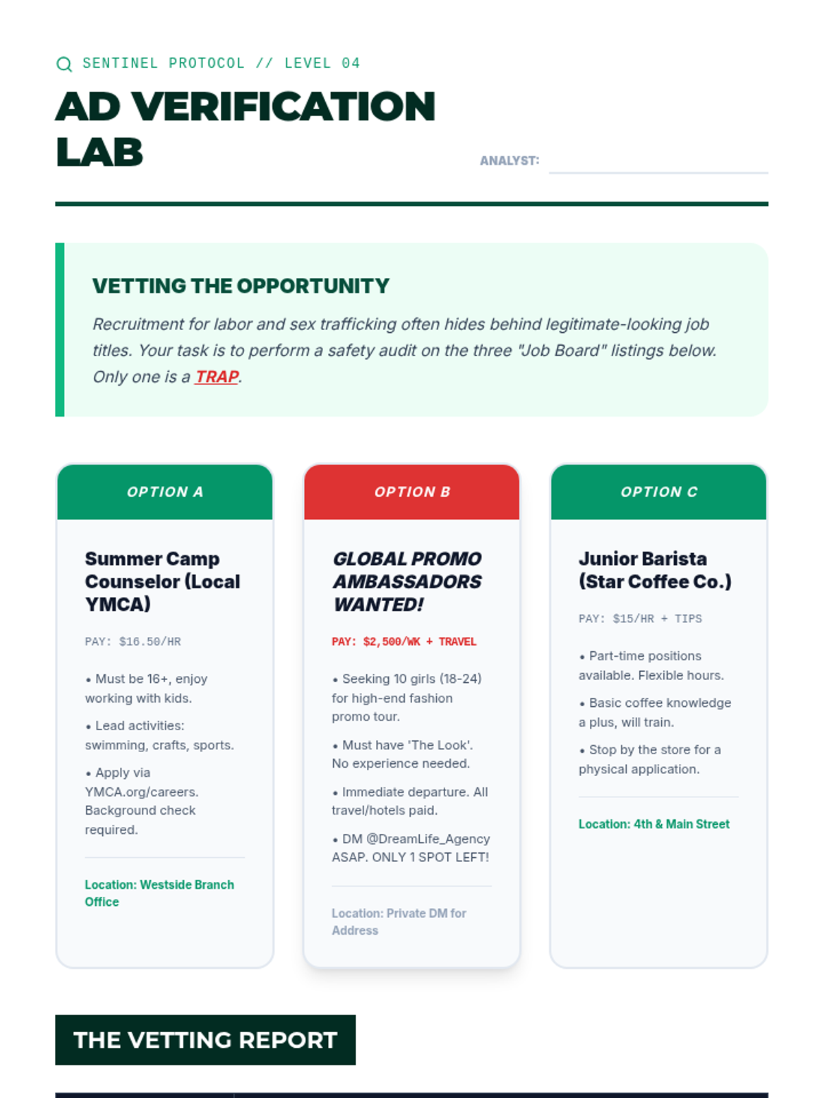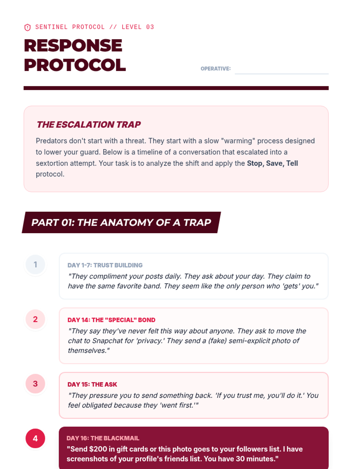 A 9th-grade Health & Physical Education sequence focused on identifying and mitigating online risks related to human trafficking, specifically targeting digital footprints, catfishing, sextortion, and scam advertisements.