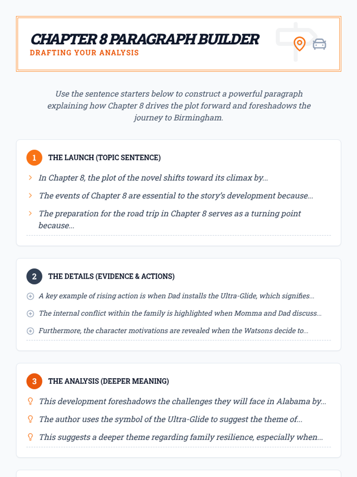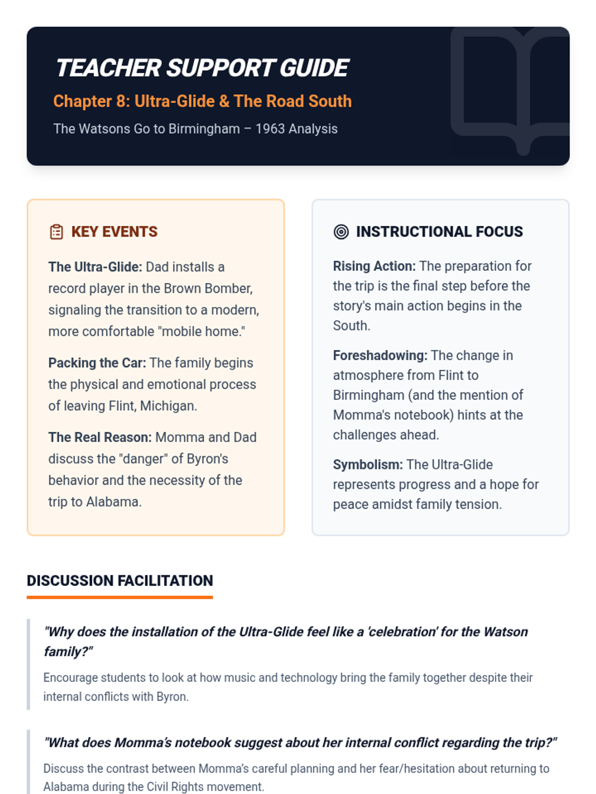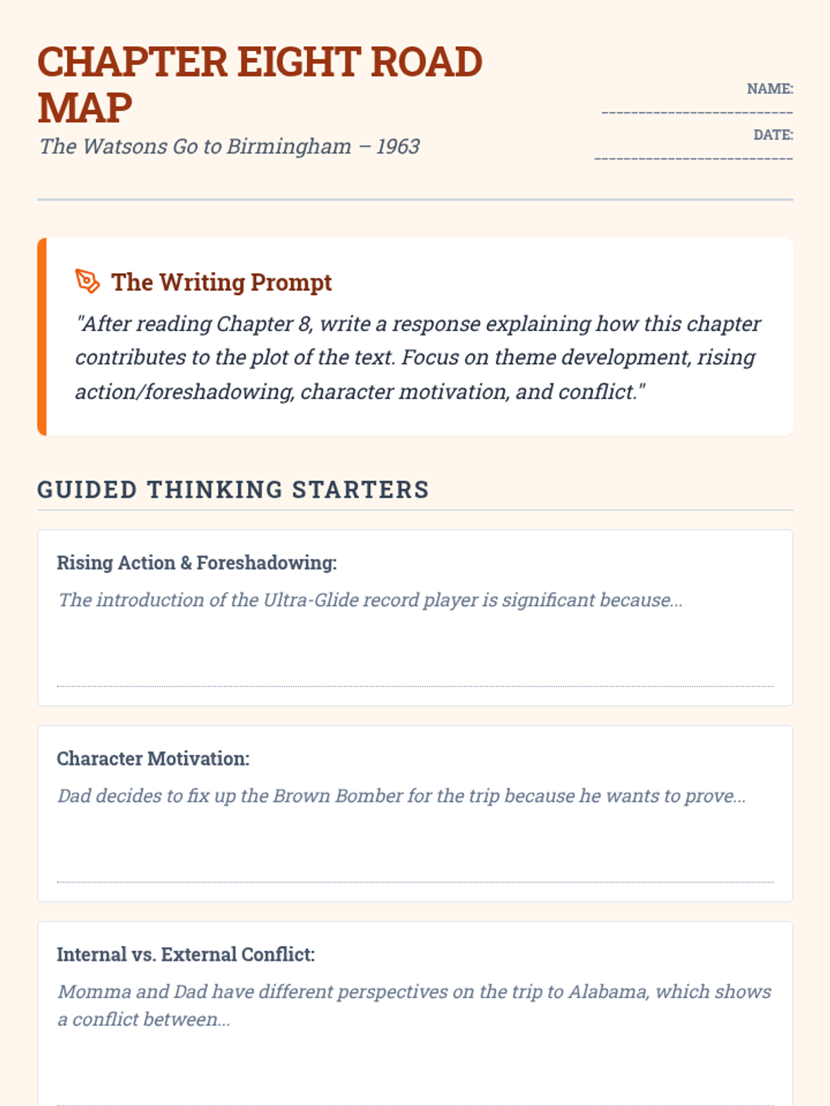 A series of lessons focused on analyzing key chapters of 'The Watsons Go to Birmingham - 1963', with a specific focus on plot development, theme, and author's craft.