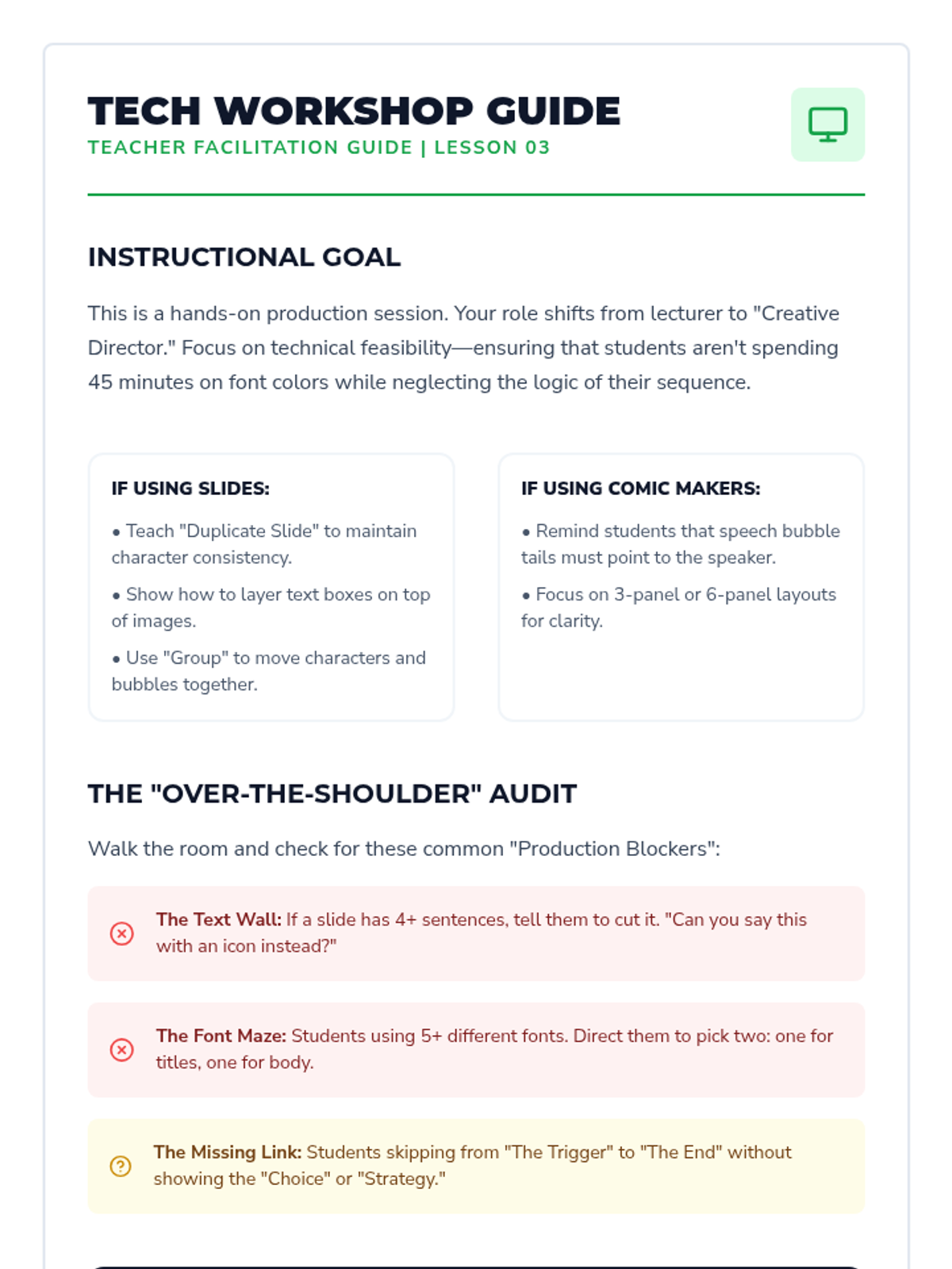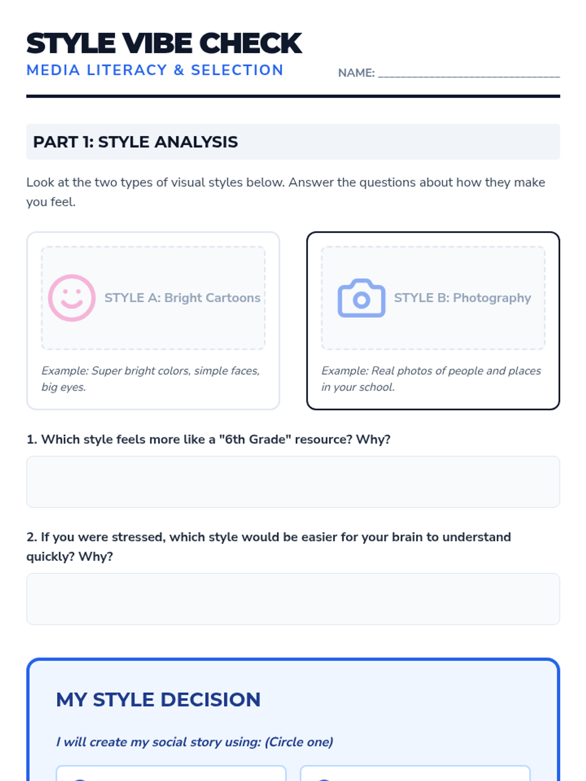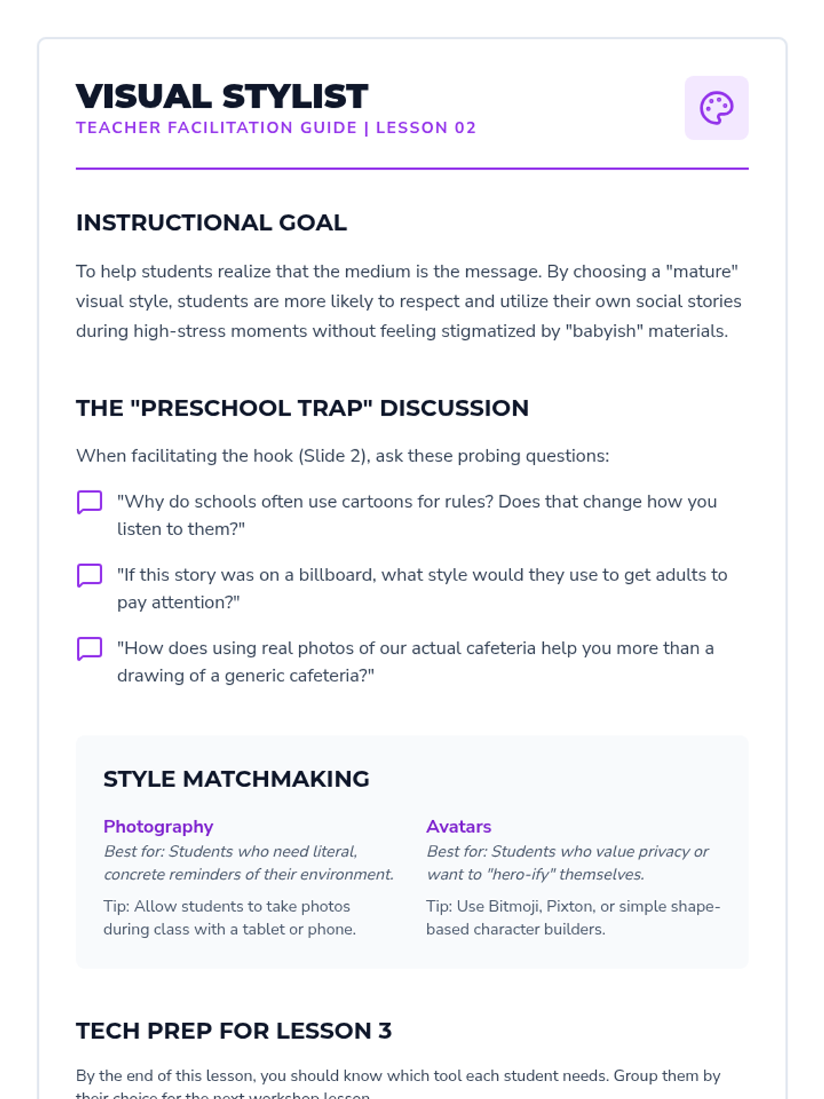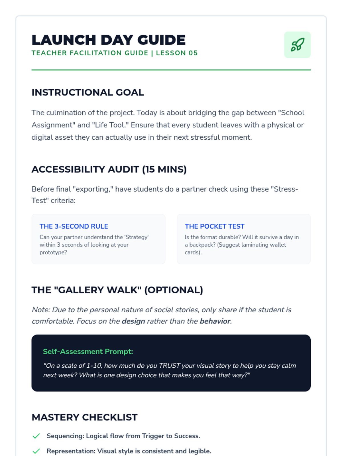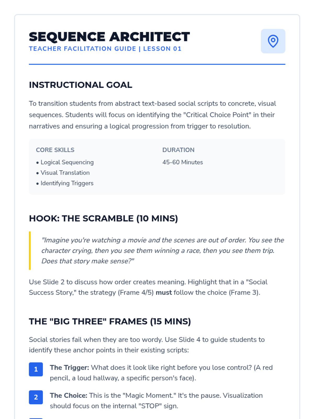 A 5-lesson project-based sequence for 6th-grade students that transforms written social stories into visual formats like comic strips and digital slides. Students focus on sequencing, visual representation, and symbolic cues to enhance emotional regulation and memory retention.