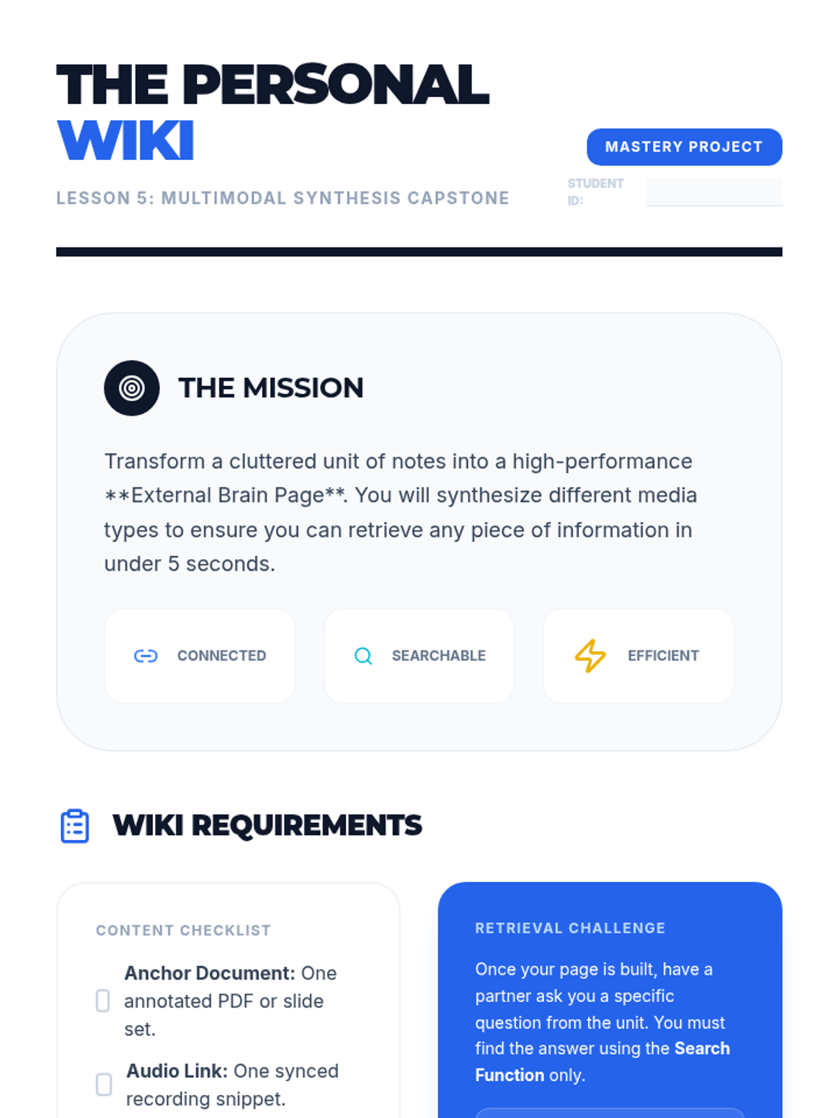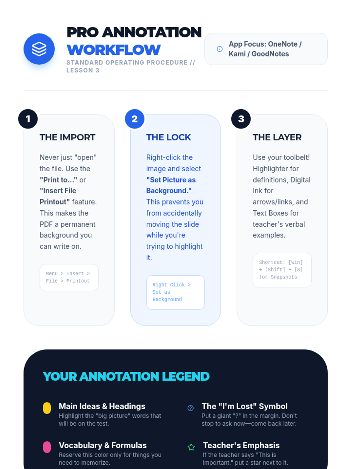 A sequence designed for 11th-grade students to master digital tools that support working memory. It focuses on audio-synced note-taking, dictation, digital annotation, and file organization to bypass processing speed barriers.