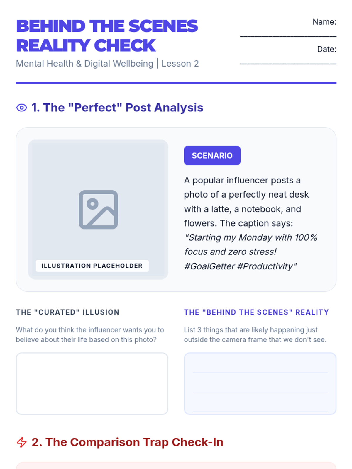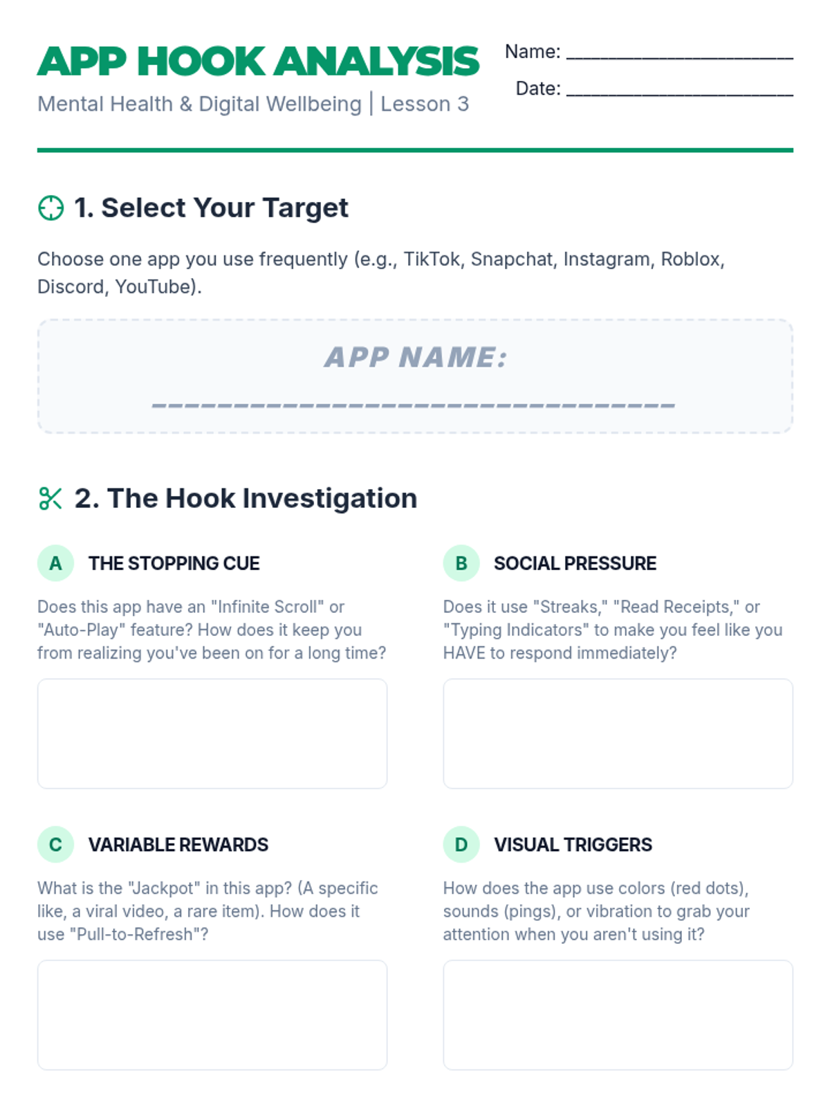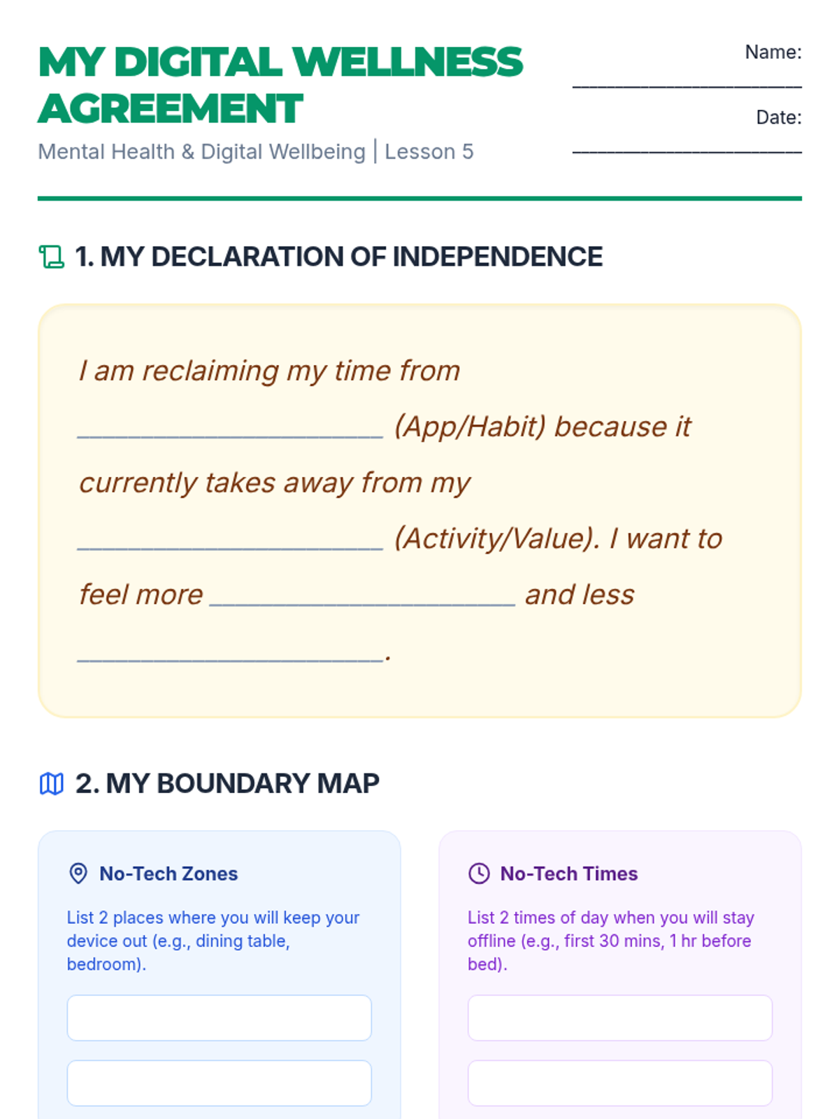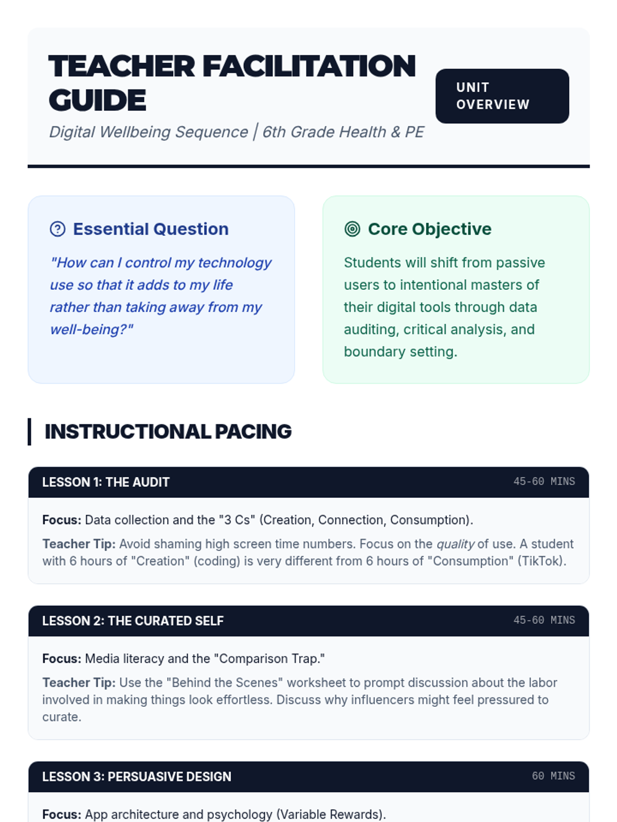 A comprehensive 5-lesson unit for 6th graders to understand their relationship with technology, from auditing habits and deconstructing social media imagery to resisting persuasive design and creating a personal wellness plan.