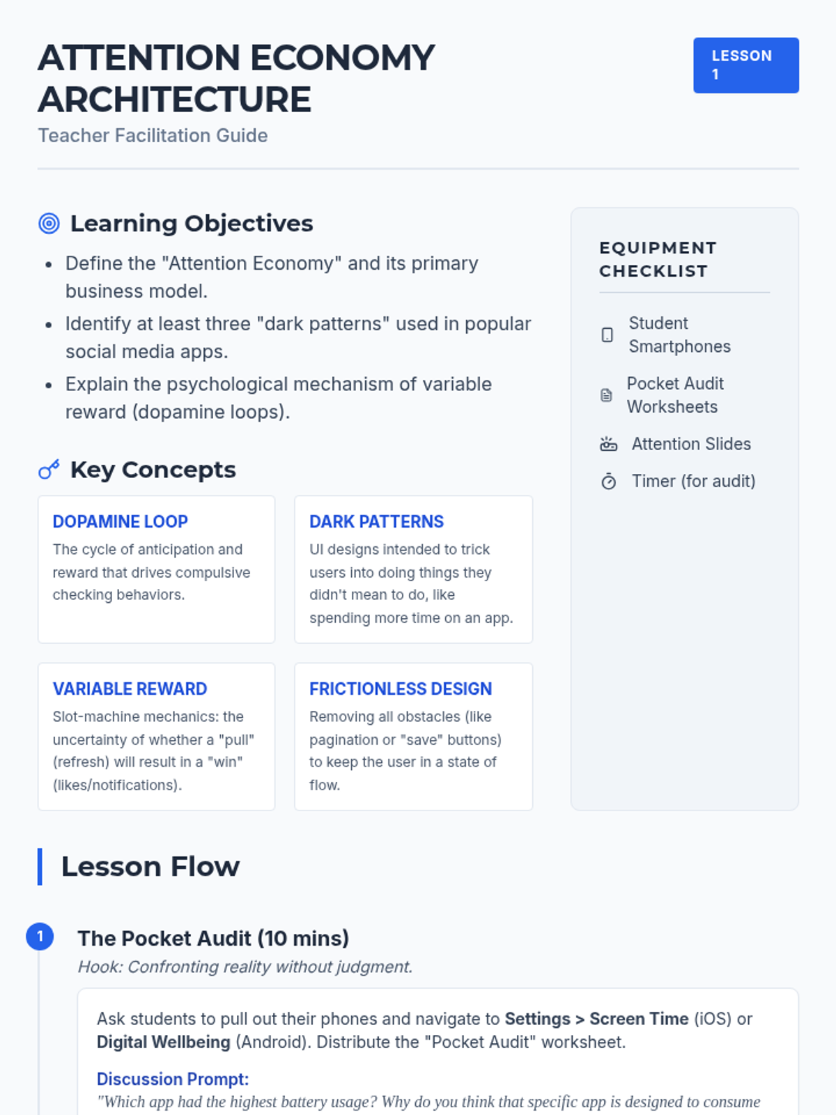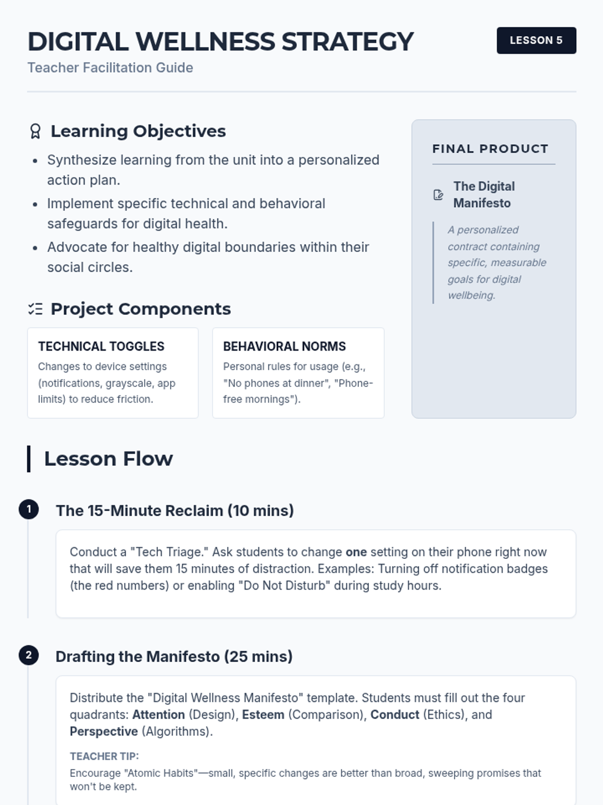 A comprehensive sequence for 11th-grade students to analyze the psychological mechanisms of social media, evaluate its impact on mental health, and develop evidence-based strategies for digital agency.