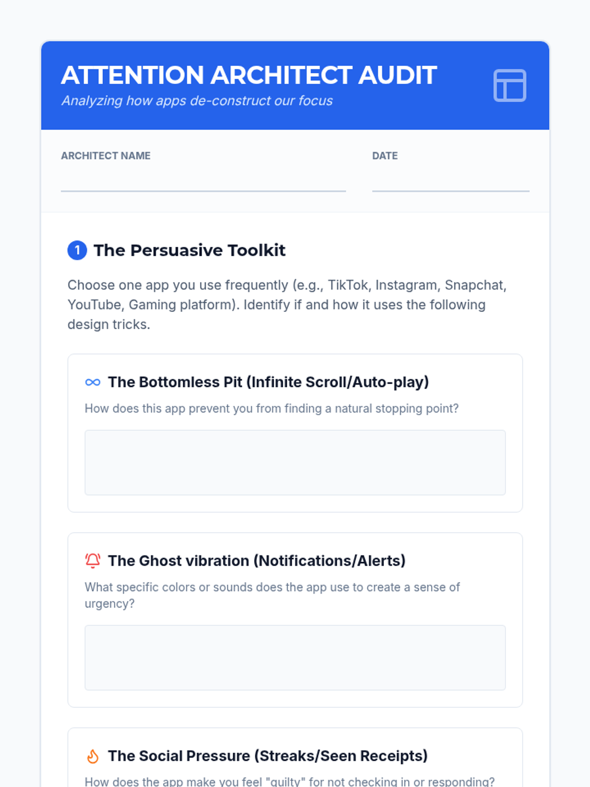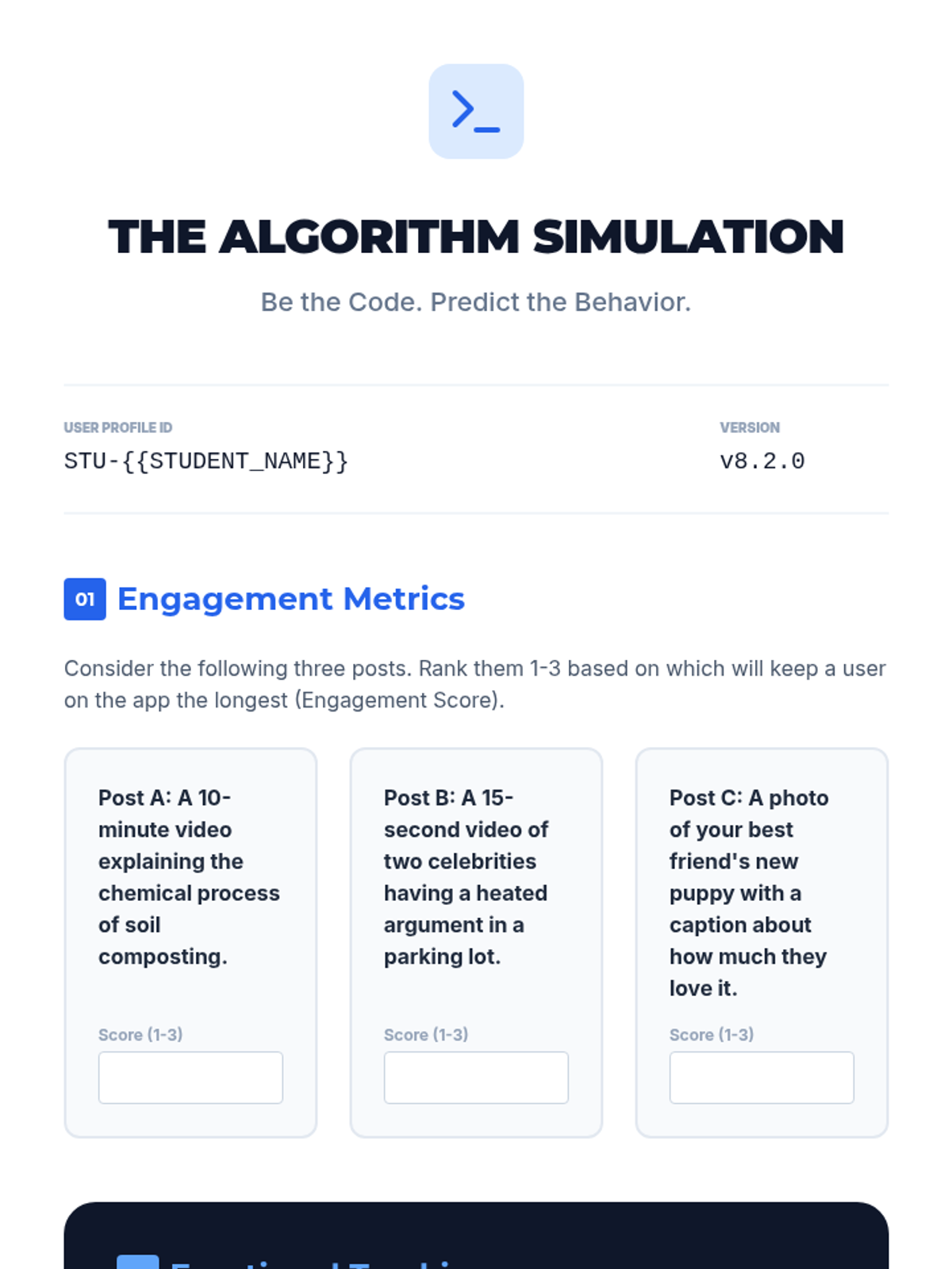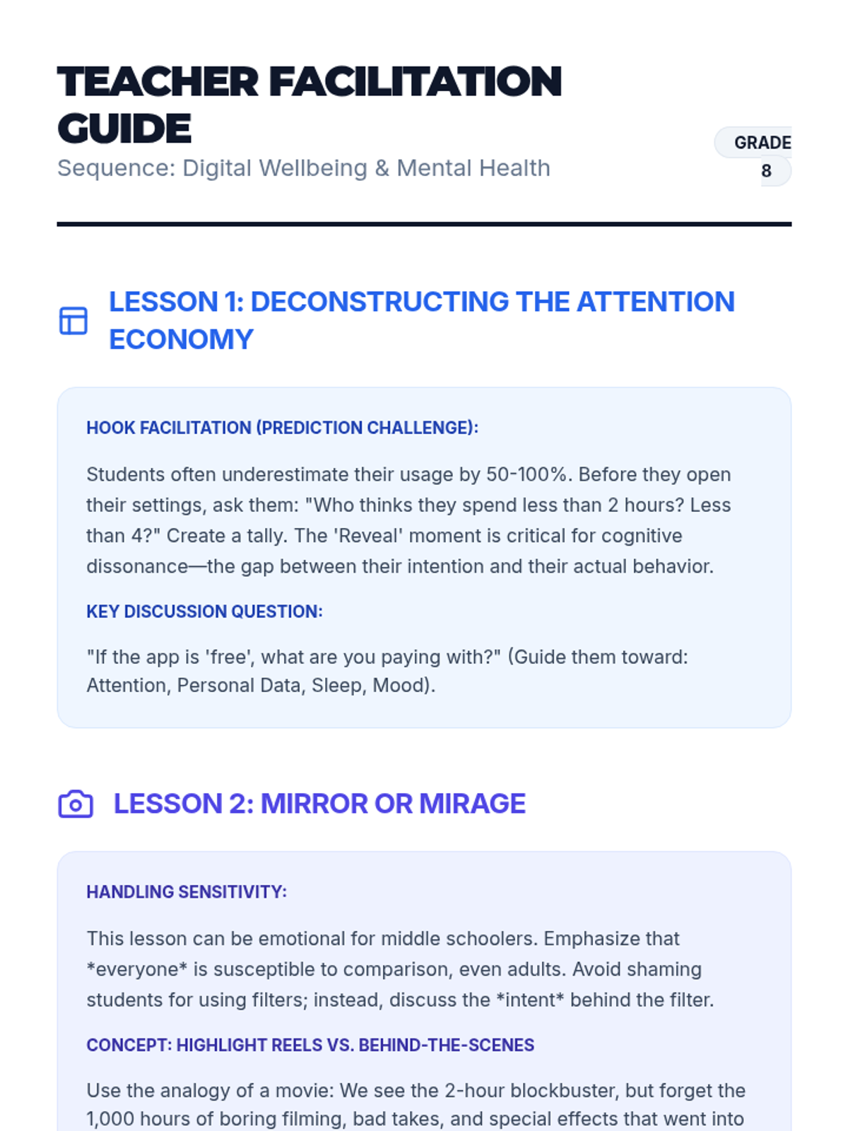 This 5-lesson sequence for 8th-grade students investigates the psychology of digital design, social media's impact on self-esteem, cyberbullying prevention, and algorithmic influence, culminating in a personalized digital wellness plan.