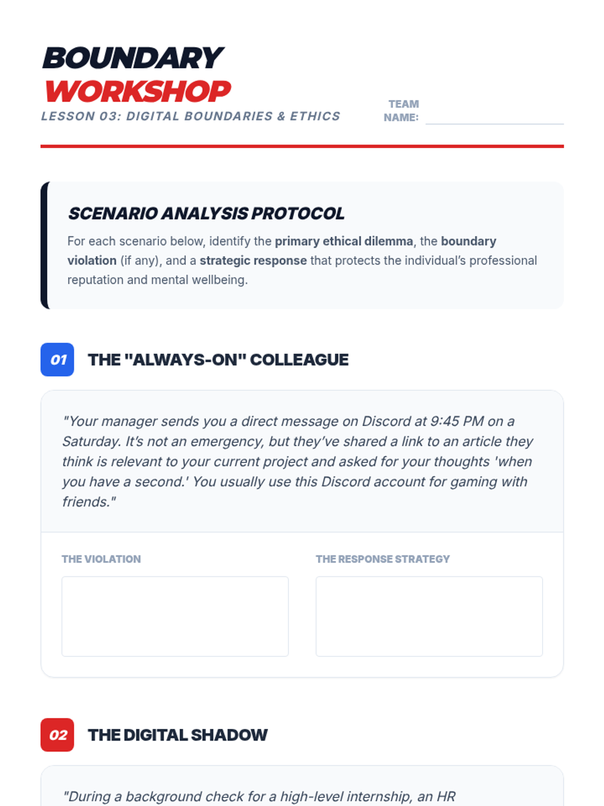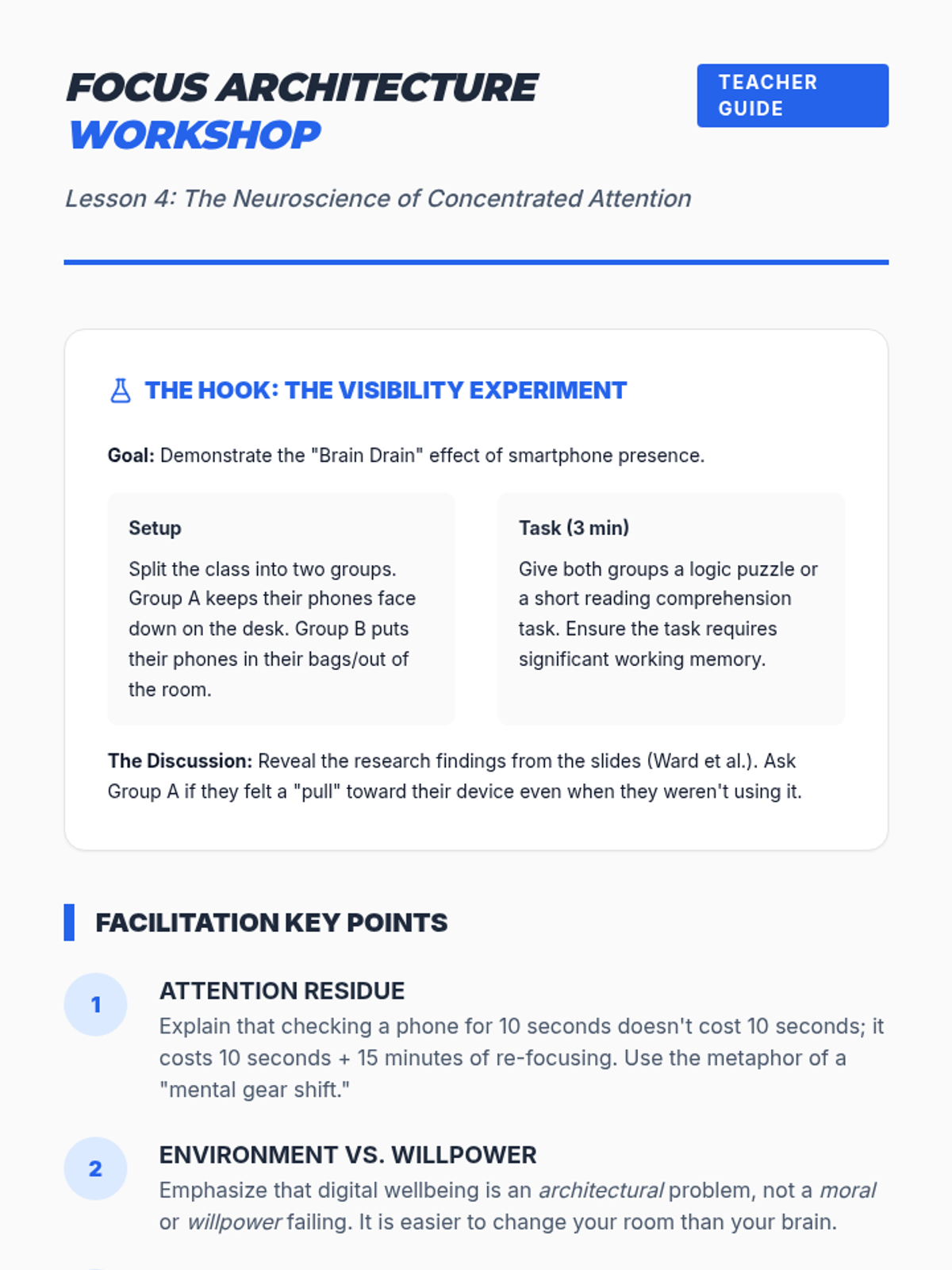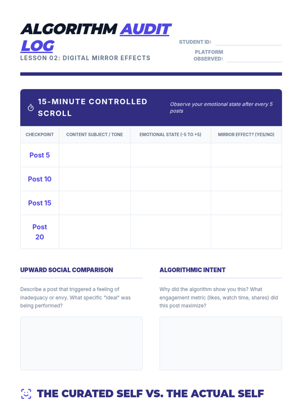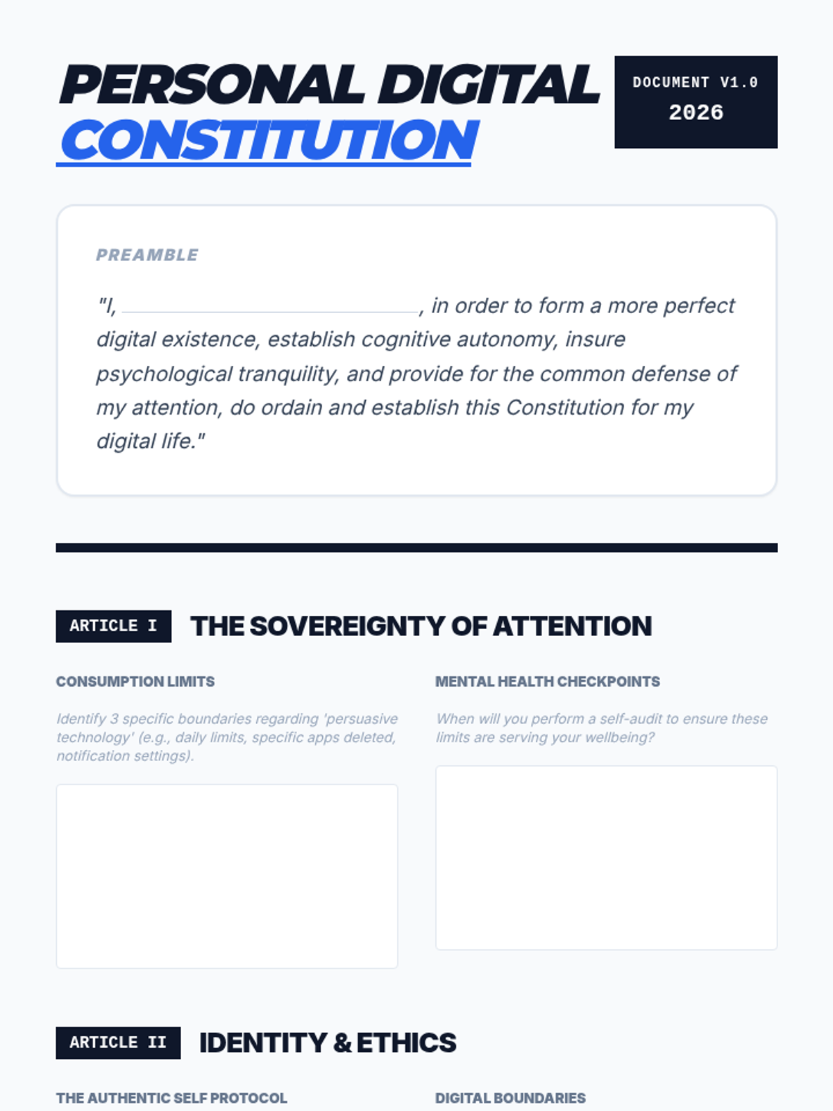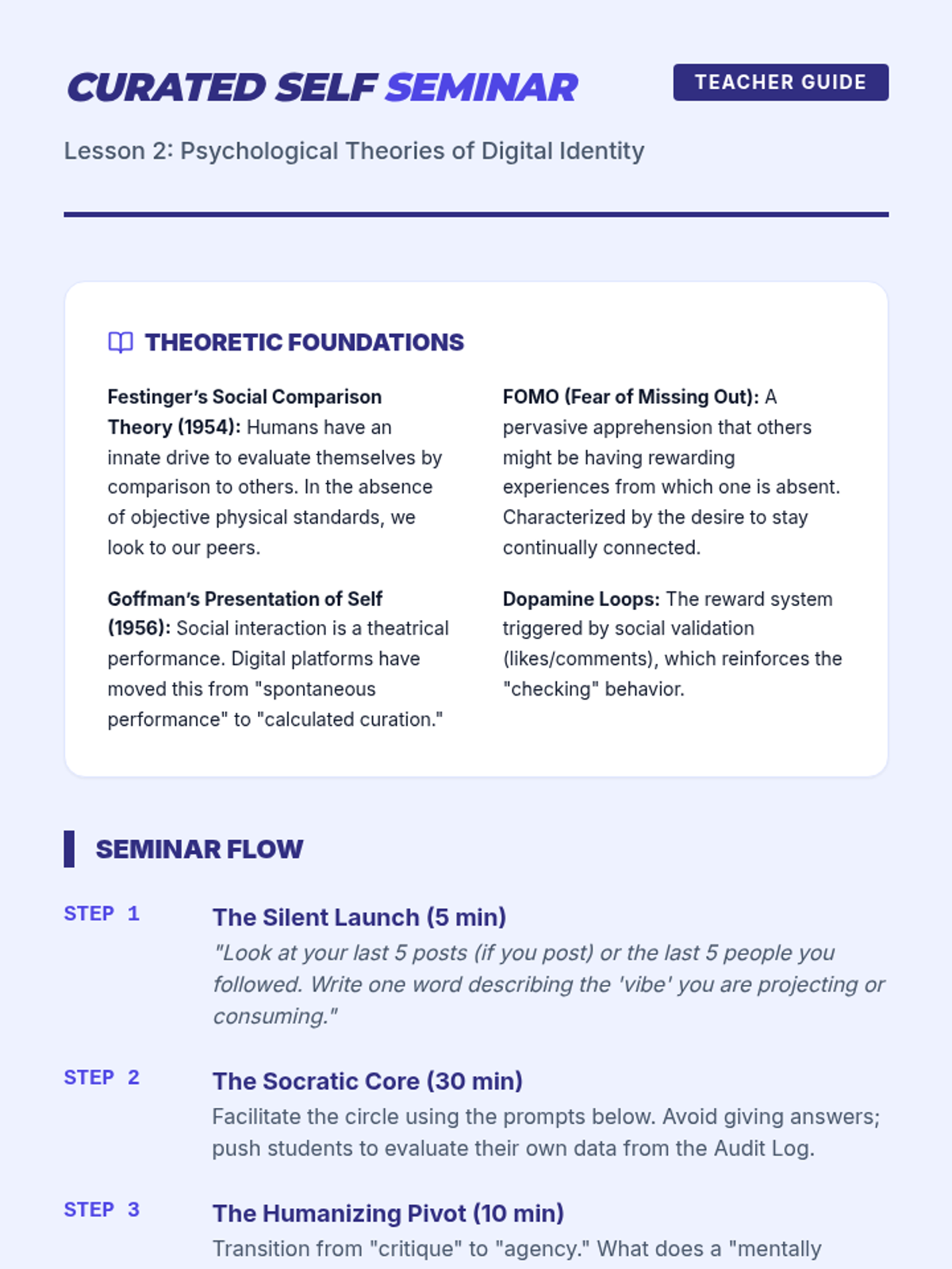 A comprehensive 5-lesson sequence for undergraduate students exploring the intersection of digital technology, psychological well-being, and cognitive autonomy. Students analyze the attention economy, social comparison, digital ethics, and productivity strategies to build a personalized framework for digital resilience.