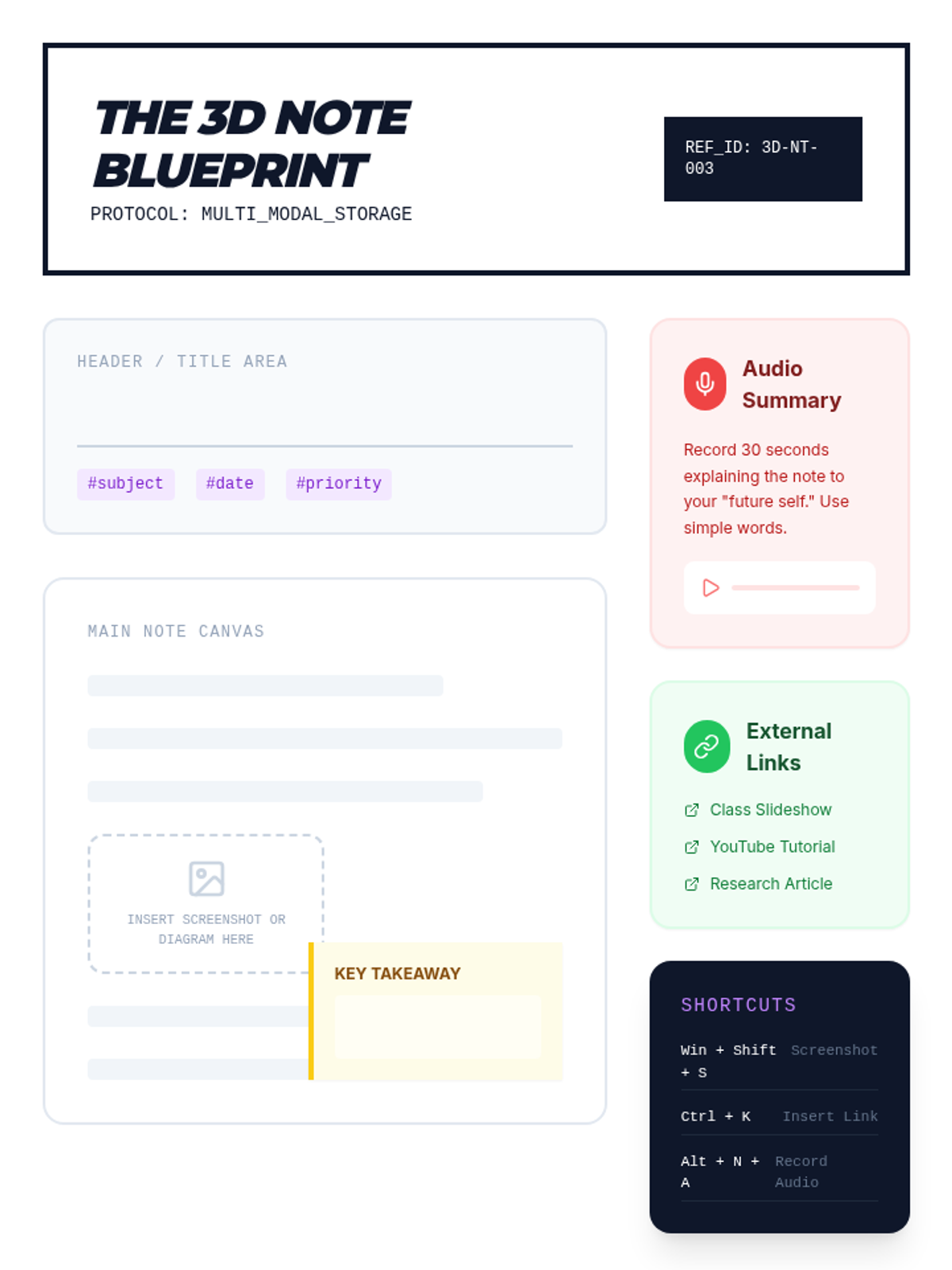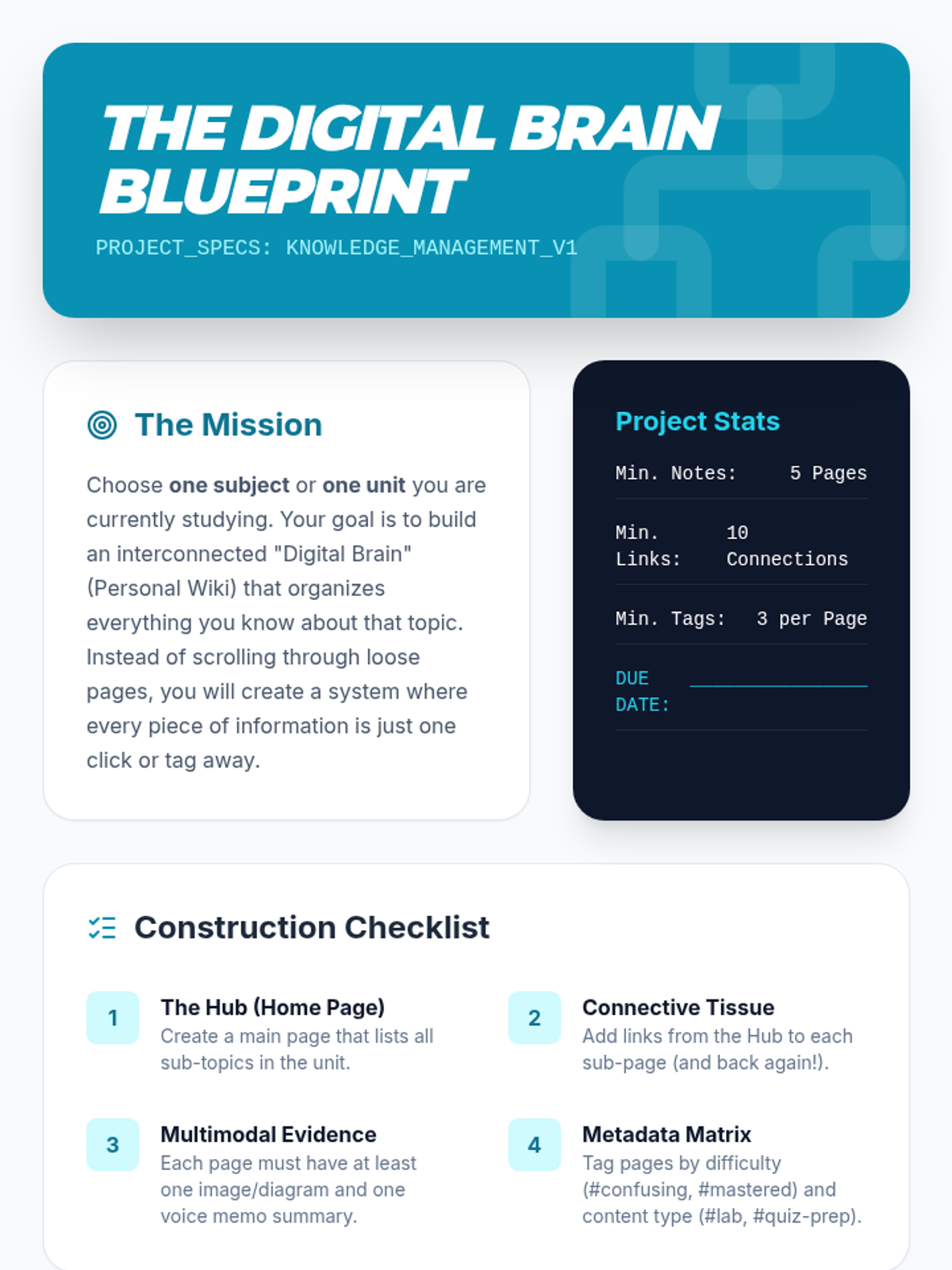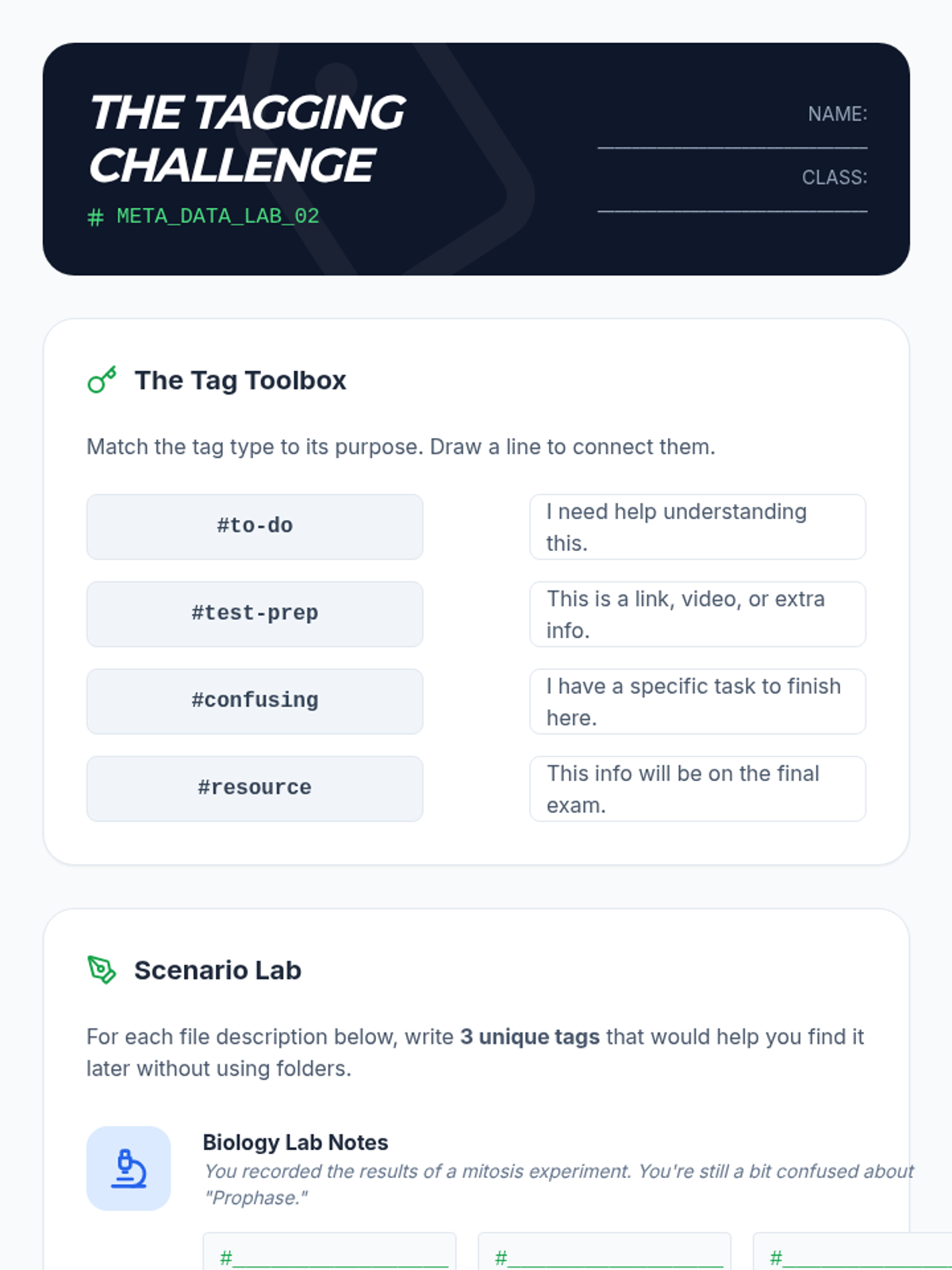 A sequence focused on using digital tools to support working memory through effective file organization, tagging, multimodal note-taking, and accessibility features. Students build a personal 'digital brain' to manage schoolwork efficiently.