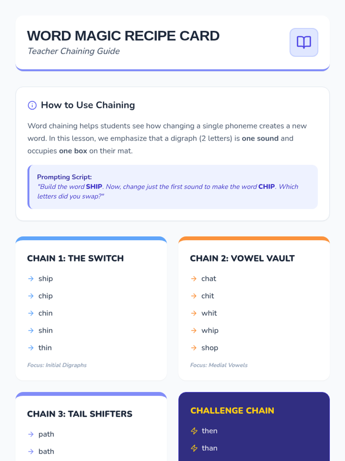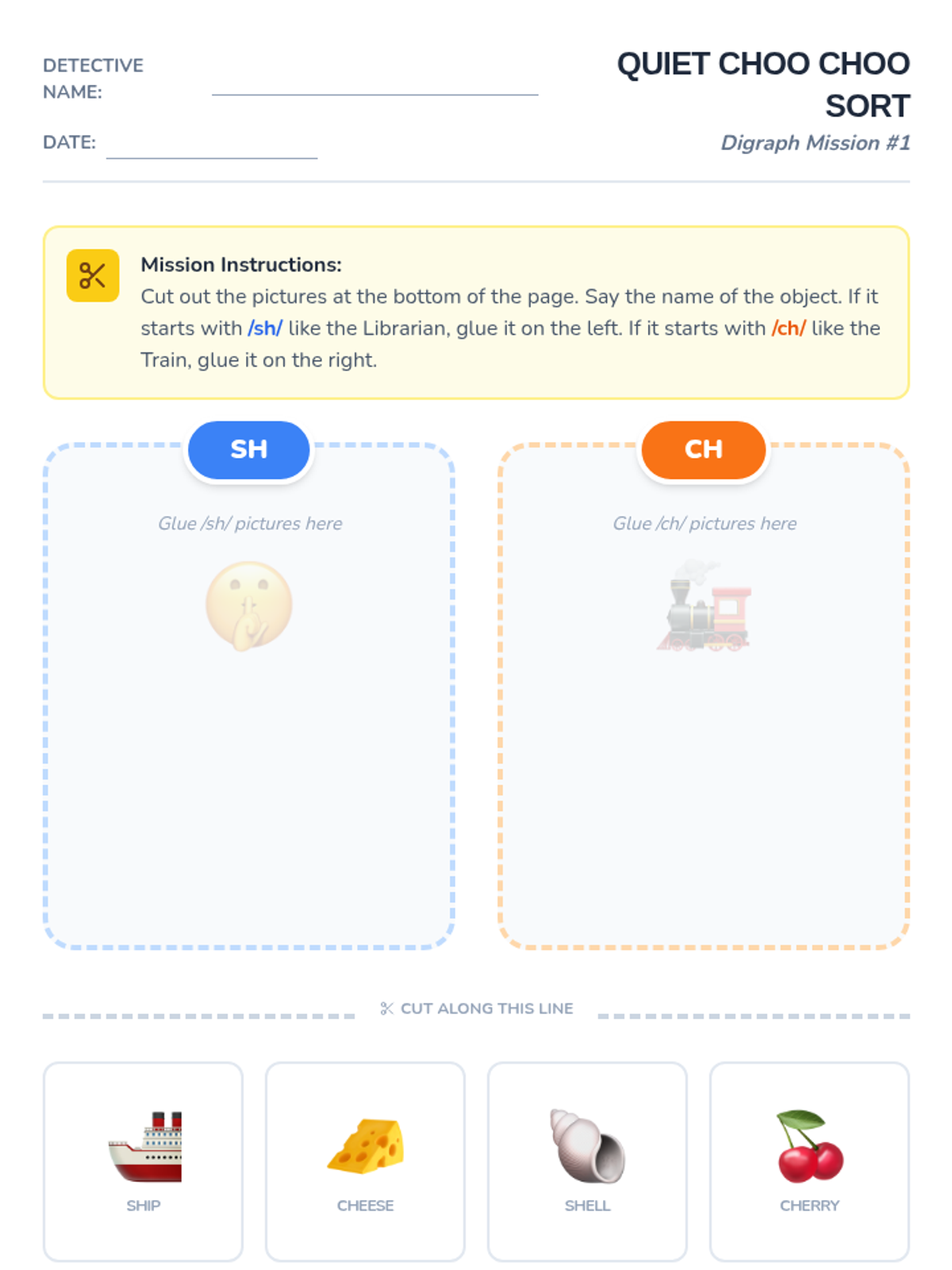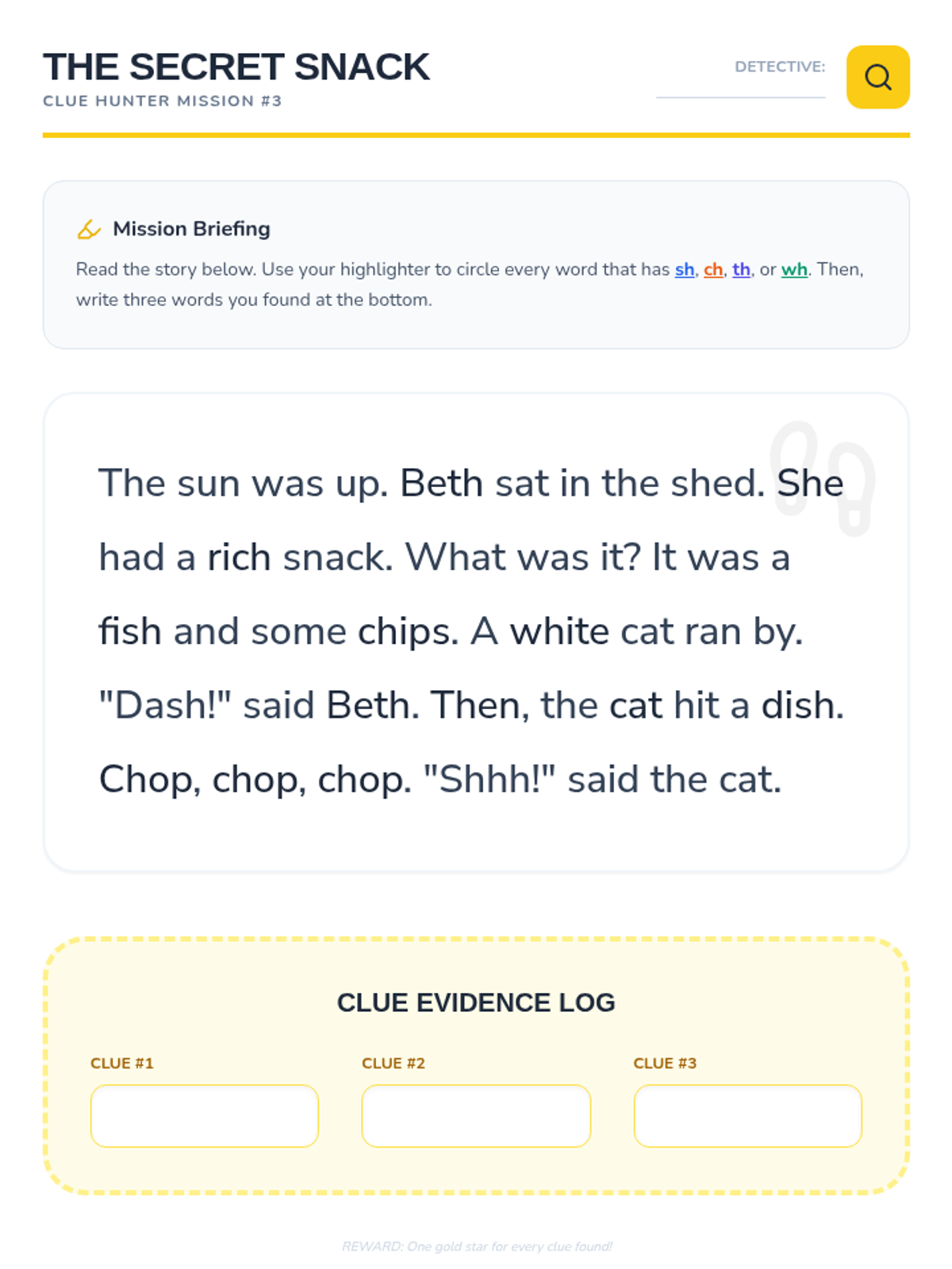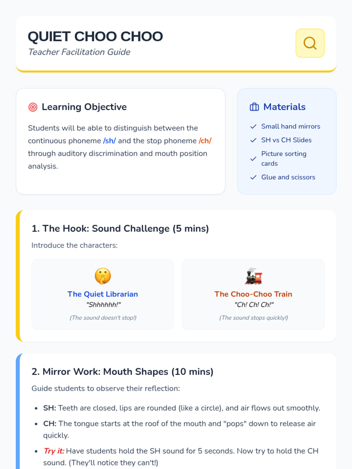 This sequence introduces 1st-grade students to common consonant digraphs (sh, ch, th, wh) through a detective-themed journey. Students move from hearing the sounds to reading and spelling words, culminating in fluency games.