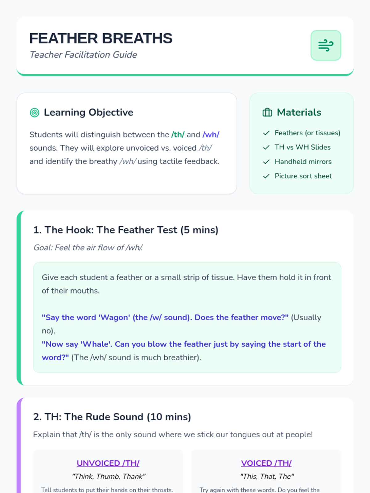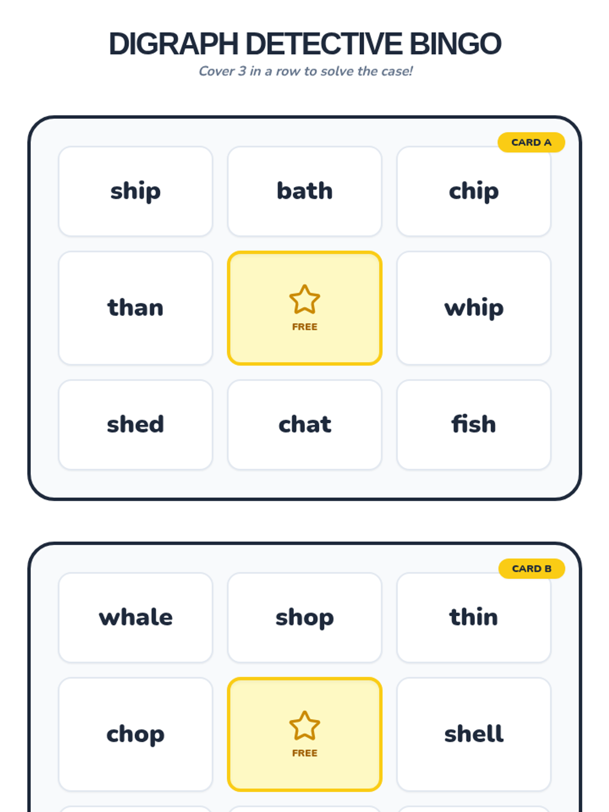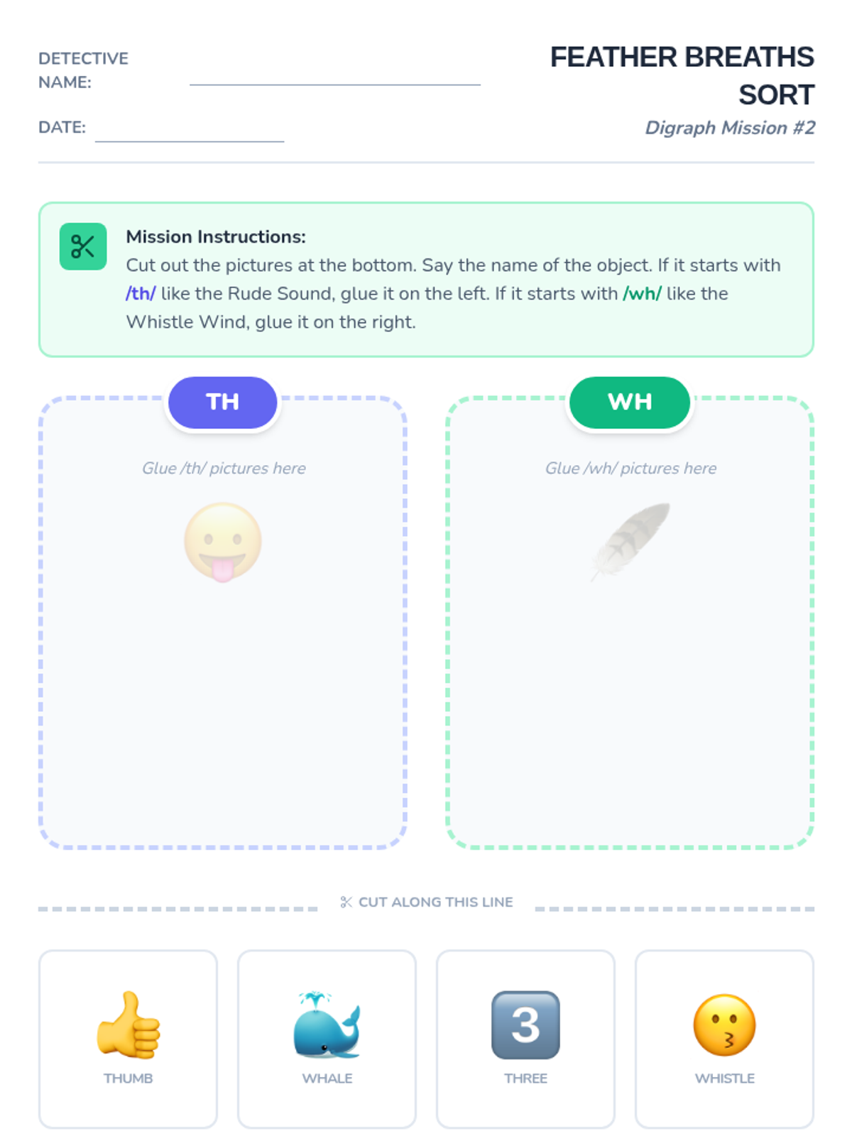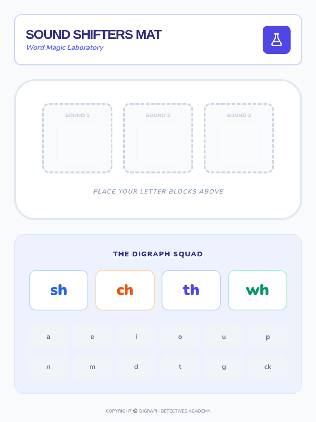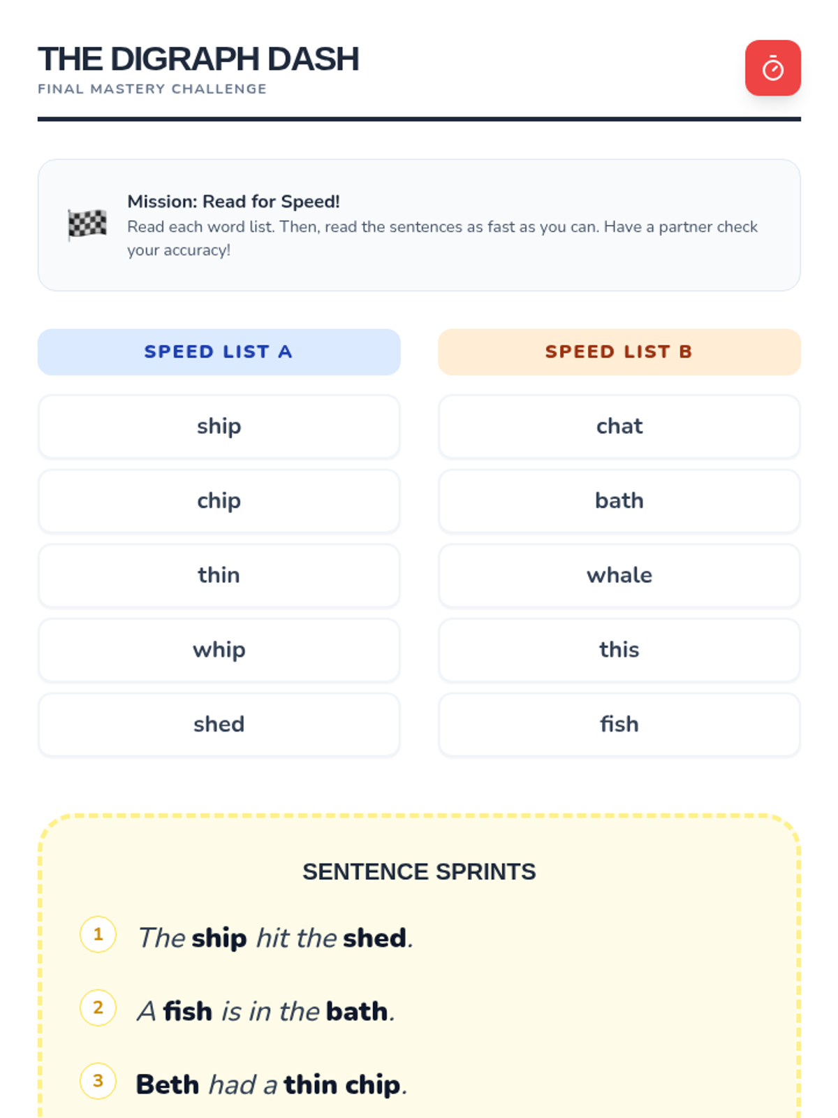 This sequence introduces 1st-grade students to common consonant digraphs (sh, ch, th, wh) through a detective-themed journey. Students move from hearing the sounds to reading and spelling words, culminating in fluency games.