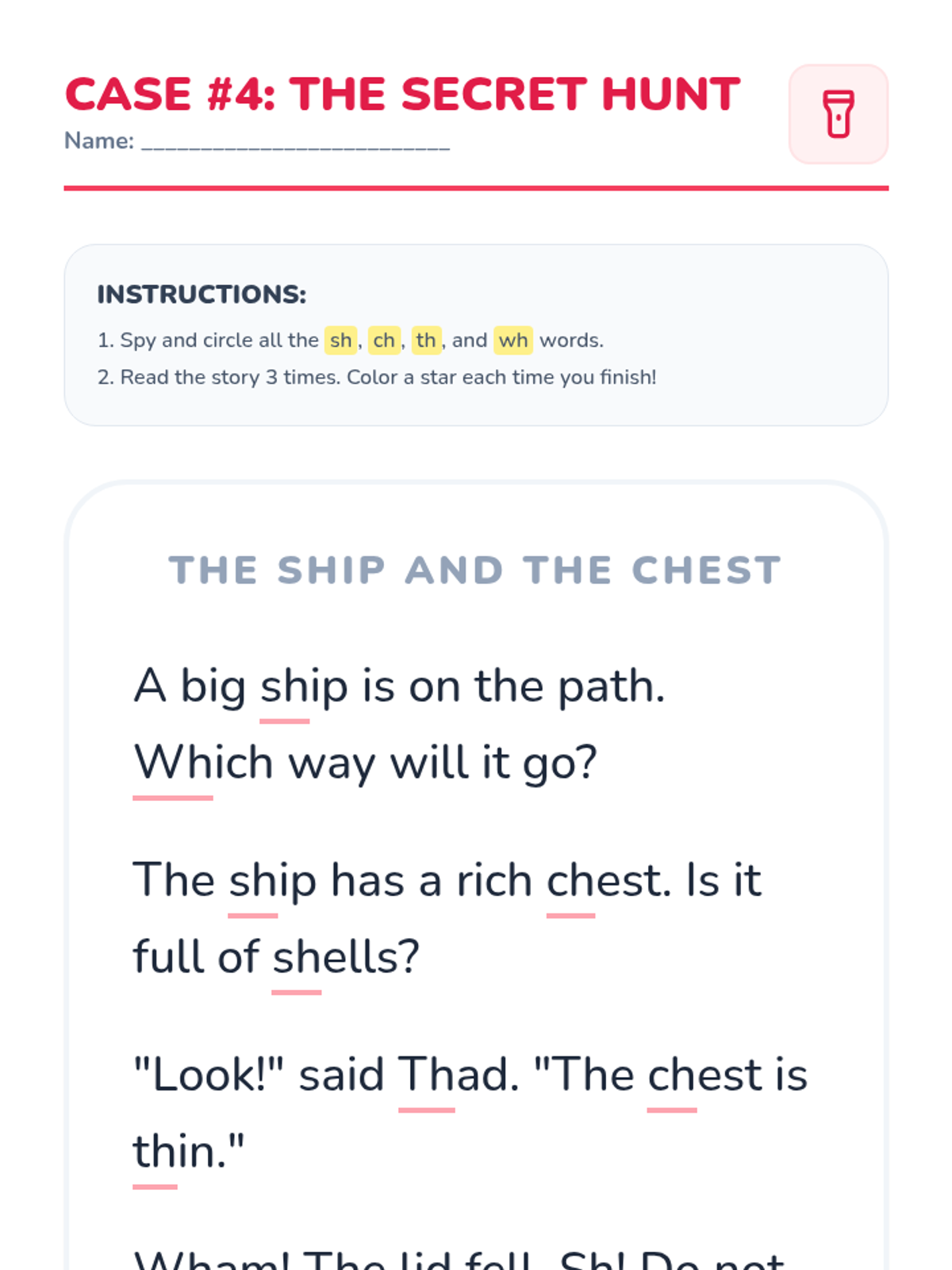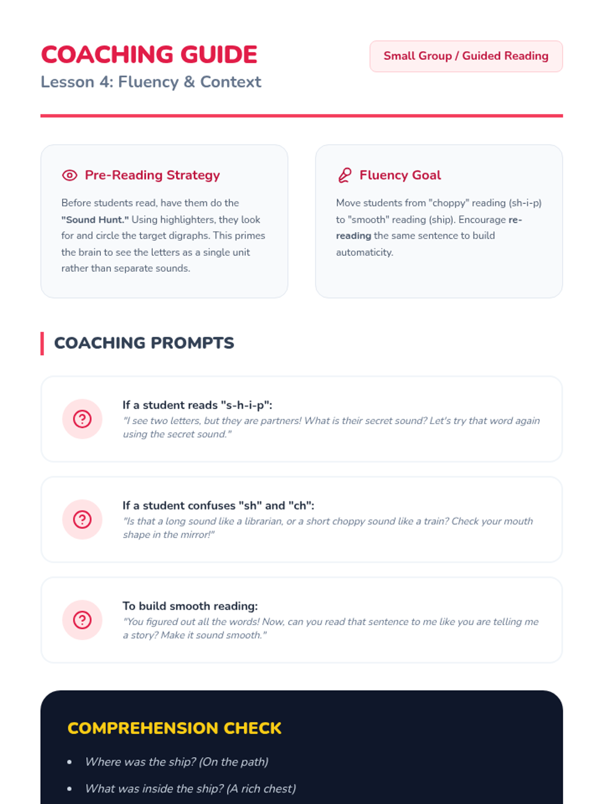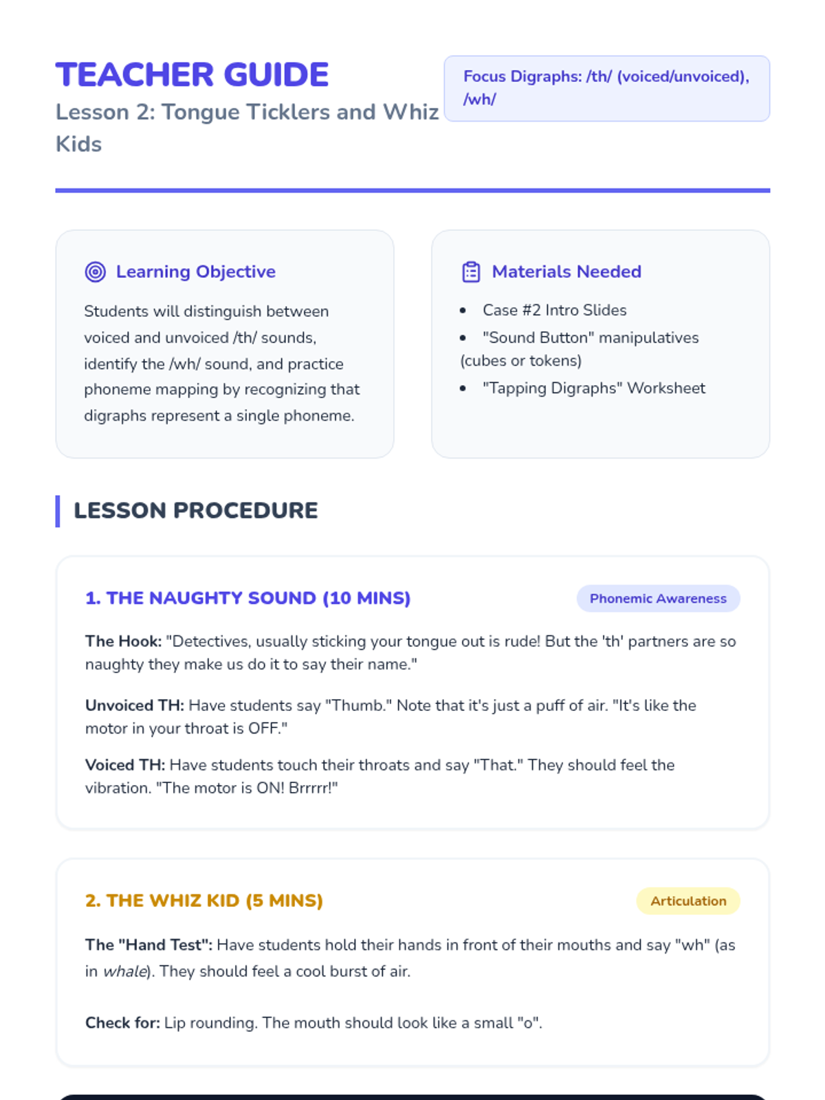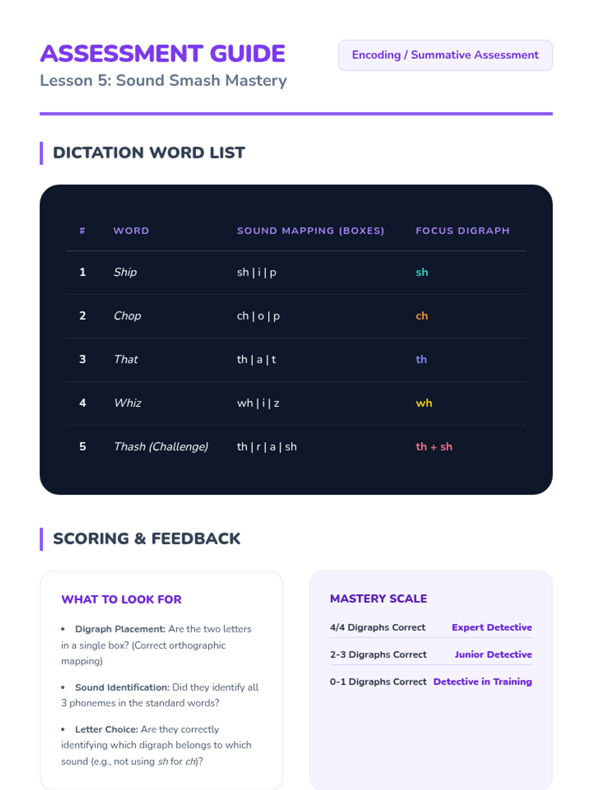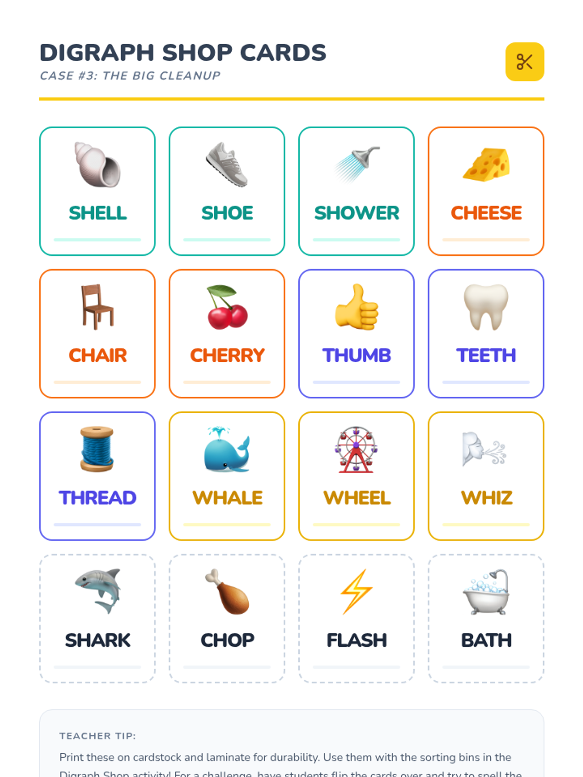 A systematic introduction to the consonant digraphs sh, ch, th, and wh for first-grade students, focusing on phonemic awareness, articulation, decoding, and encoding.