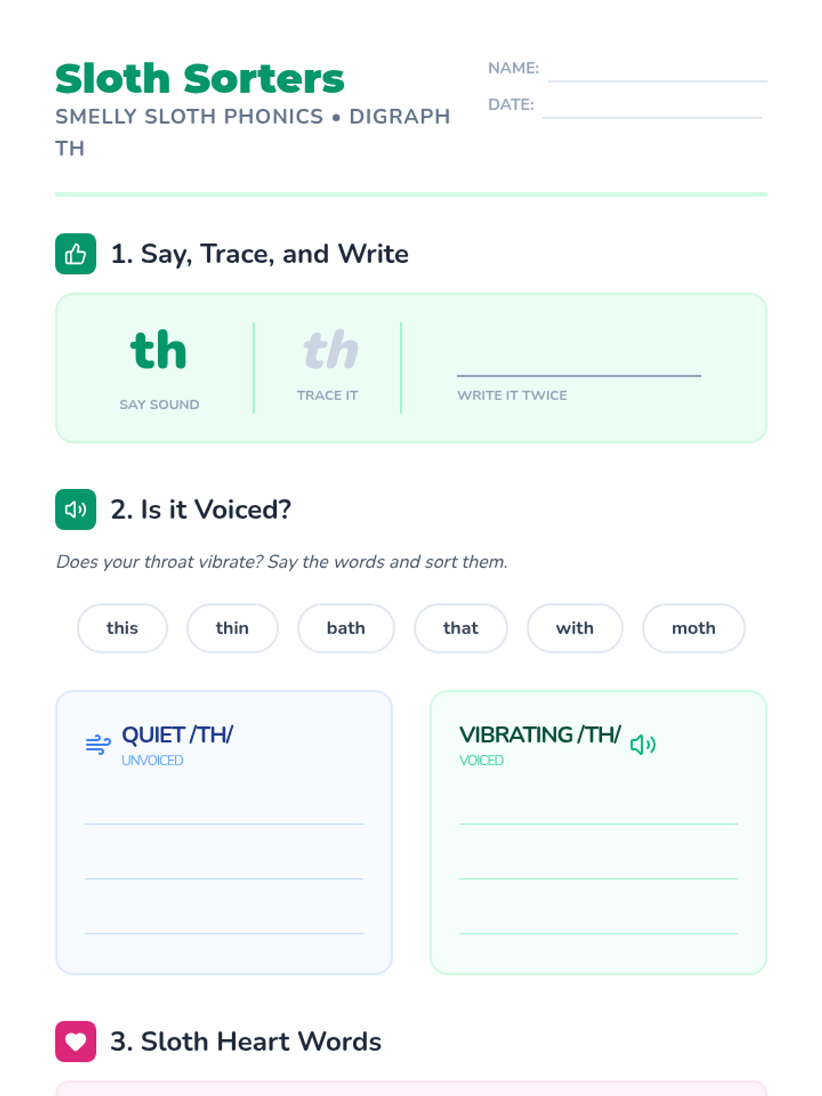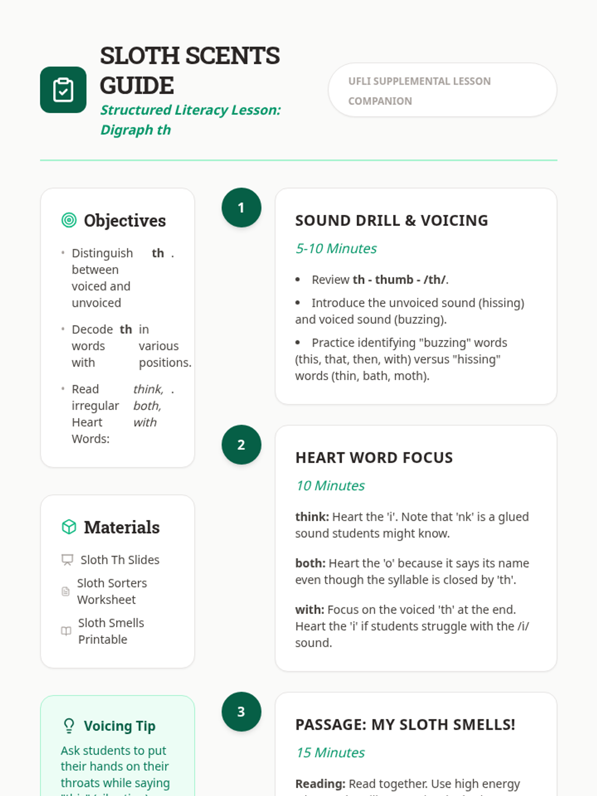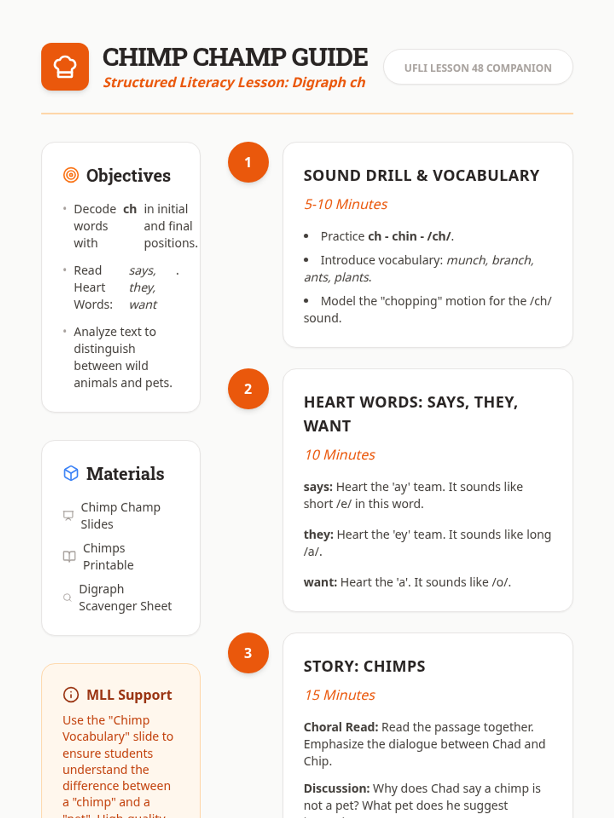 A series of structured literacy lessons focusing on mastering common digraphs (sh, th, ch) through explicit instruction, heart word methods, and decodable text practice.