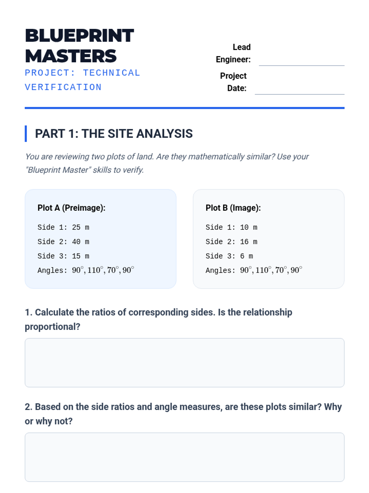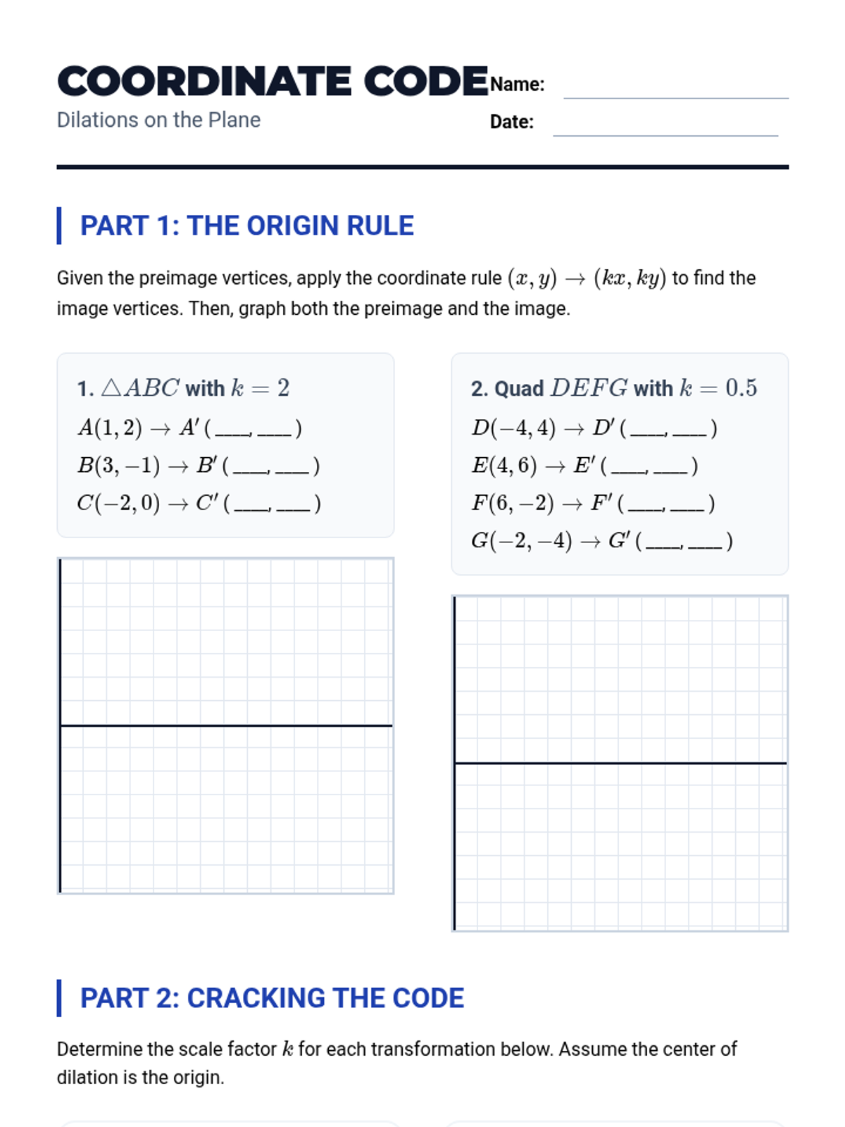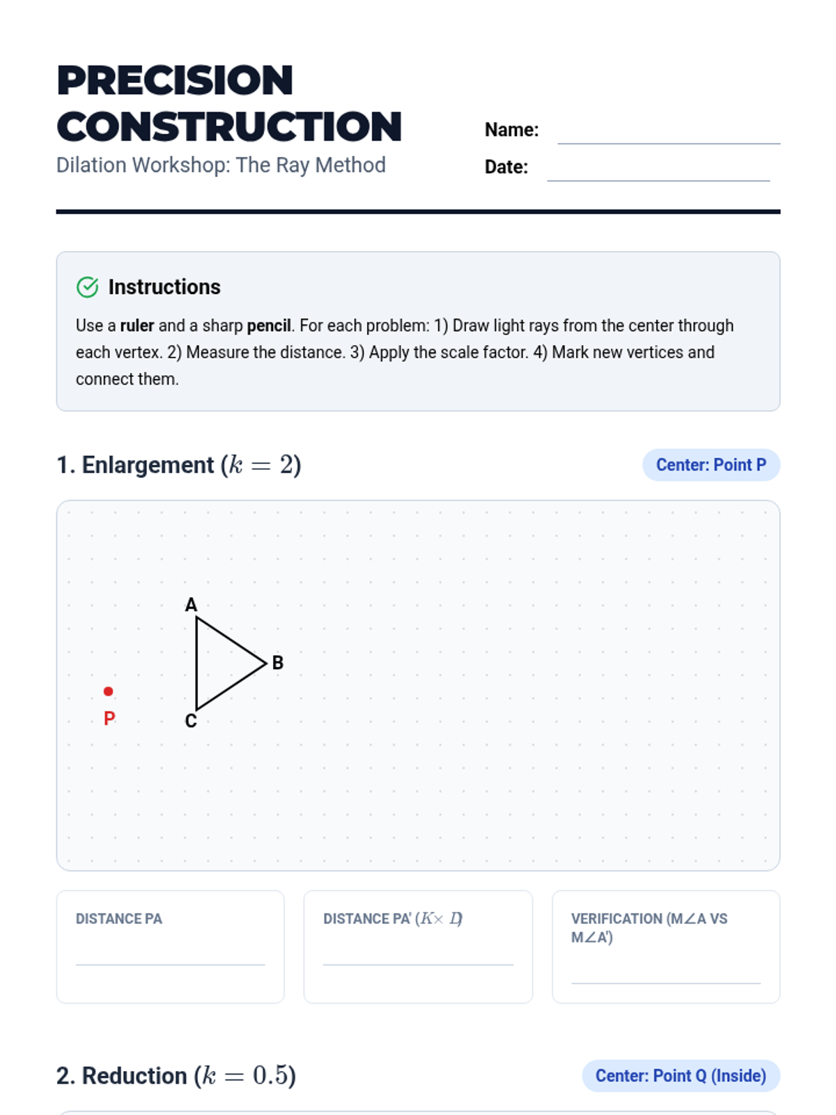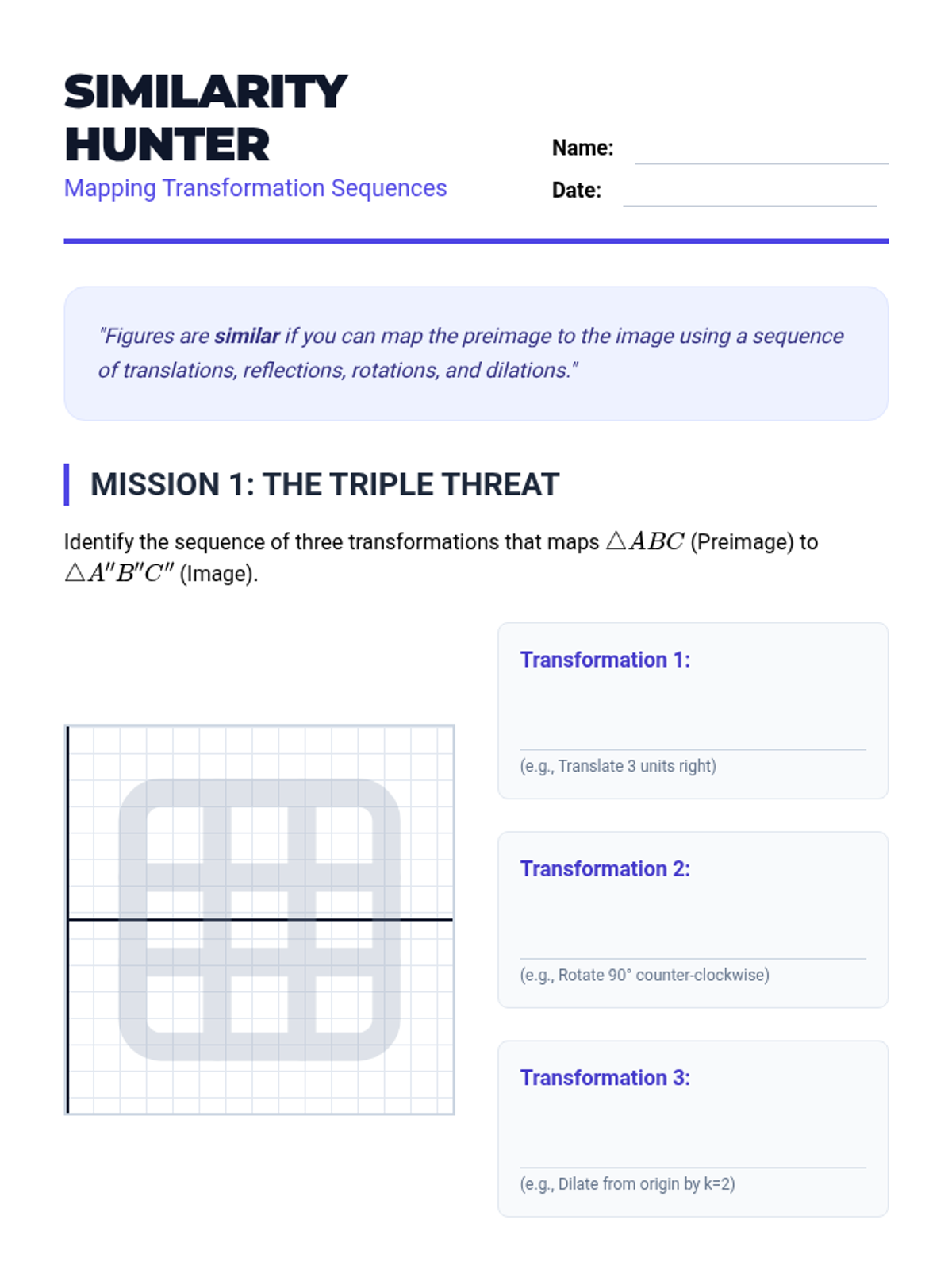 This sequence introduces non-rigid transformations, specifically focusing on dilations and the concept of similarity. Students explore how dilations change size while preserving shape, investigating the roles of the center of dilation and the scale factor.