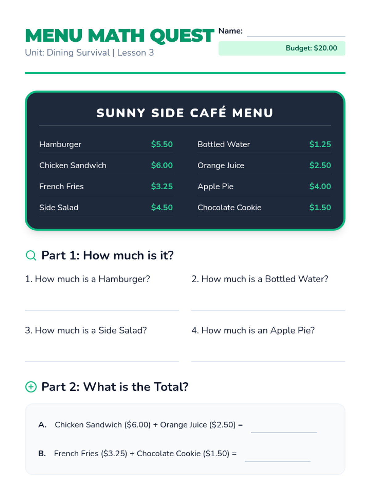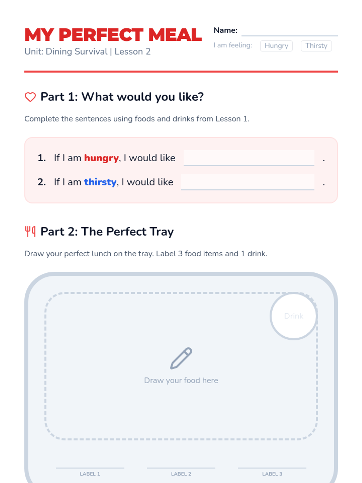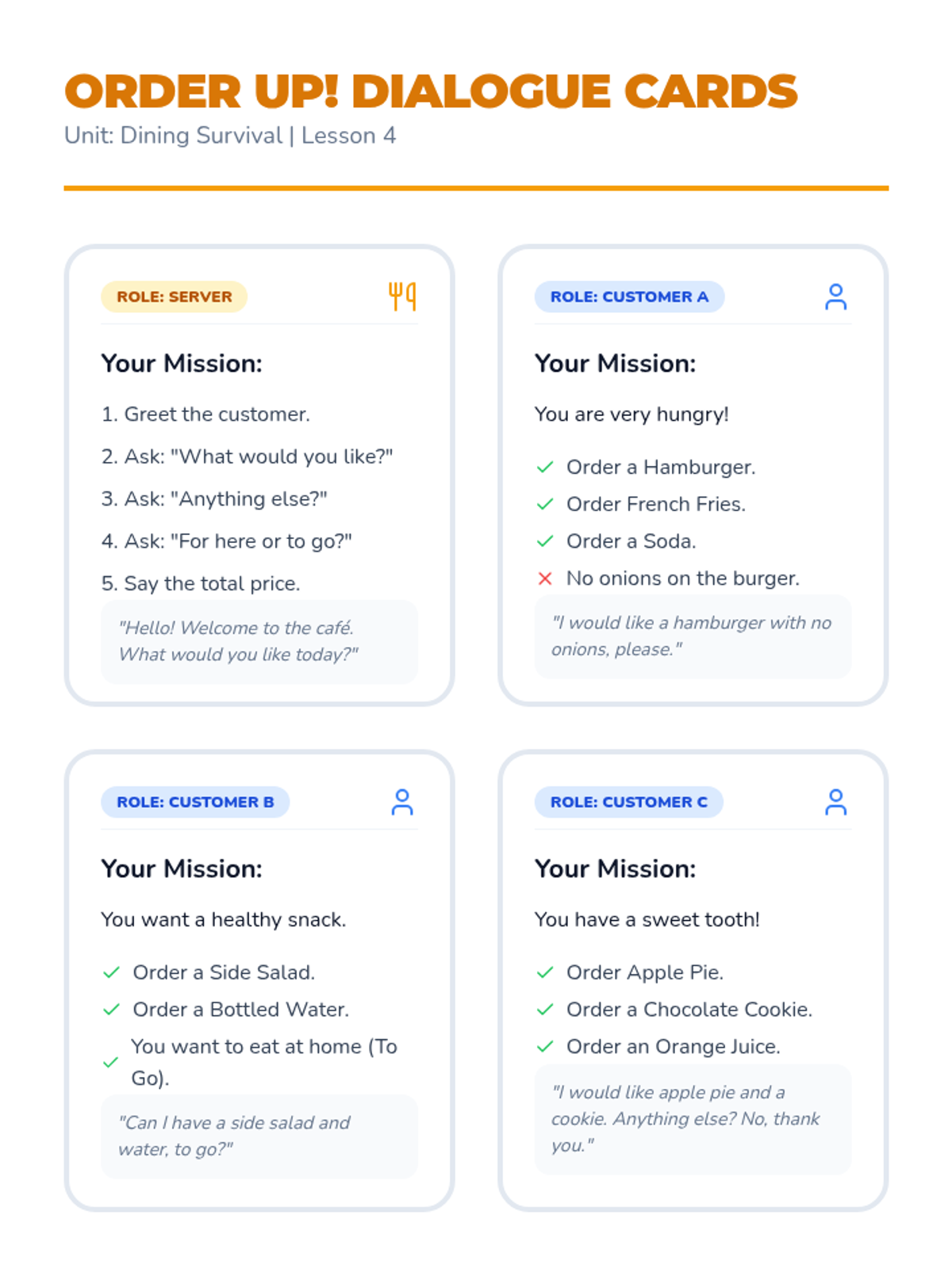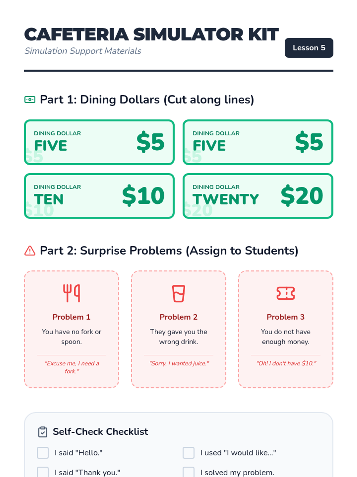 A 5-lesson sequence for beginner ESL students focused on food vocabulary and dining transactions, moving from basic identification to full-scale cafeteria simulations.