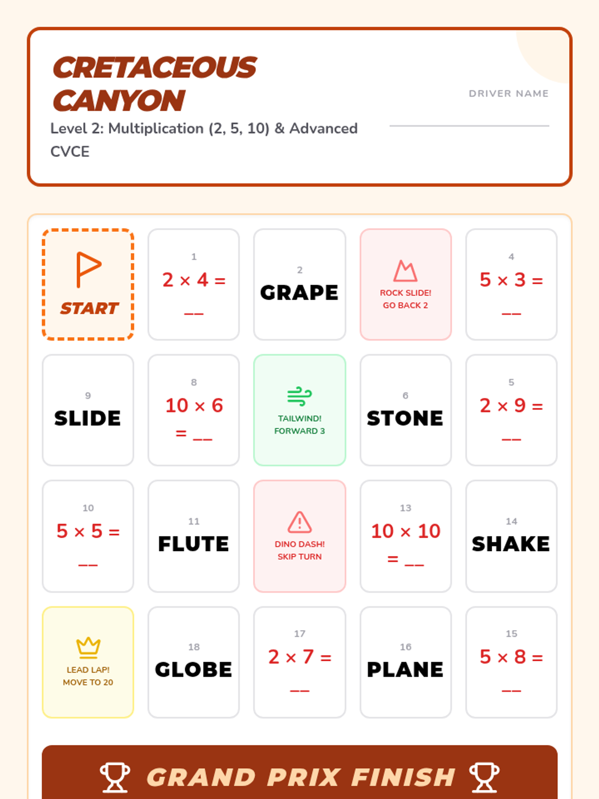 A prehistoric racing-themed series that combines foundational math facts with CVCE word fluency through competitive board games and flashcard challenges.