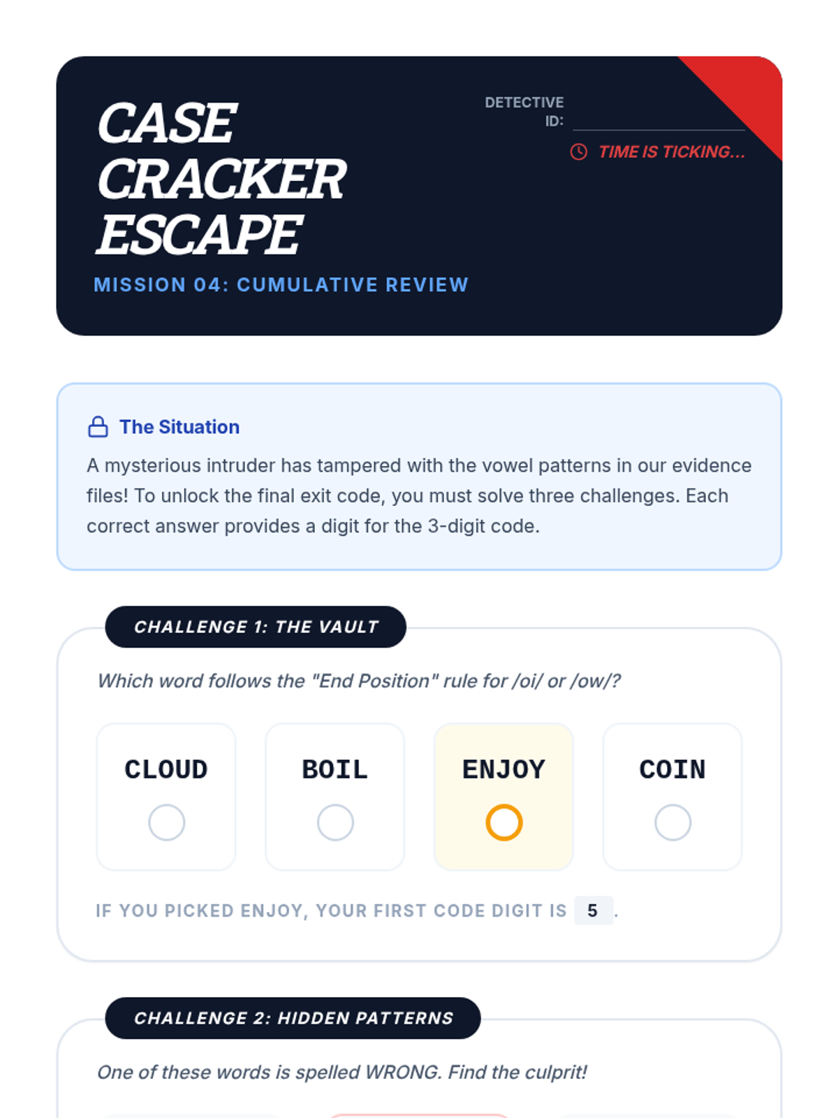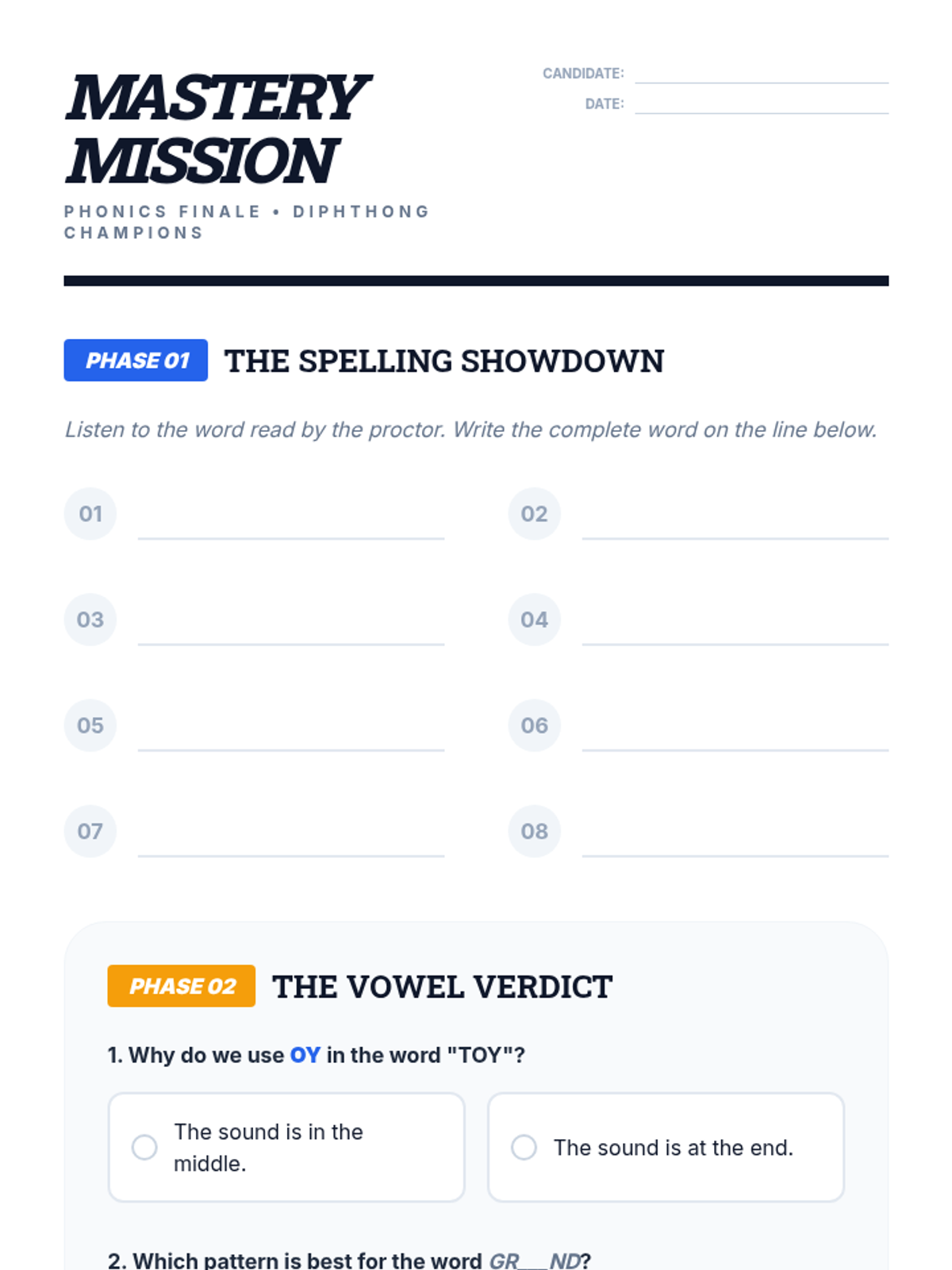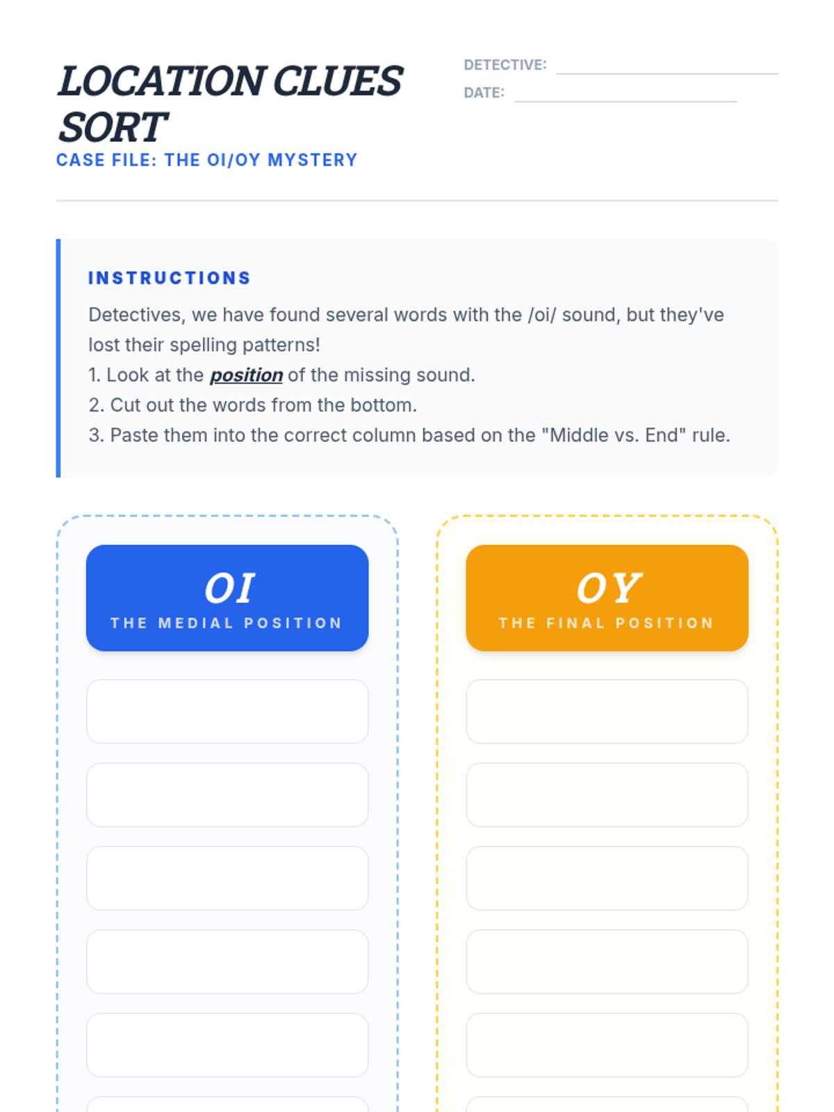 This sequence guides 4th-grade students through the nuances of diphthong spellings (oi, oy, ou, ow). Students take on the role of 'Diphthong Detectives' to investigate phonemic sounds, discover orthographic rules based on word position, and apply their knowledge through collaborative games and investigative puzzles.