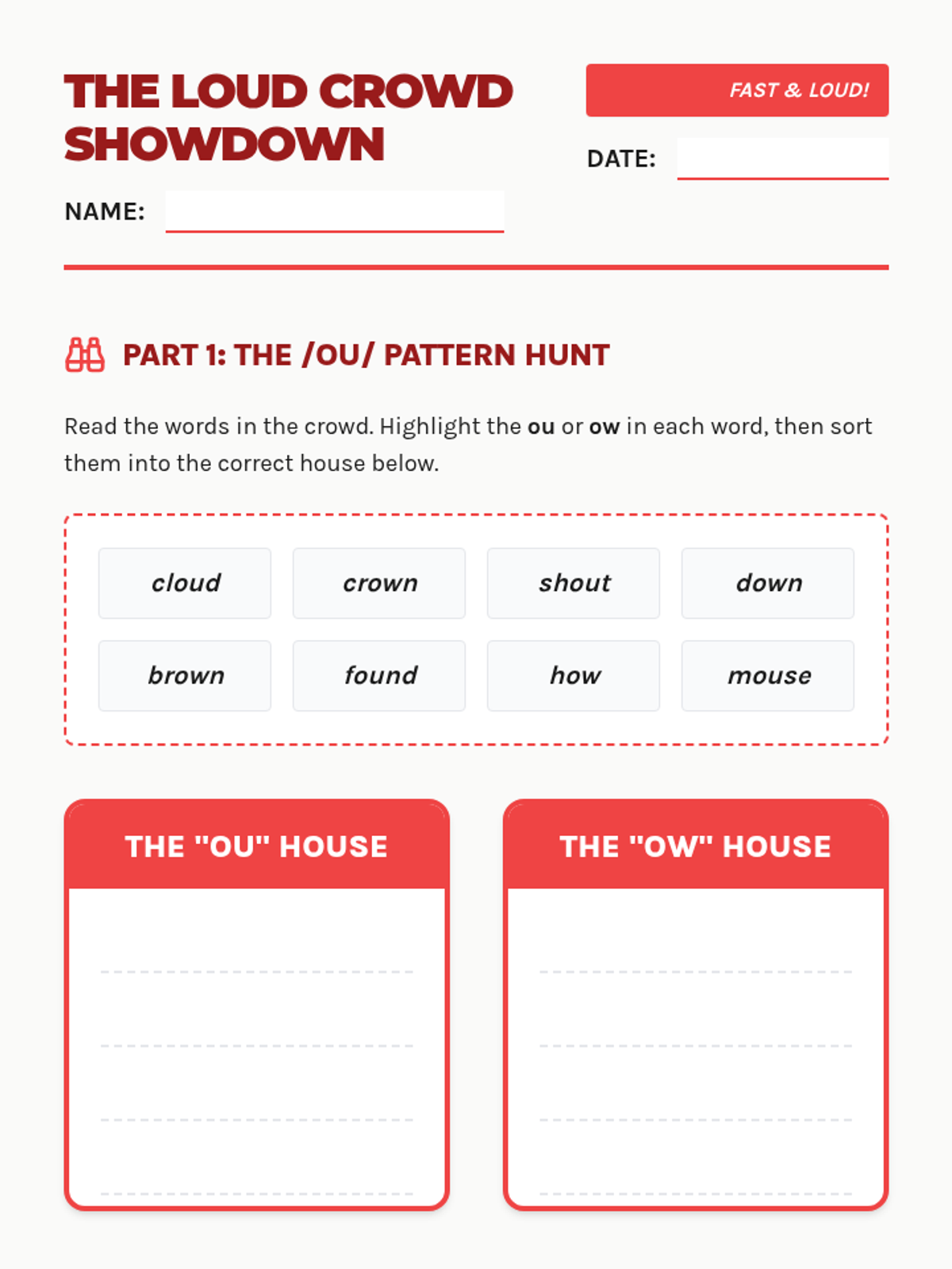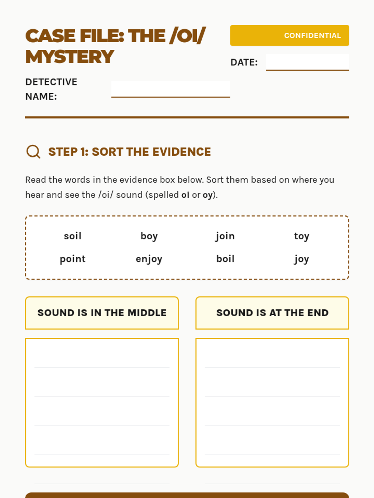 A comprehensive 3rd-grade sequence focused on mastering the diphthongs /oi/ and /ou/. Through inquiry-based word sorts, multisyllabic decoding, and contextual reading, students discover and apply orthographic generalizations to improve spelling and reading fluency.