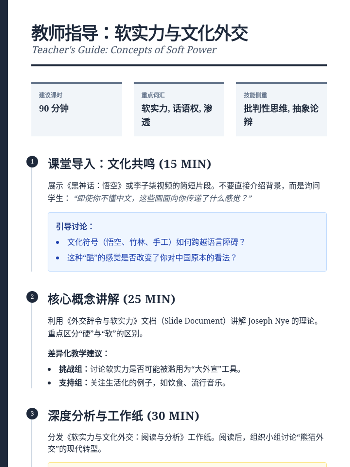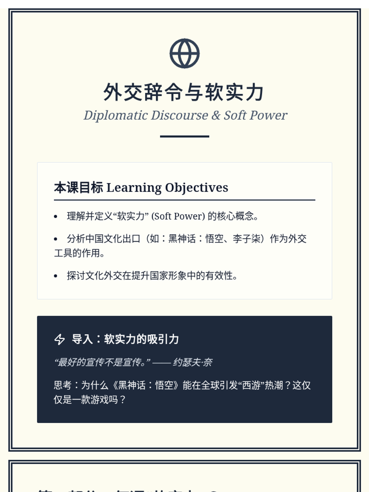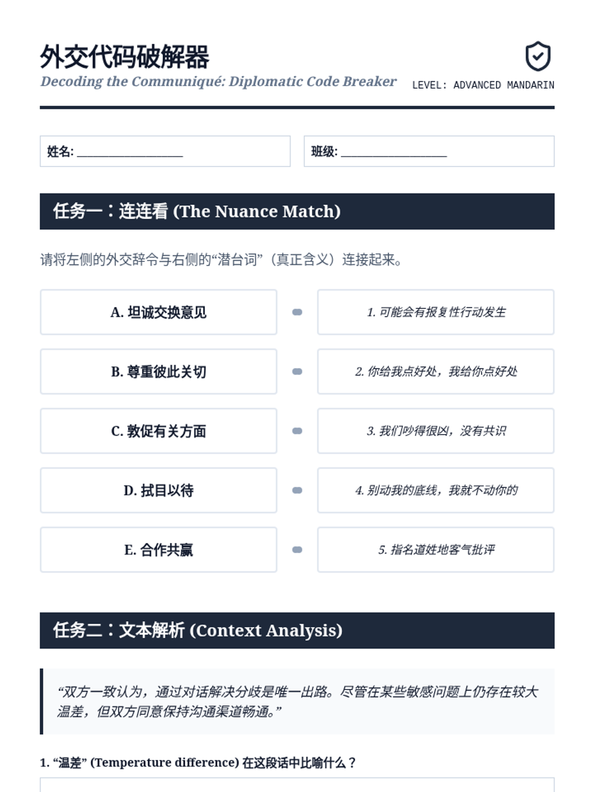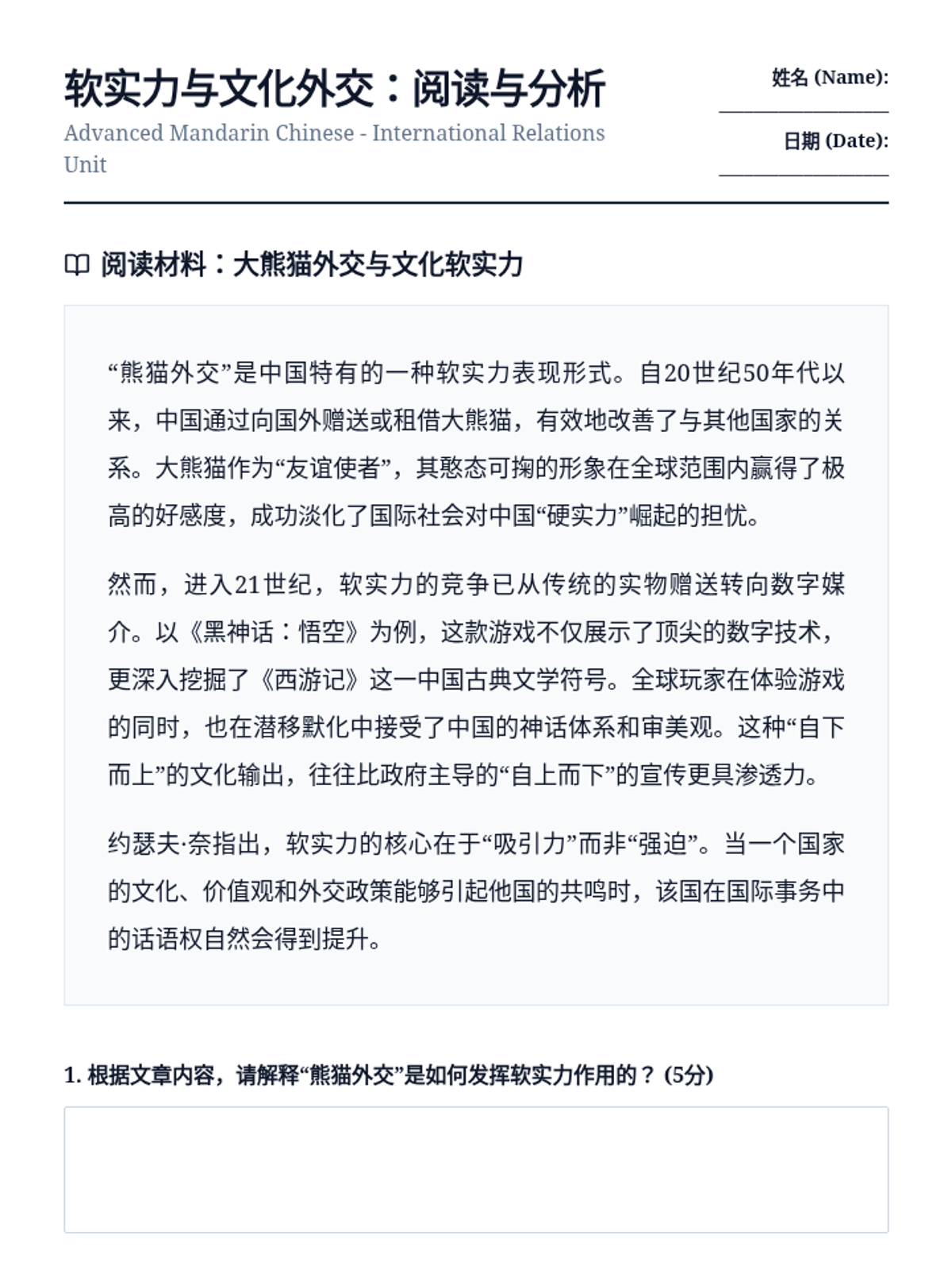 This 12th-grade Advanced Mandarin Chinese sequence explores the nuances of soft power, diplomatic protocol, and geopolitical discourse. Students analyze how language shapes international relations, decode formal diplomatic code, and participate in a mock international summit to practice high-level negotiation and public speaking.