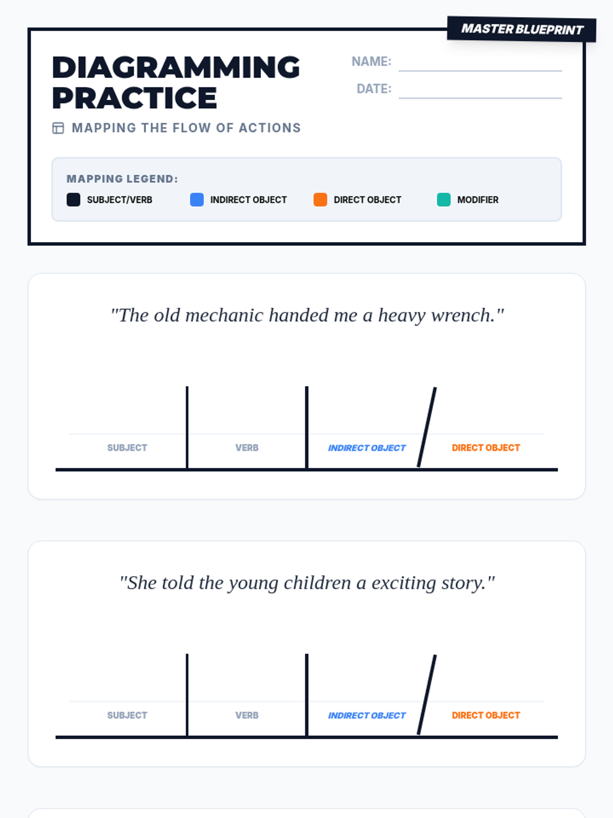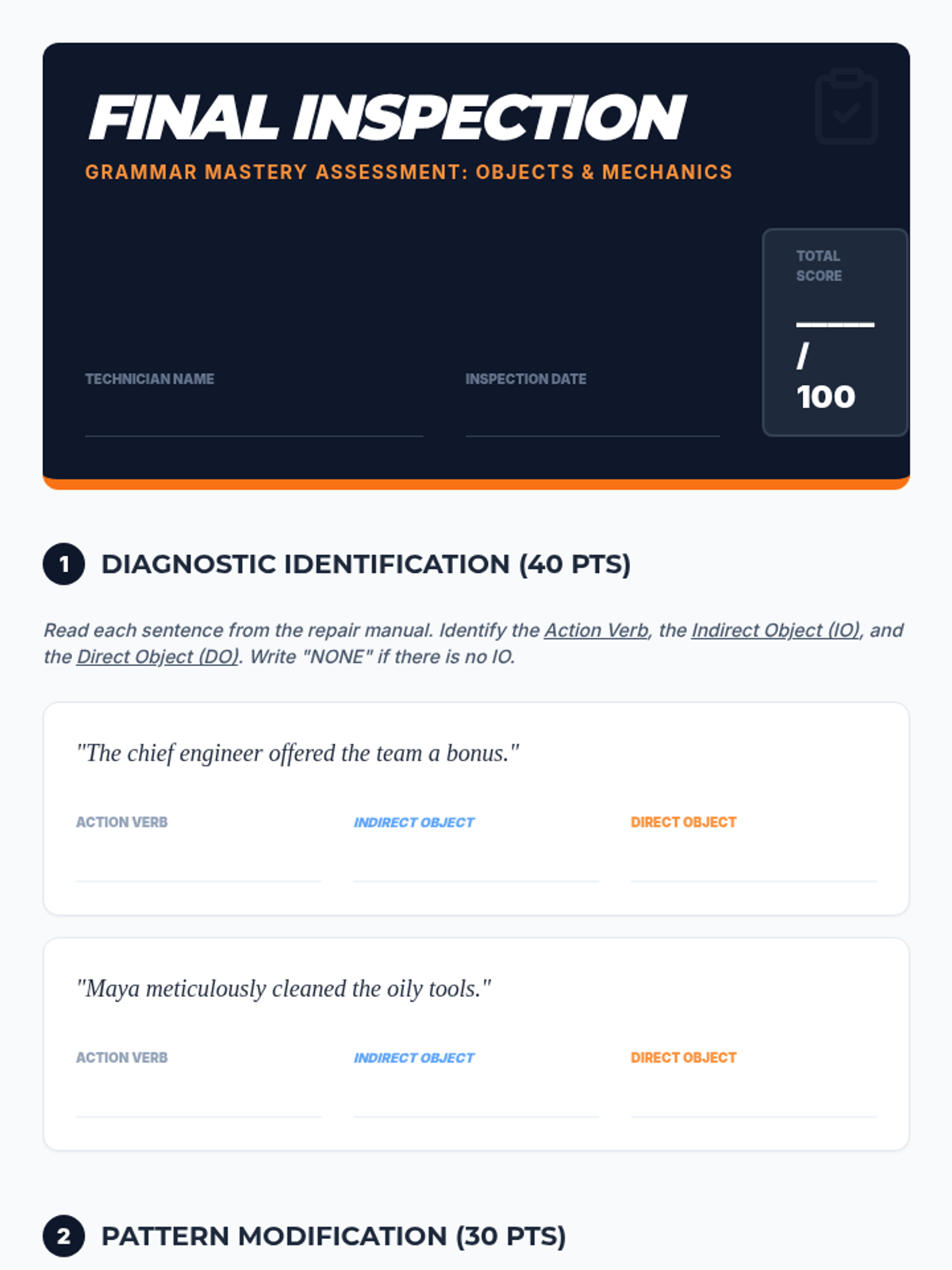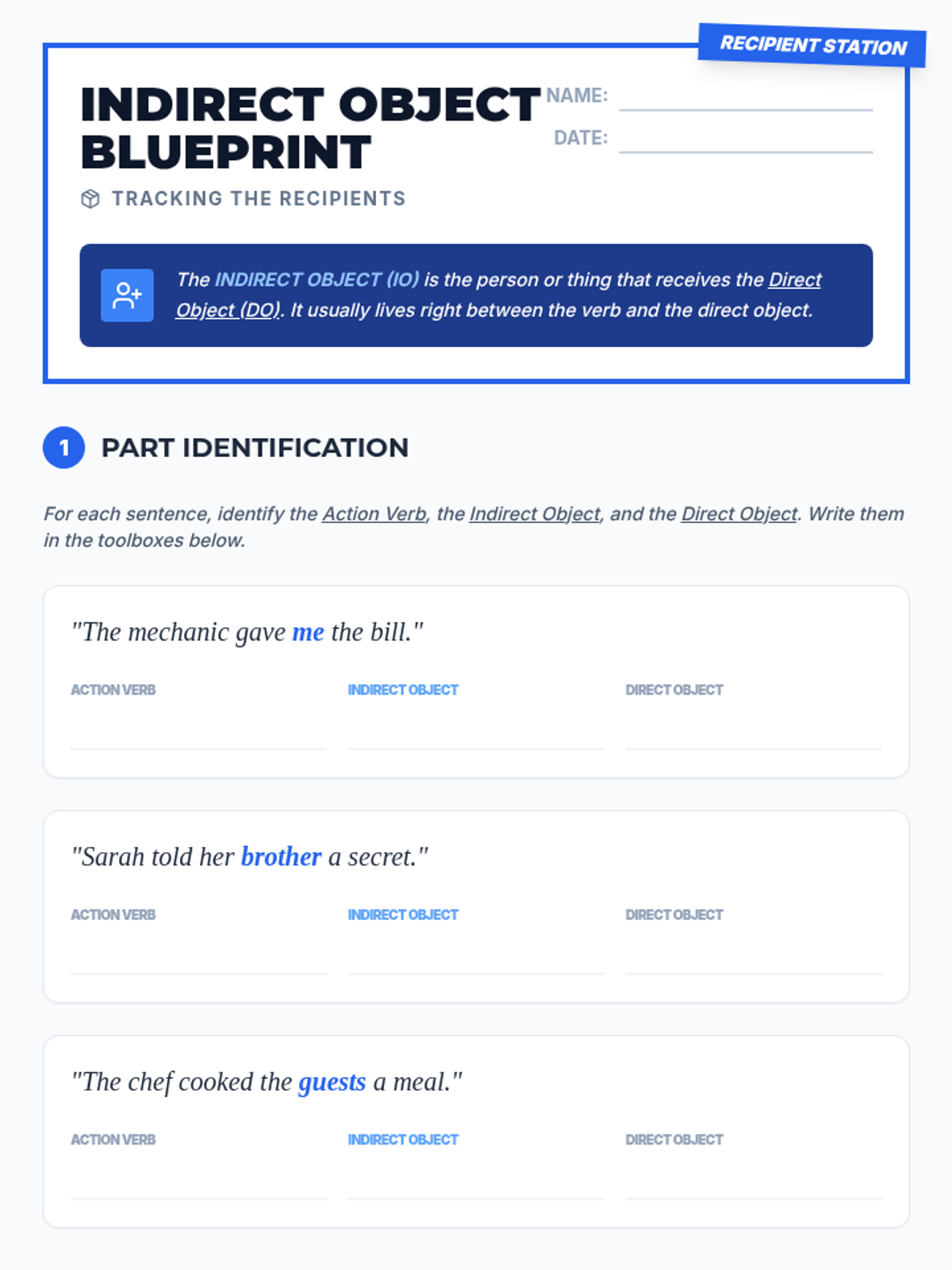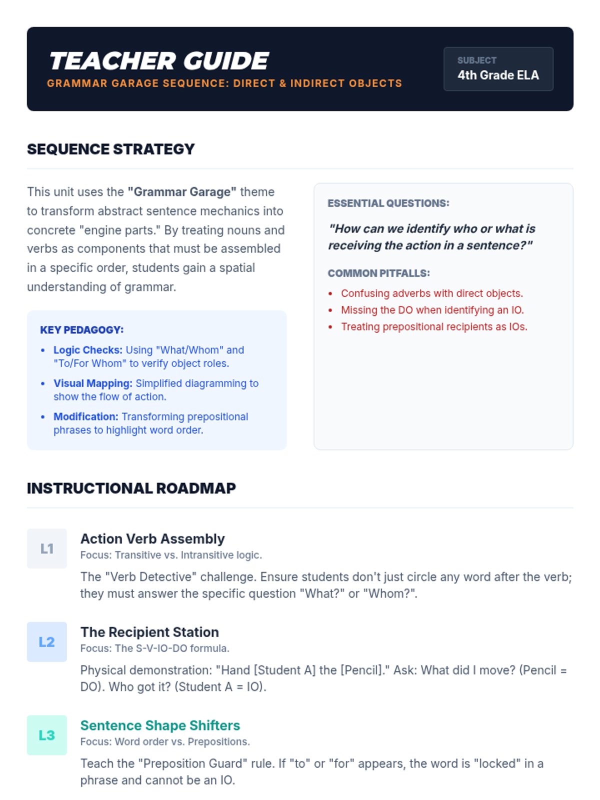 A comprehensive 4th-grade grammar sequence focusing on the identification and differentiation of direct and indirect objects. Using a 'Grammar Garage' theme, students build, repair, and map sentence structures through five hands-on lessons.