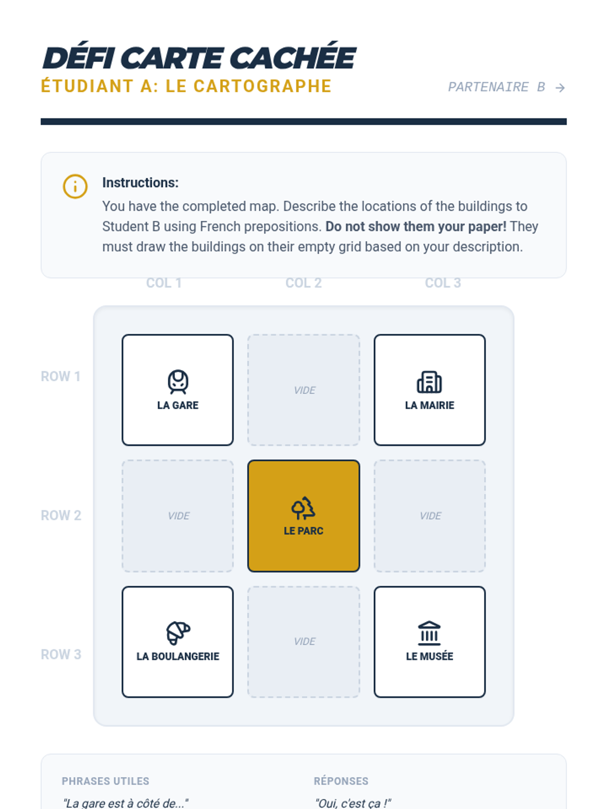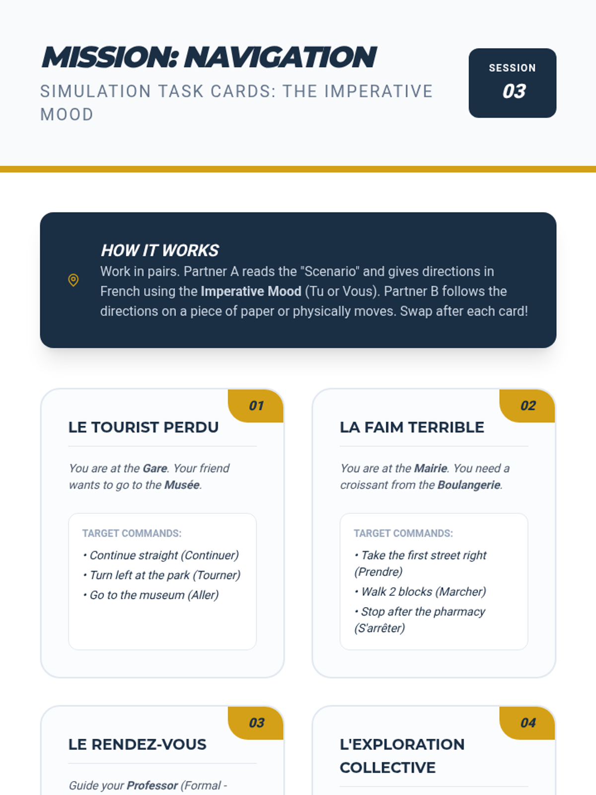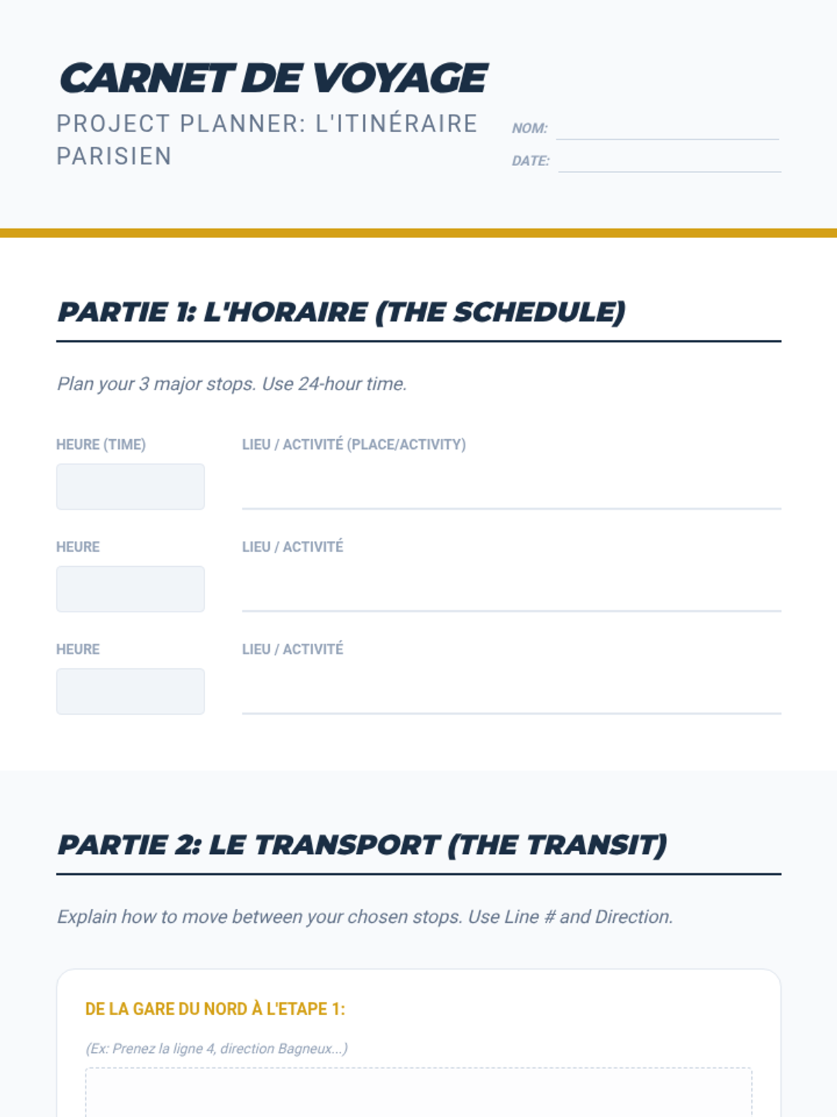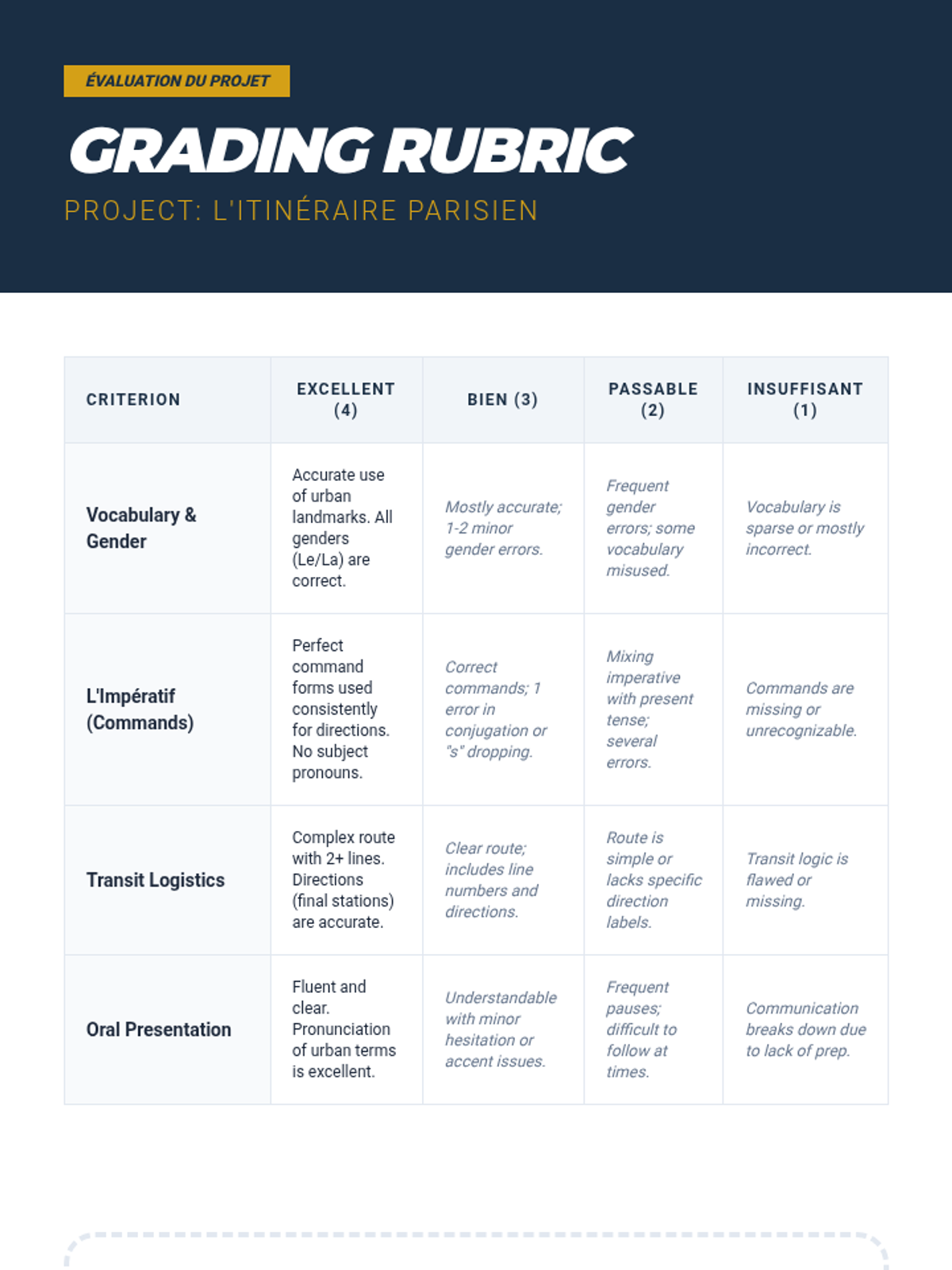 This sequence teaches undergraduate students how to navigate French cities and public transportation systems. Students will progress from basic vocabulary for urban places to mastering prepositions, the imperative mood for directions, and complex transit logistics, culminating in a comprehensive Parisian travel project.
