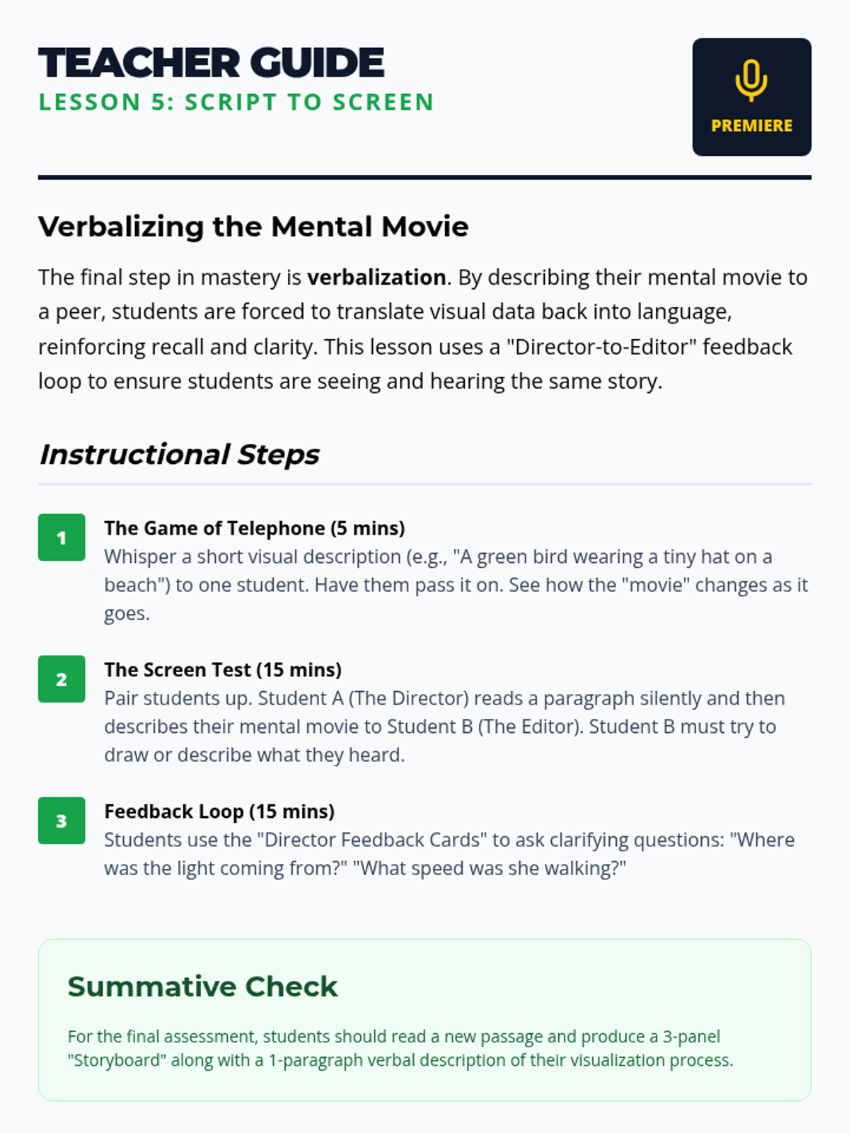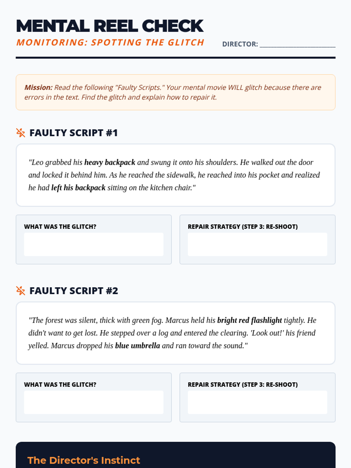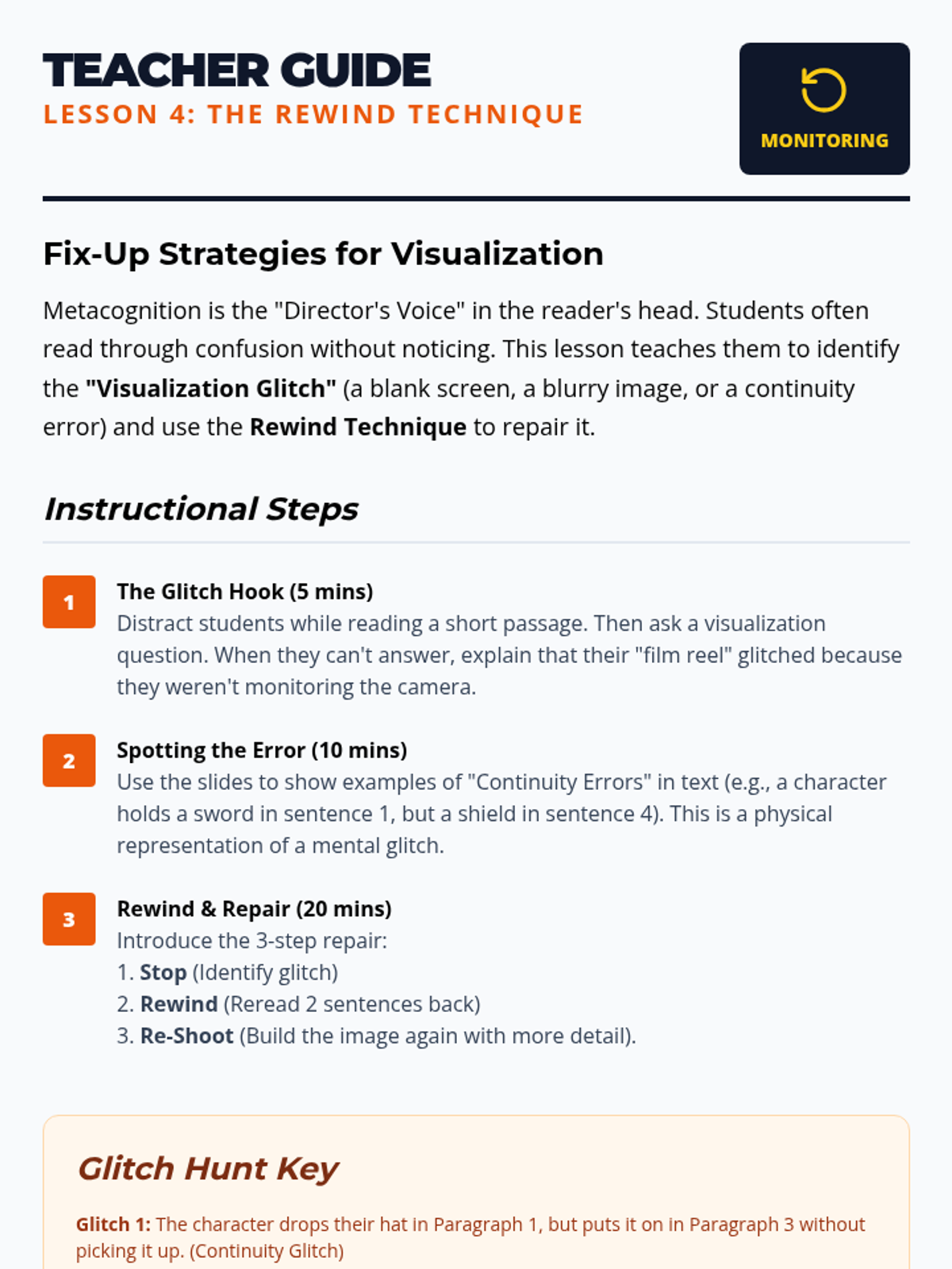 A visualization strategy sequence for 10th-grade students using a 'Director's Chair' metaphor to improve reading comprehension. Students learn to create and maintain a 'mental movie' of text, tracking character movement, pacing, and time jumps while monitoring for comprehension 'glitches'.