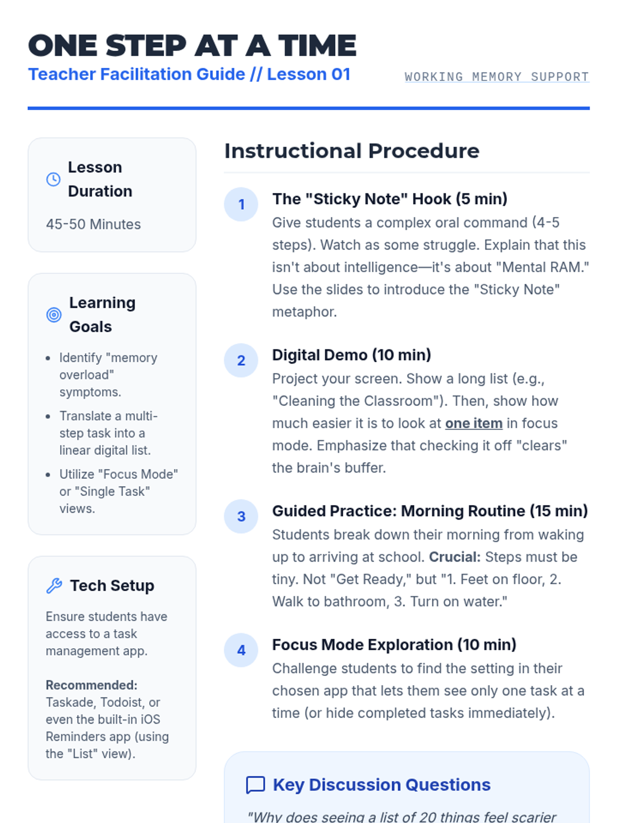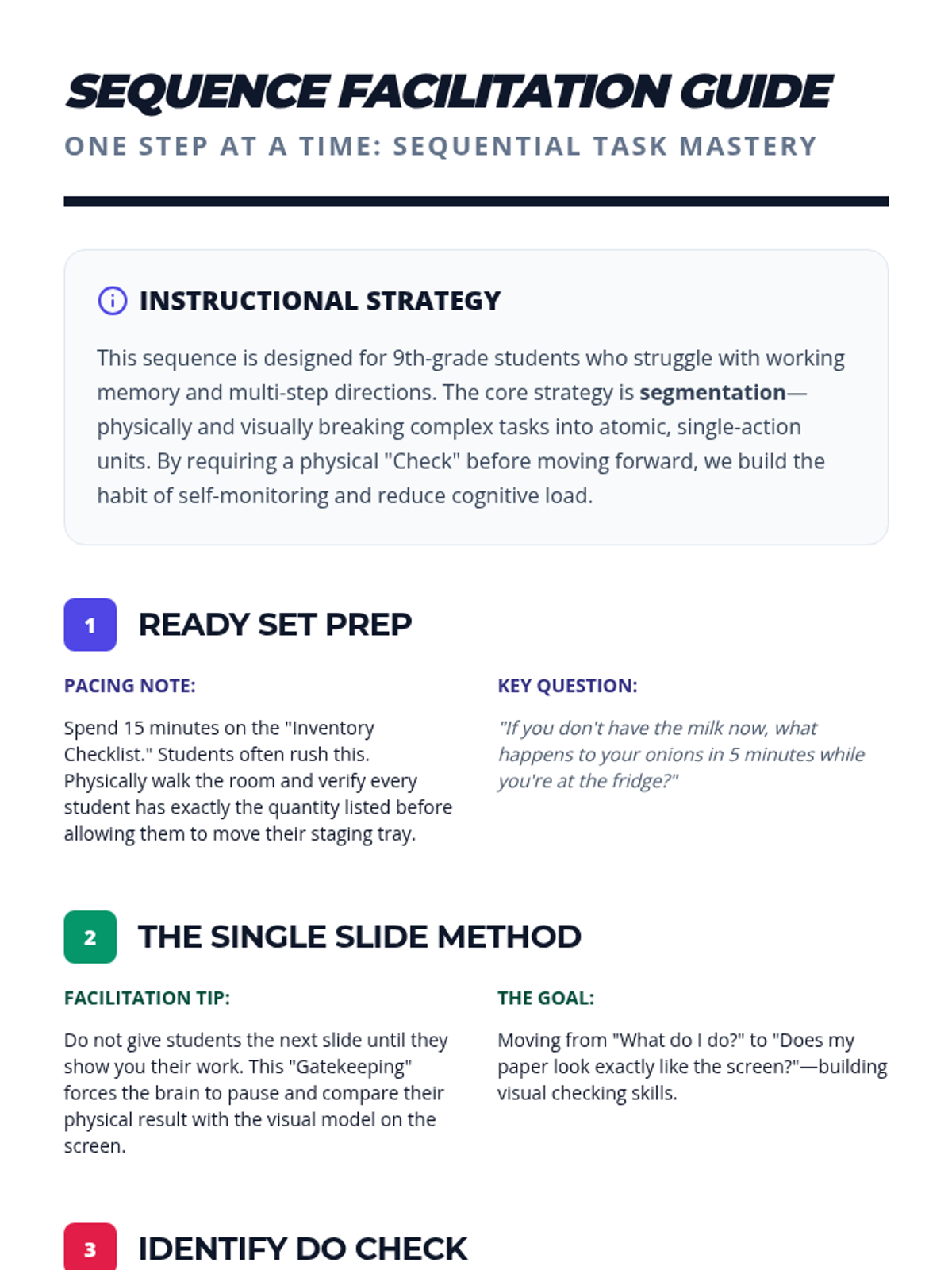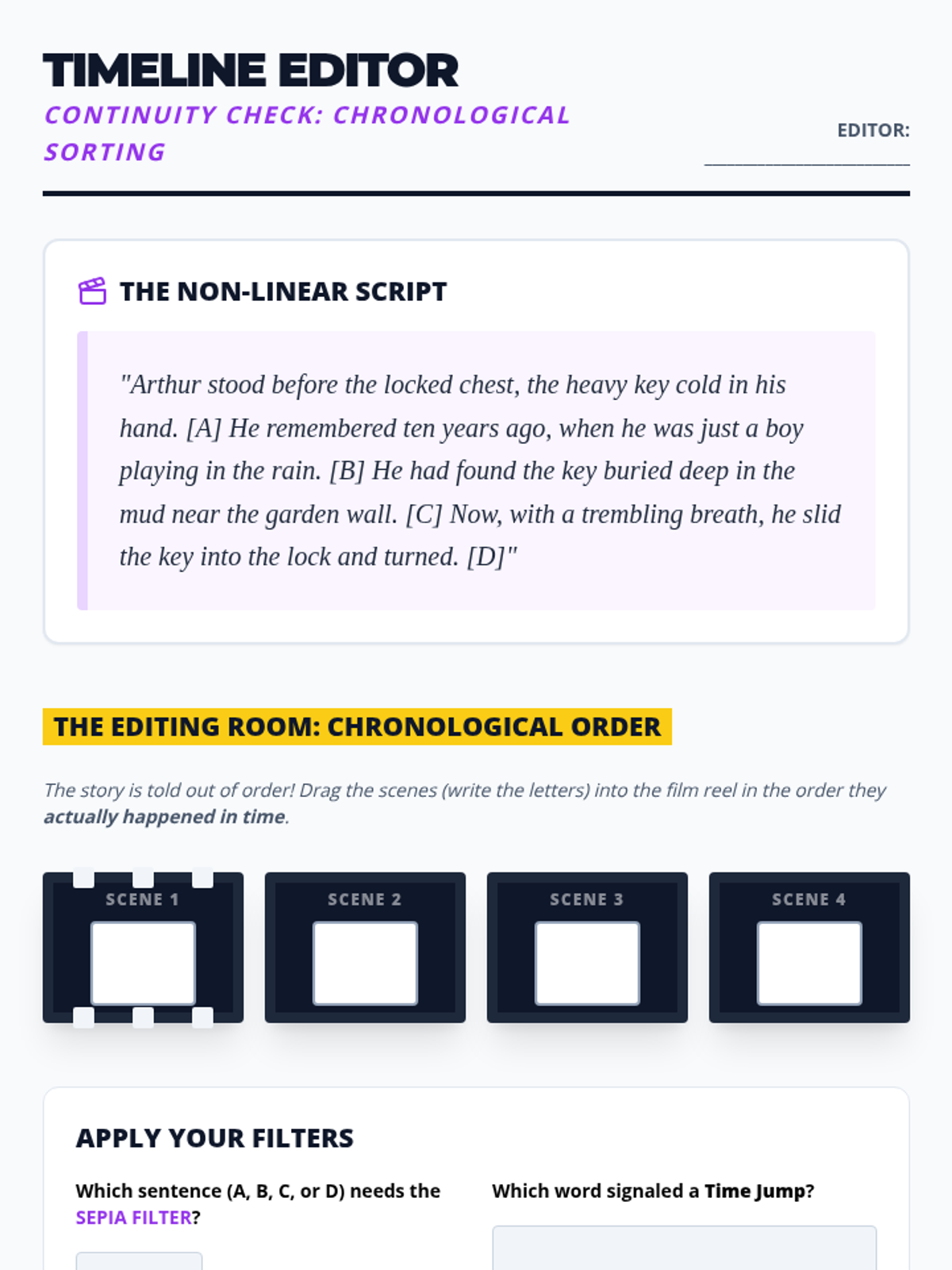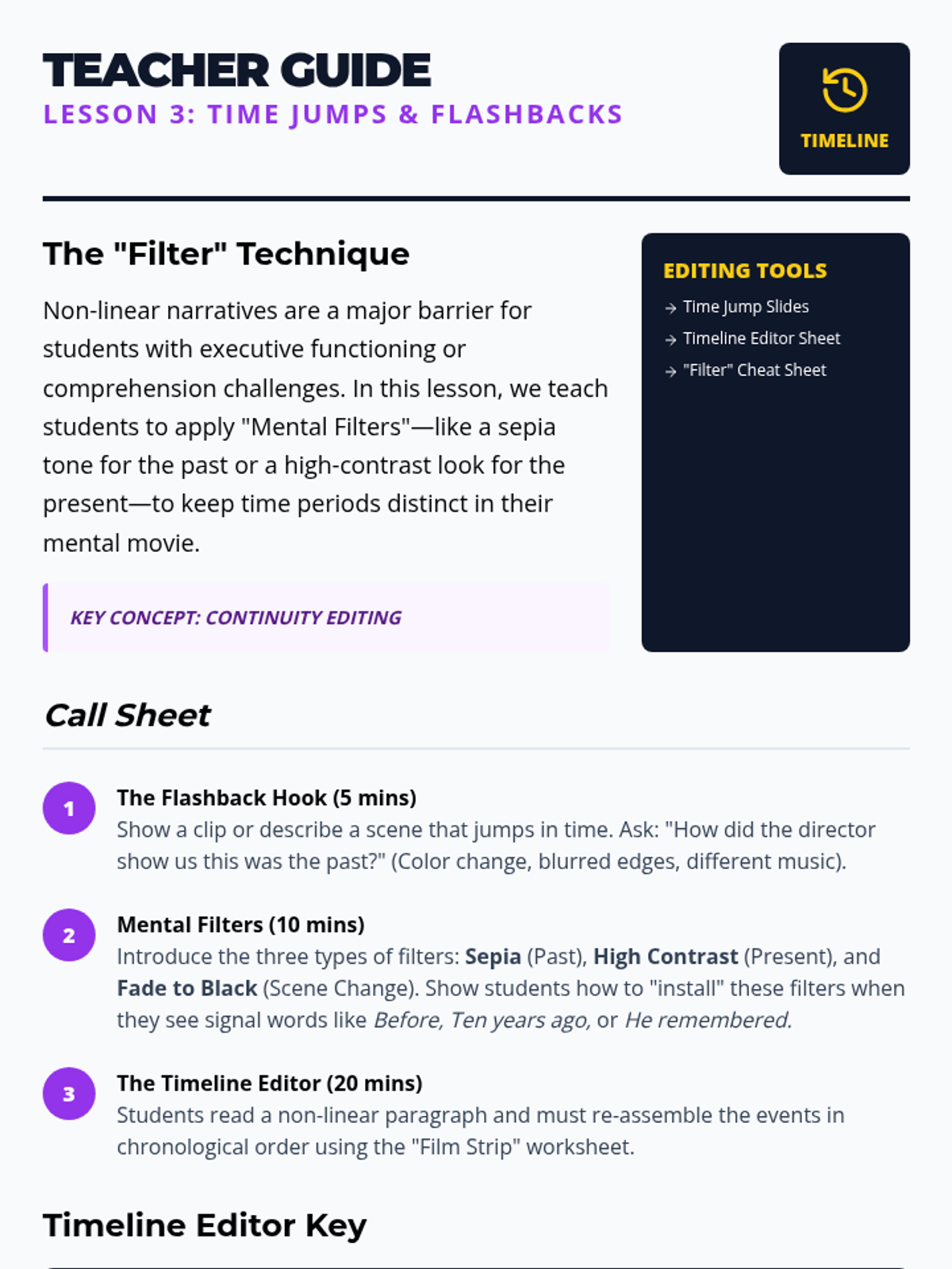A visualization strategy sequence for 10th-grade students using a 'Director's Chair' metaphor to improve reading comprehension. Students learn to create and maintain a 'mental movie' of text, tracking character movement, pacing, and time jumps while monitoring for comprehension 'glitches'.