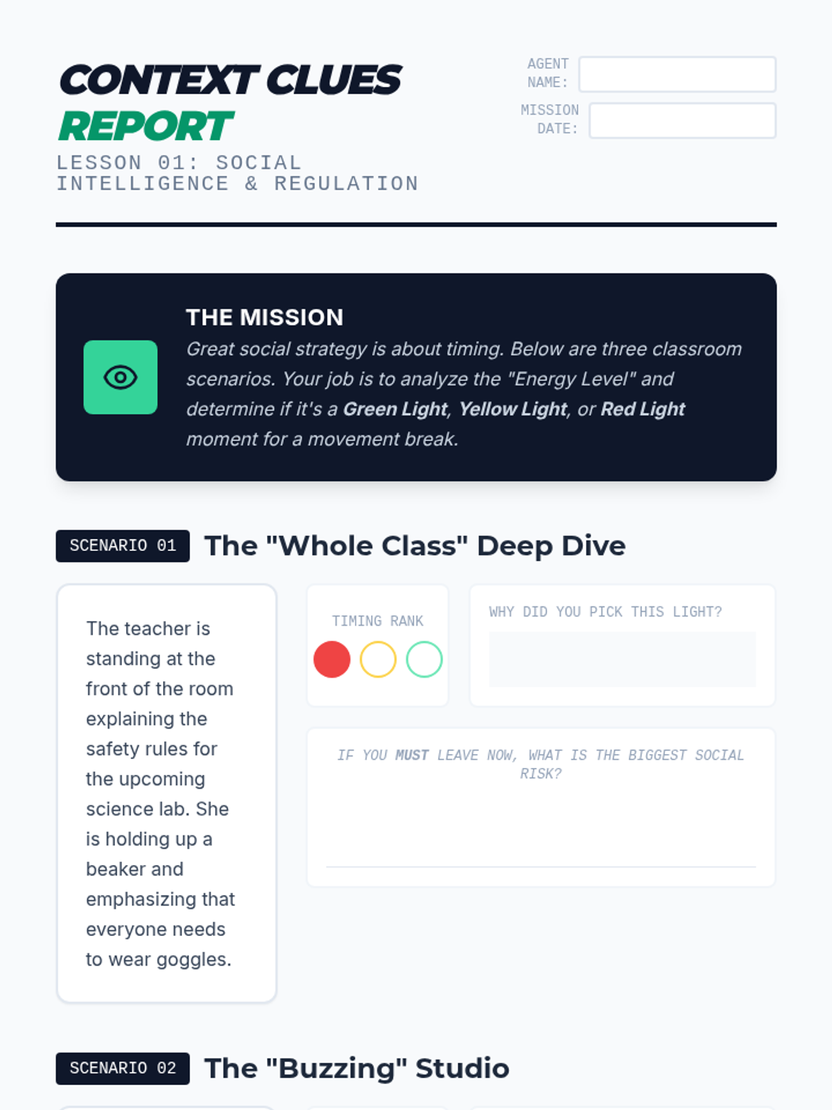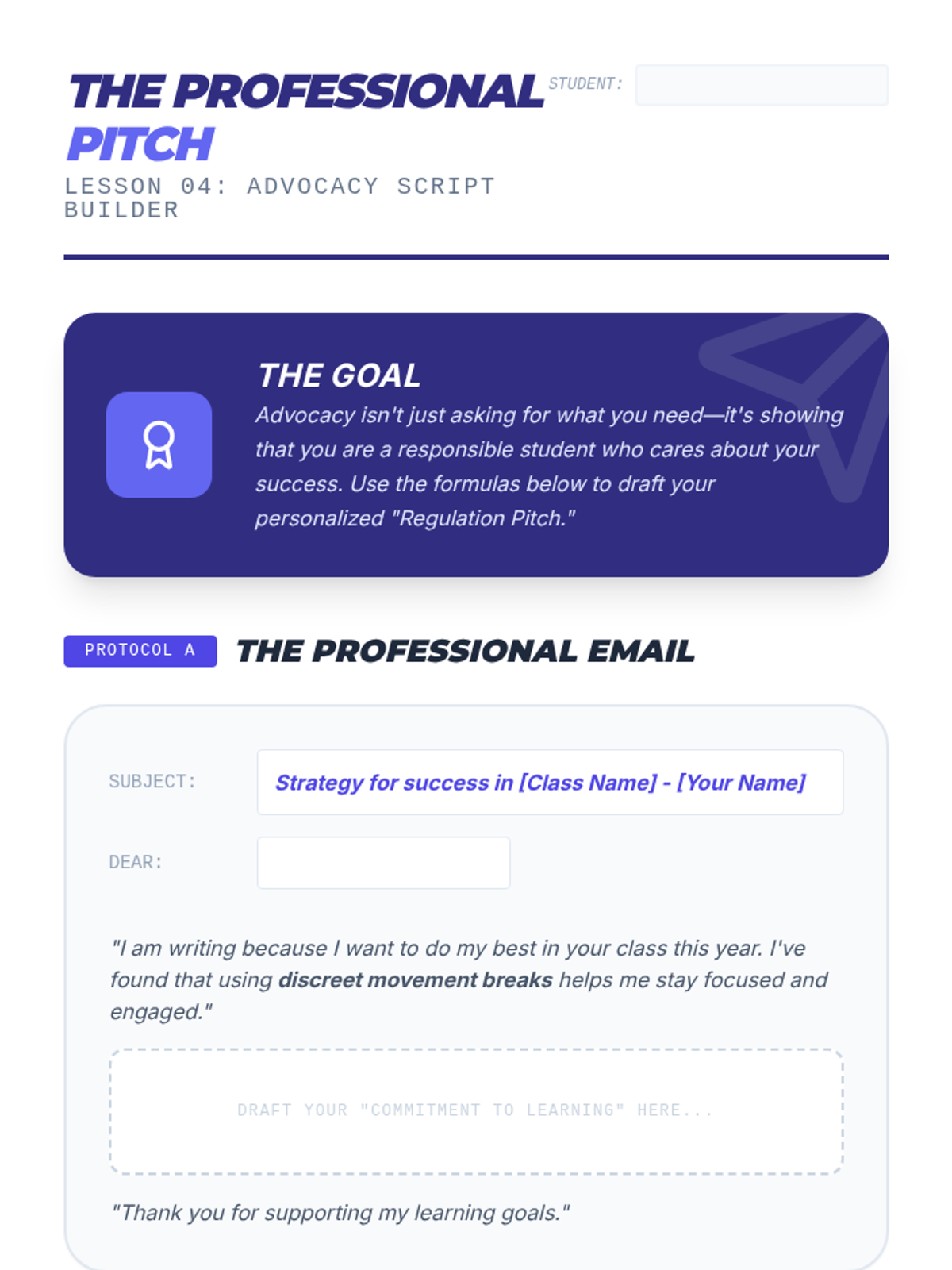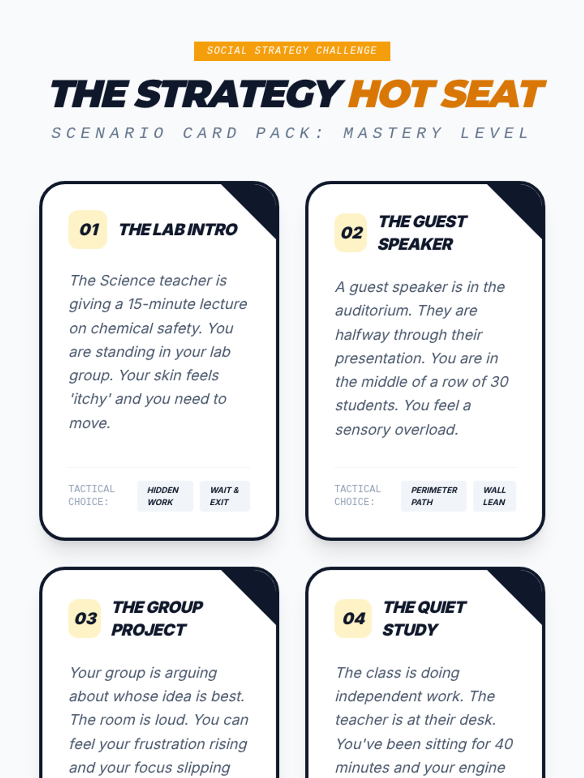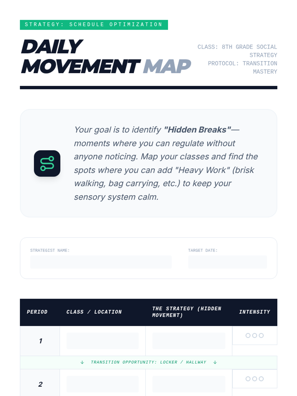 A comprehensive sequence designed for 8th-grade students to master sensory regulation in social settings. The curriculum focuses on 'Socially Smart' strategies that empower students to manage their sensory needs discreetly, minimizing stigma and maximizing academic engagement.