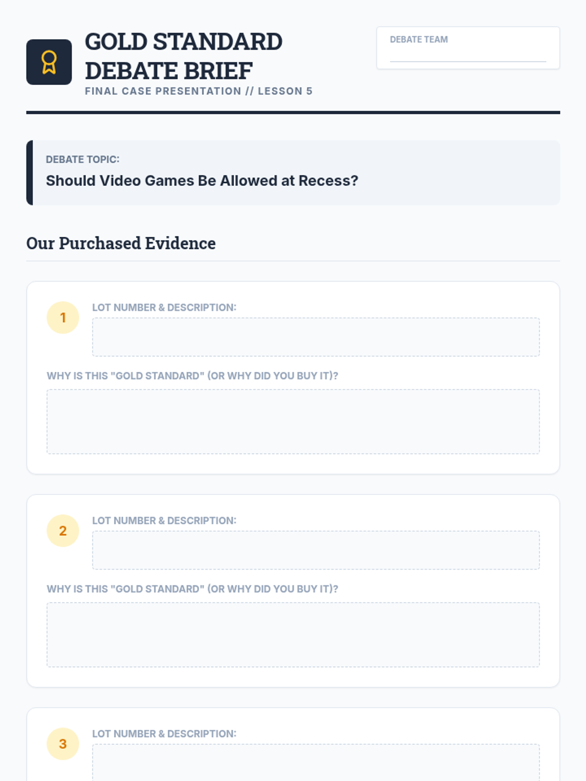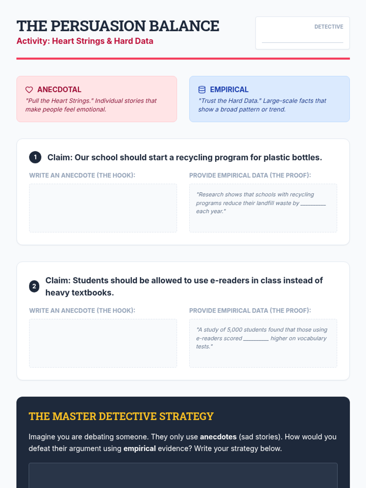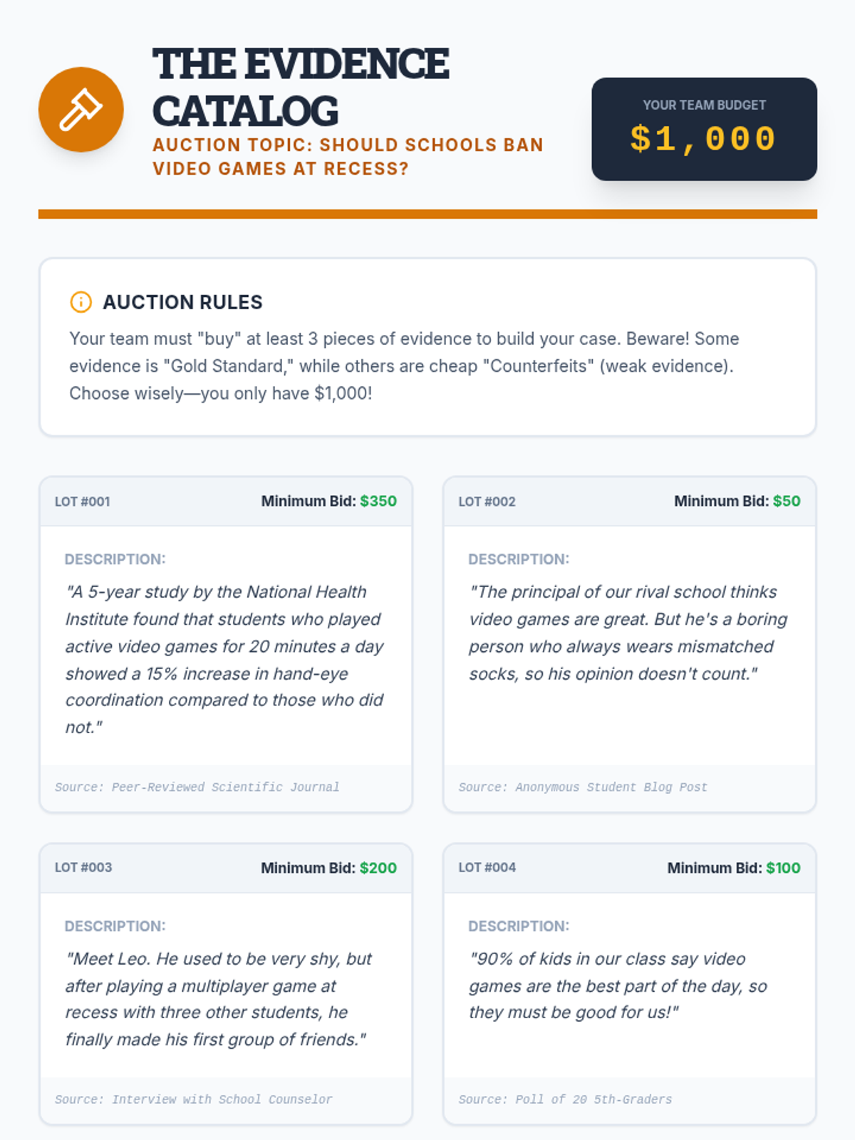 A 5th-grade ELA sequence focused on distinguishing between strong and weak evidence for debate. Students learn to categorize information, evaluate statistics, compare anecdotal and empirical data, identify logical fallacies, and select 'gold standard' evidence.