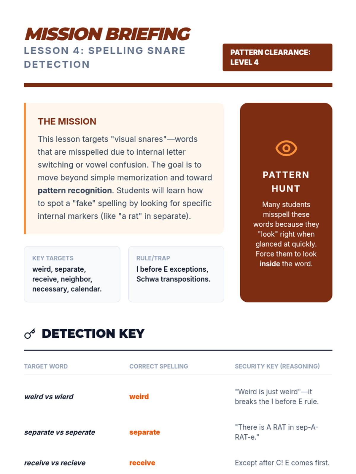 A high-energy, game-based sequence for 6th-grade students focusing on homophones, contractions, and tricky spelling patterns like the schwa sound. Students use visual mnemonics and context-based strategies to master frequent spelling errors.
