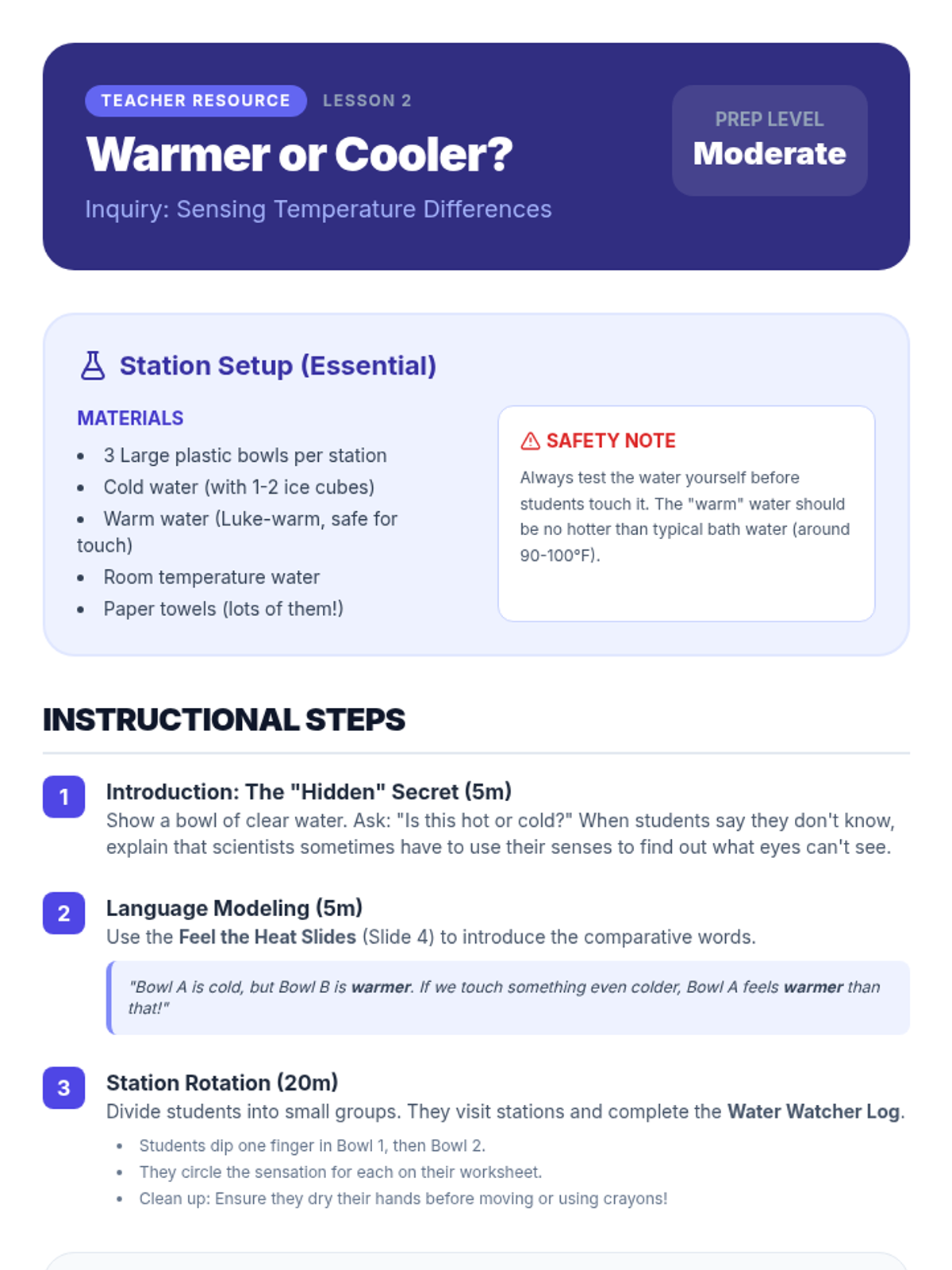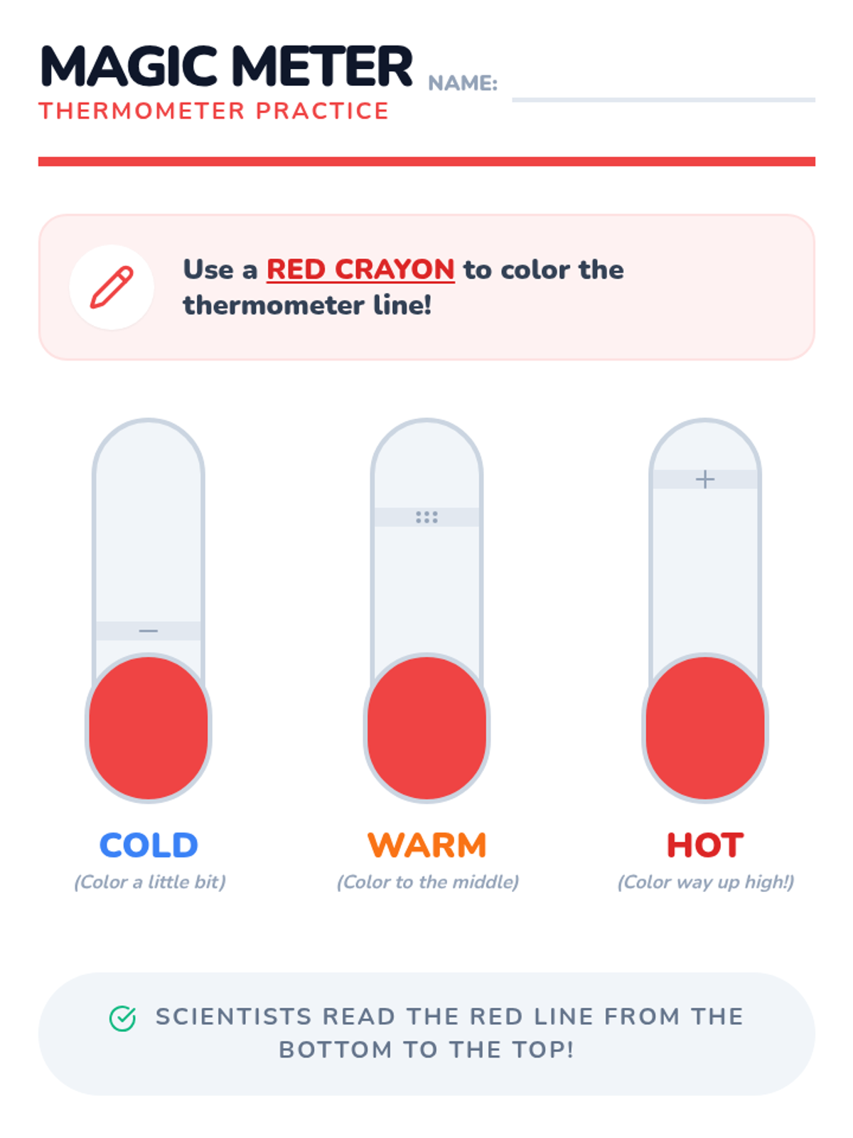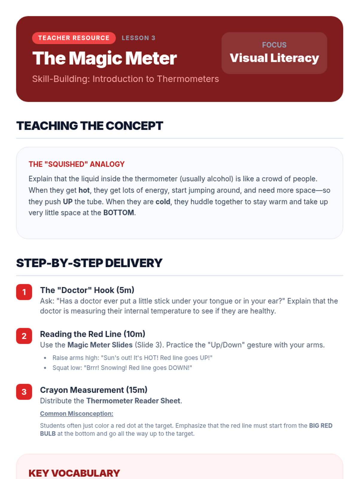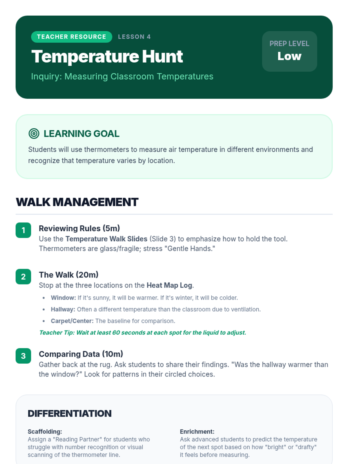 A Kindergarten sequence focused on temperature vocabulary, sensing differences, using thermometers, and identifying heat sources safely. Students transition from sensory observation to scientific measurement.