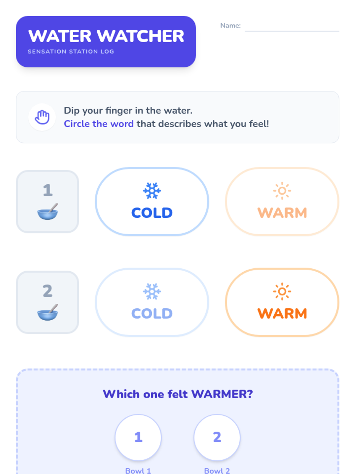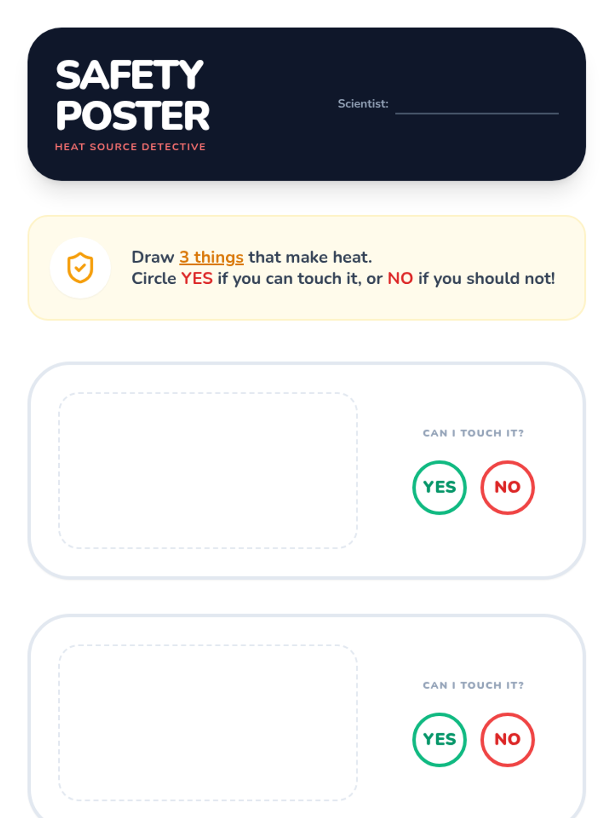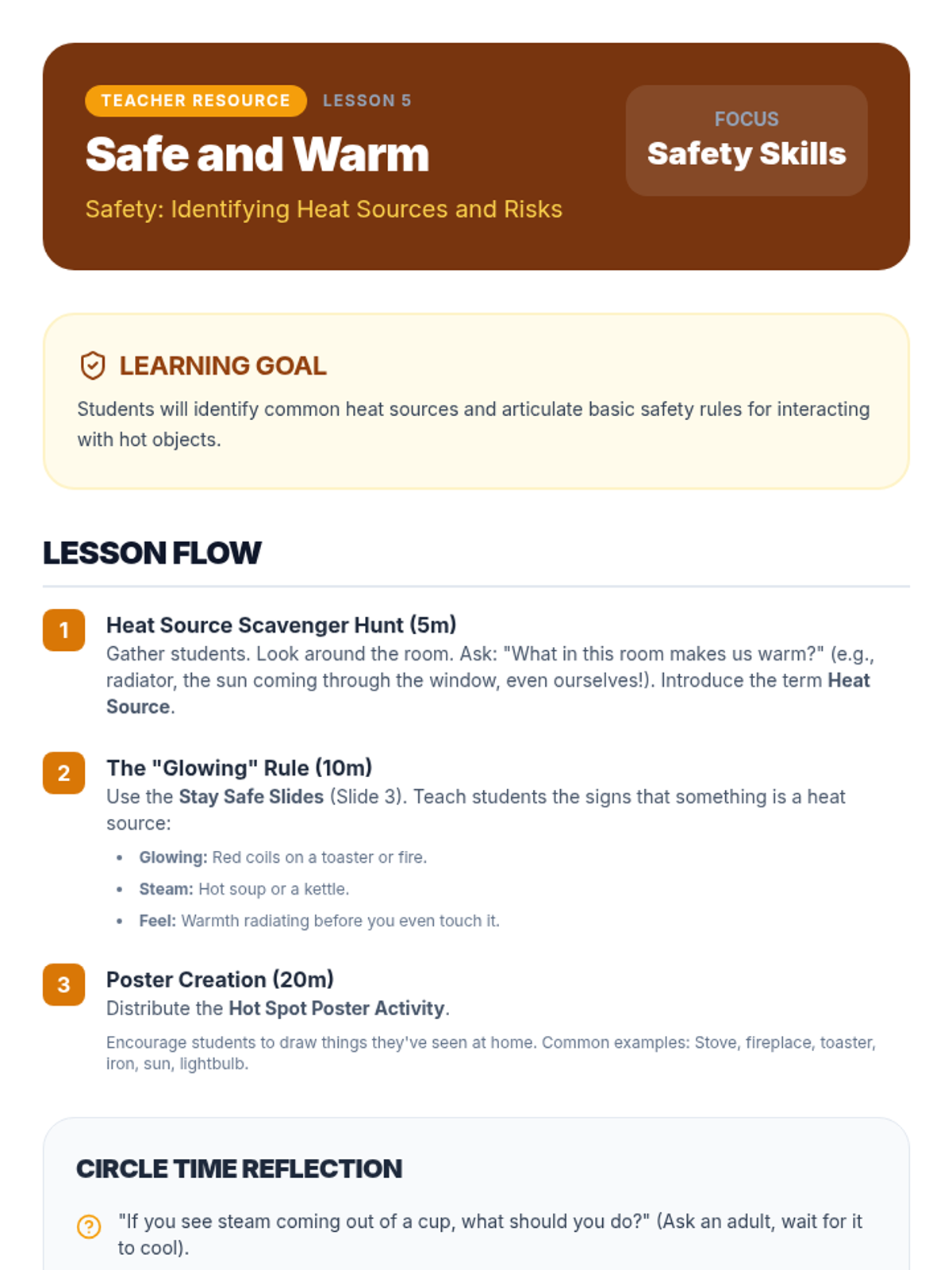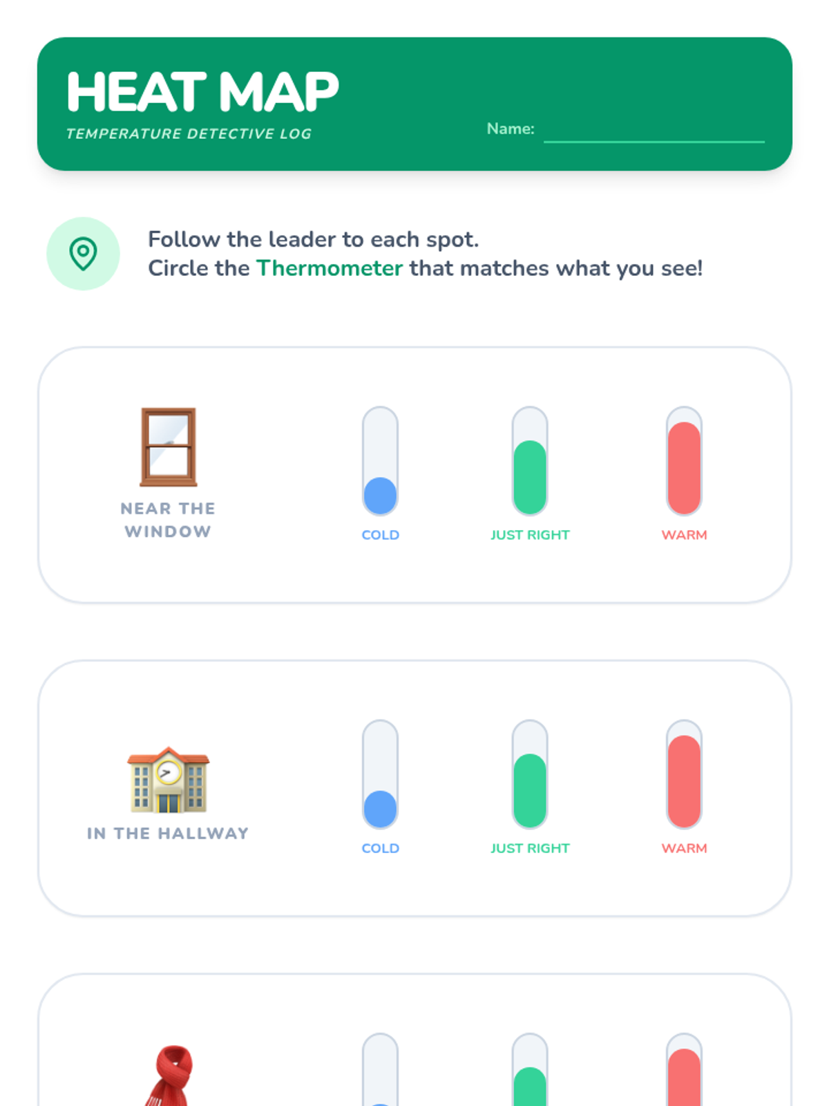 A Kindergarten sequence focused on temperature vocabulary, sensing differences, using thermometers, and identifying heat sources safely. Students transition from sensory observation to scientific measurement.