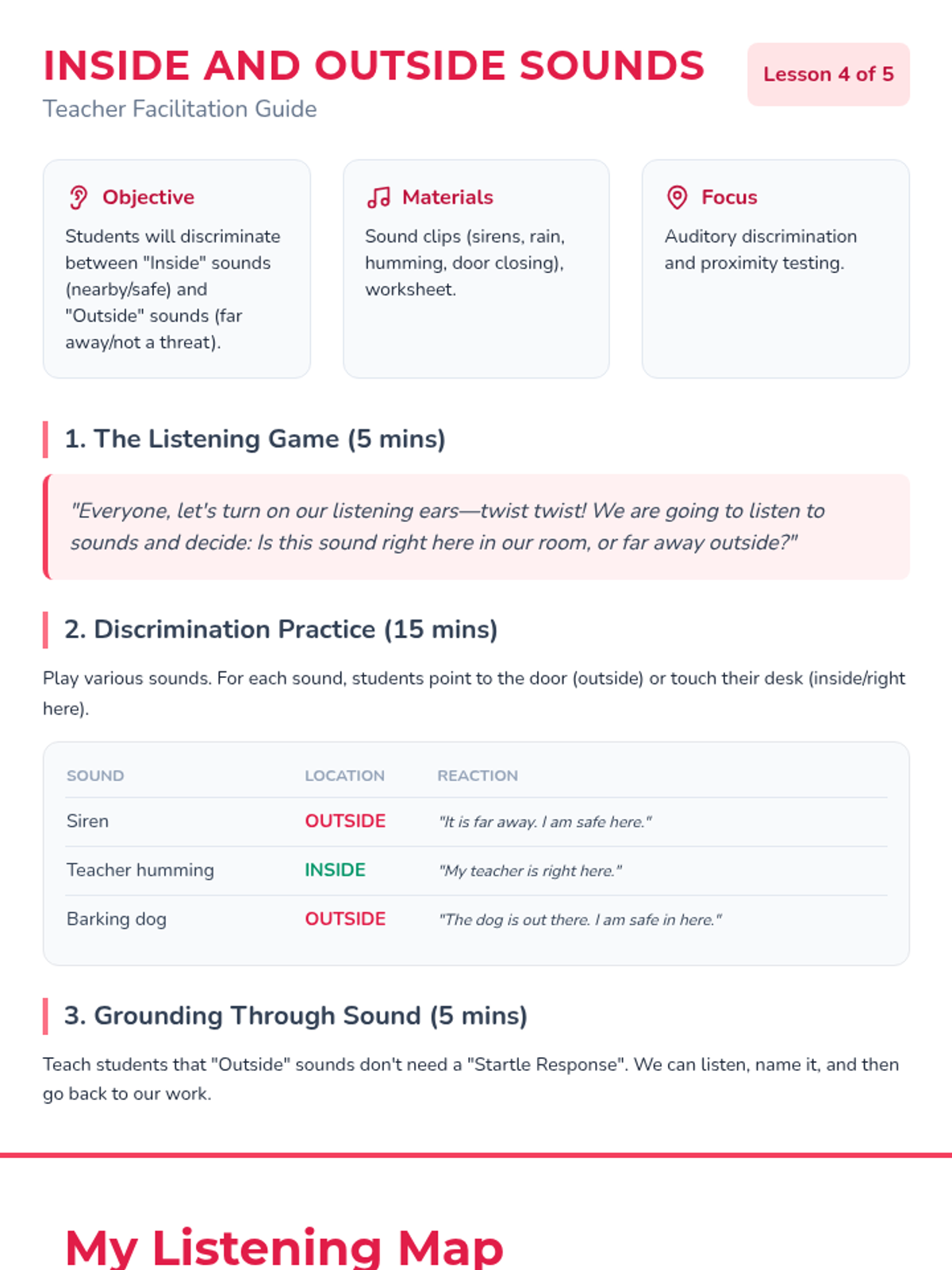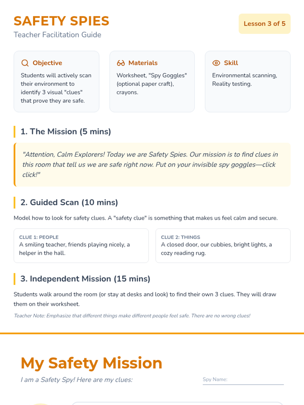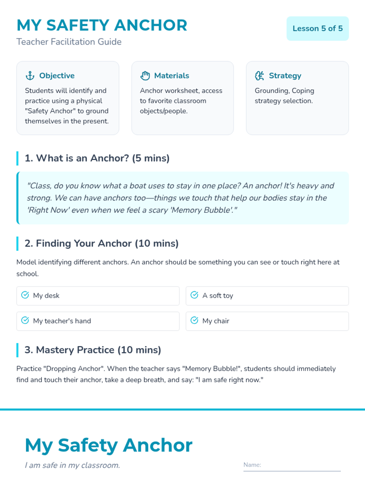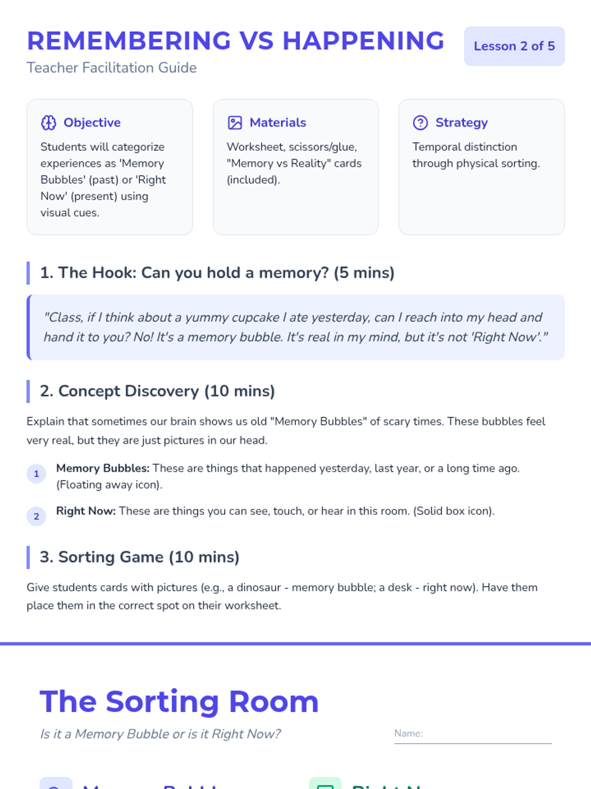 A gentle, sensory-based sequence for Kindergarteners to distinguish between past trauma triggers and present safety. Students learn to observe their environment, categorize memories versus reality, and use grounding techniques to feel safe 'right now'.