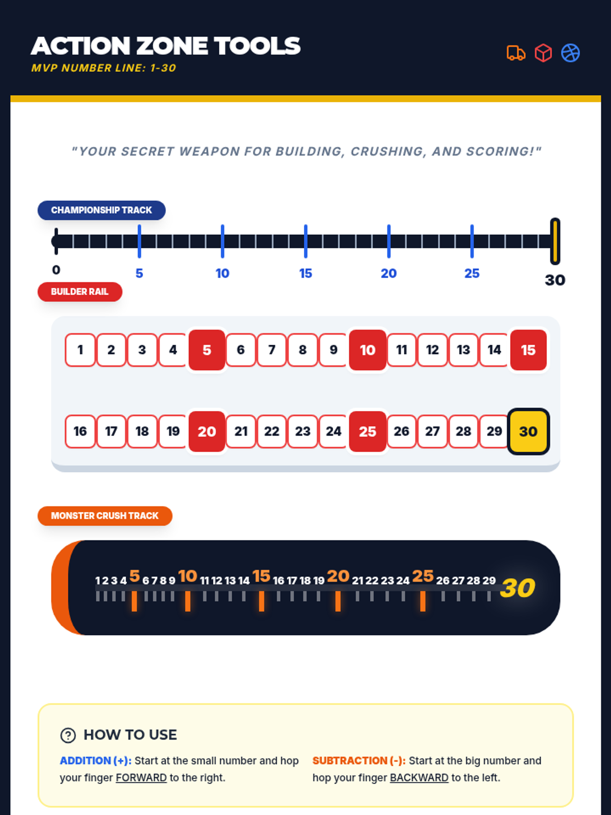 A high-energy math unit combining LEGOs, Monster Trucks, and the Golden State Warriors. Students master identifying operations (+/-), writing number sentences, and solving on number lines up to 30 using the 'I Do, We Do, You Do' model.