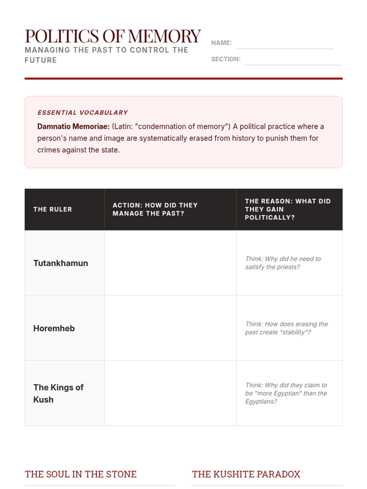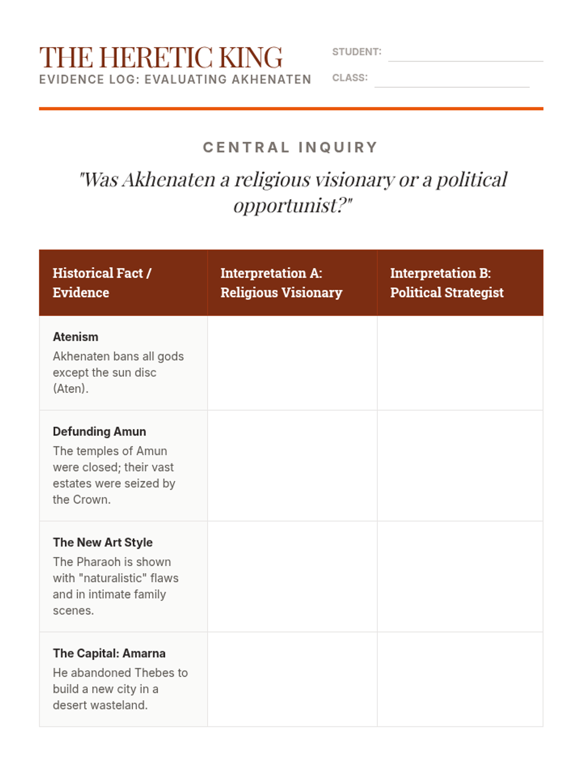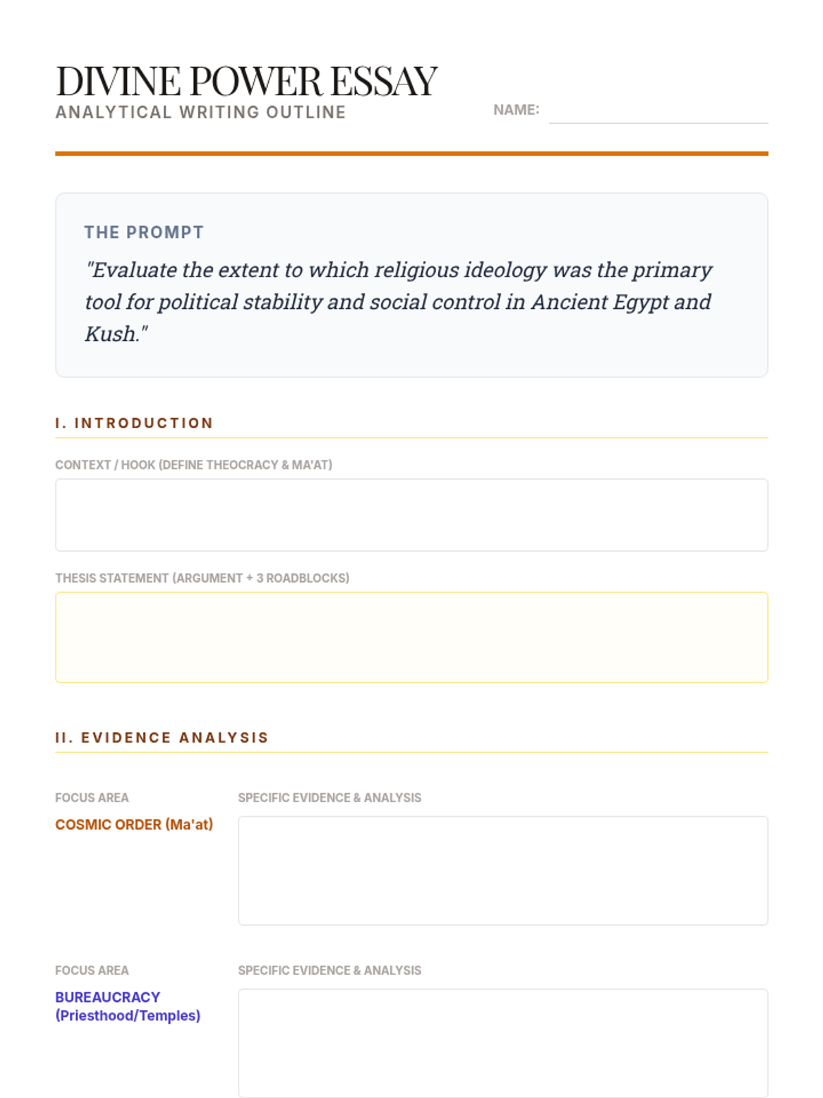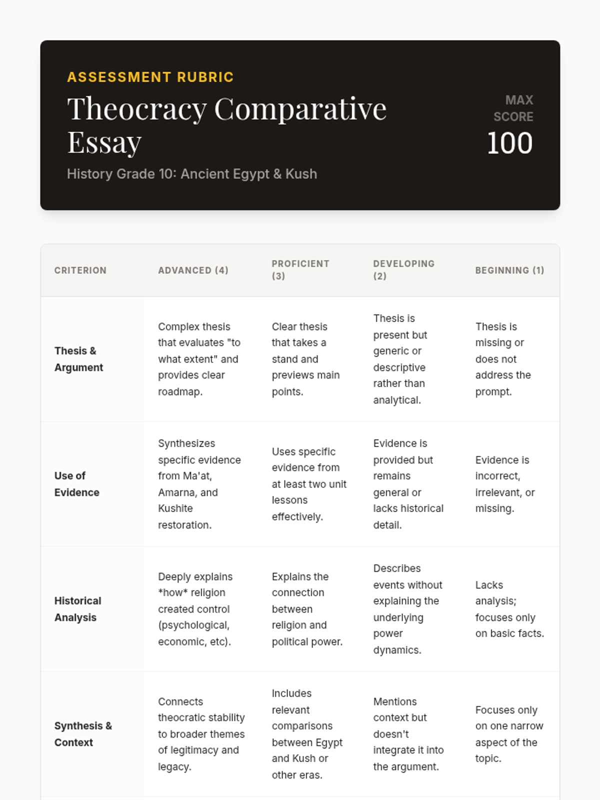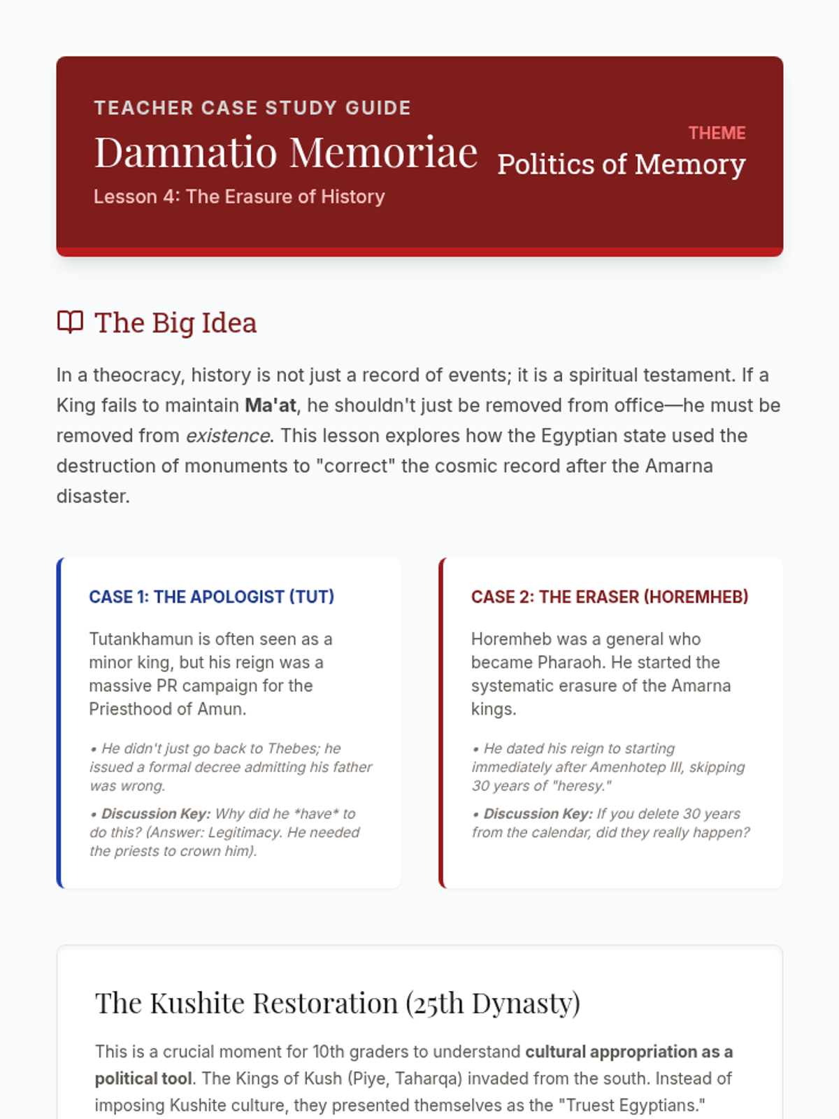 A 10th-grade history sequence examining how religious ideology, specifically the concept of Ma'at and divine kingship, legitimized political power in Ancient Egypt and Kush. Students analyze the standard theocratic model, the crisis of the Amarna Period, and the subsequent restoration of order.