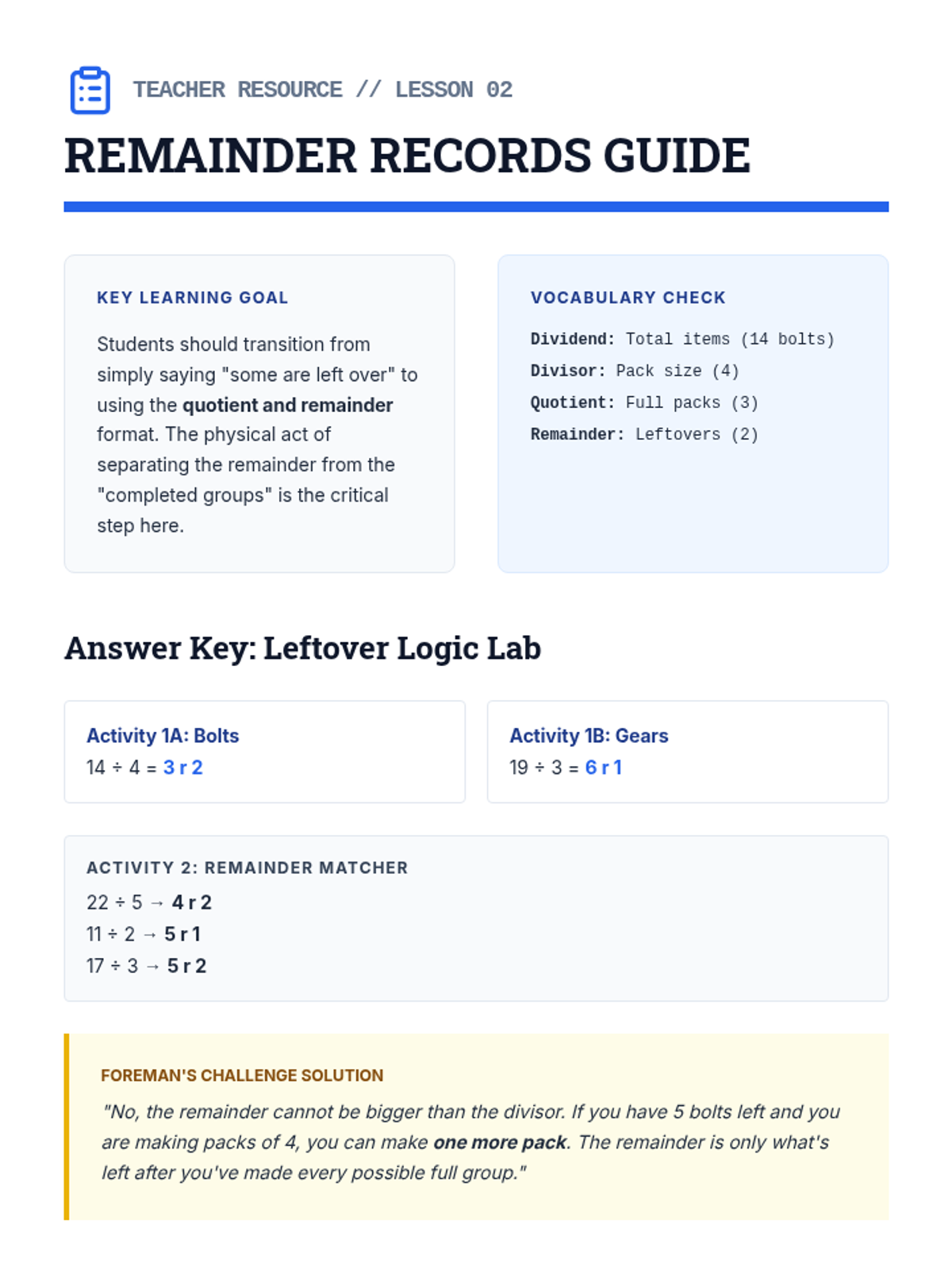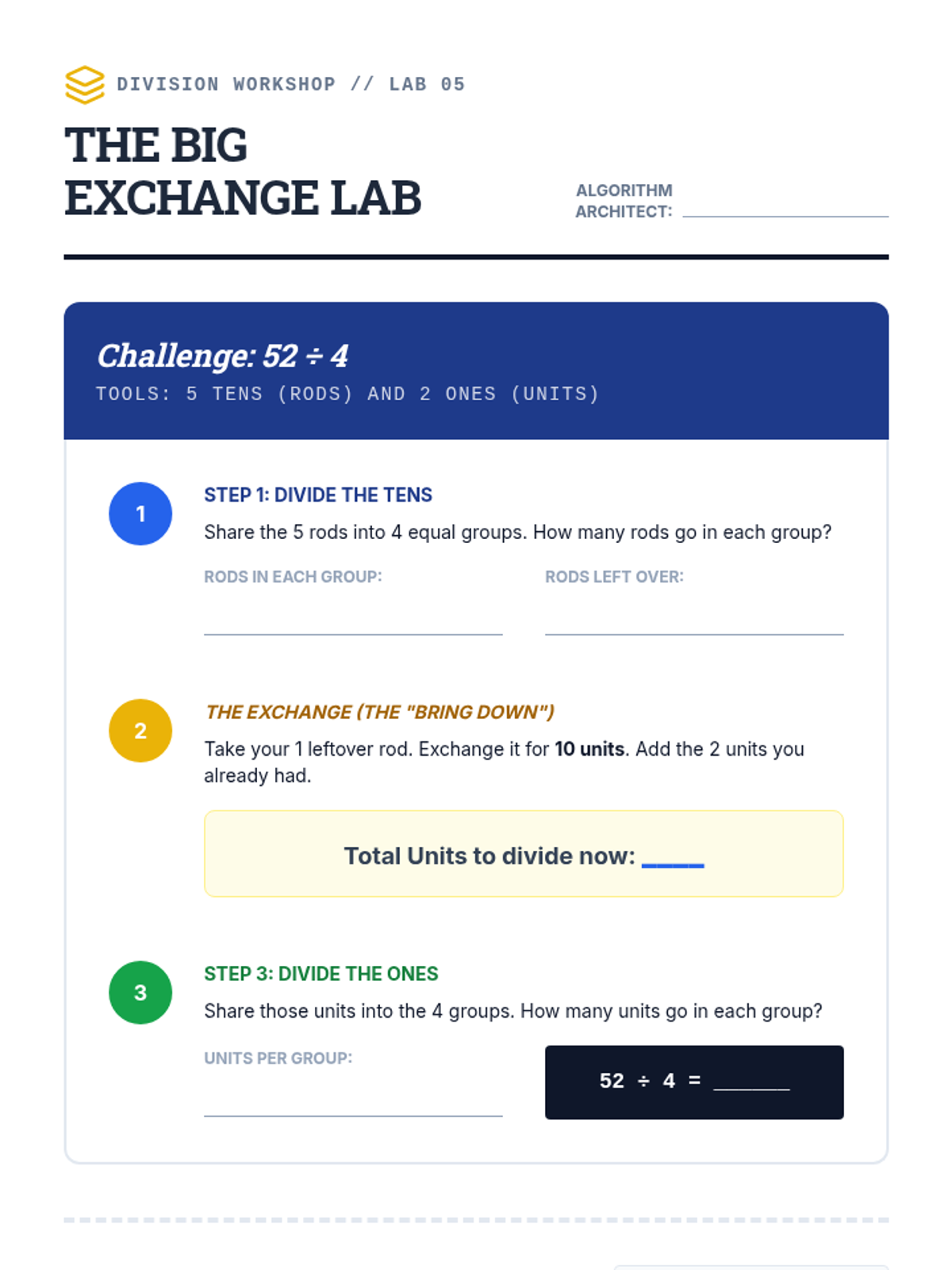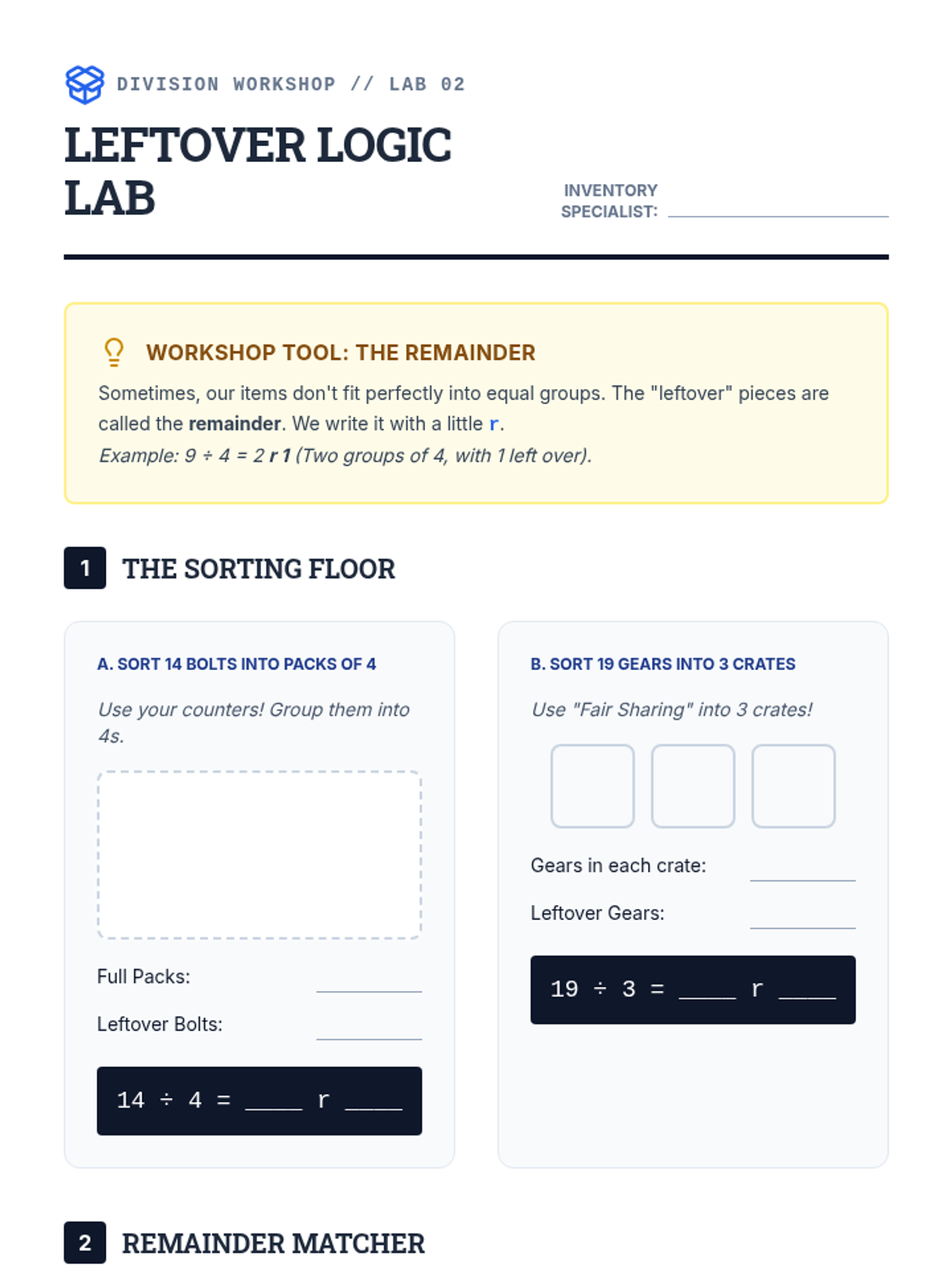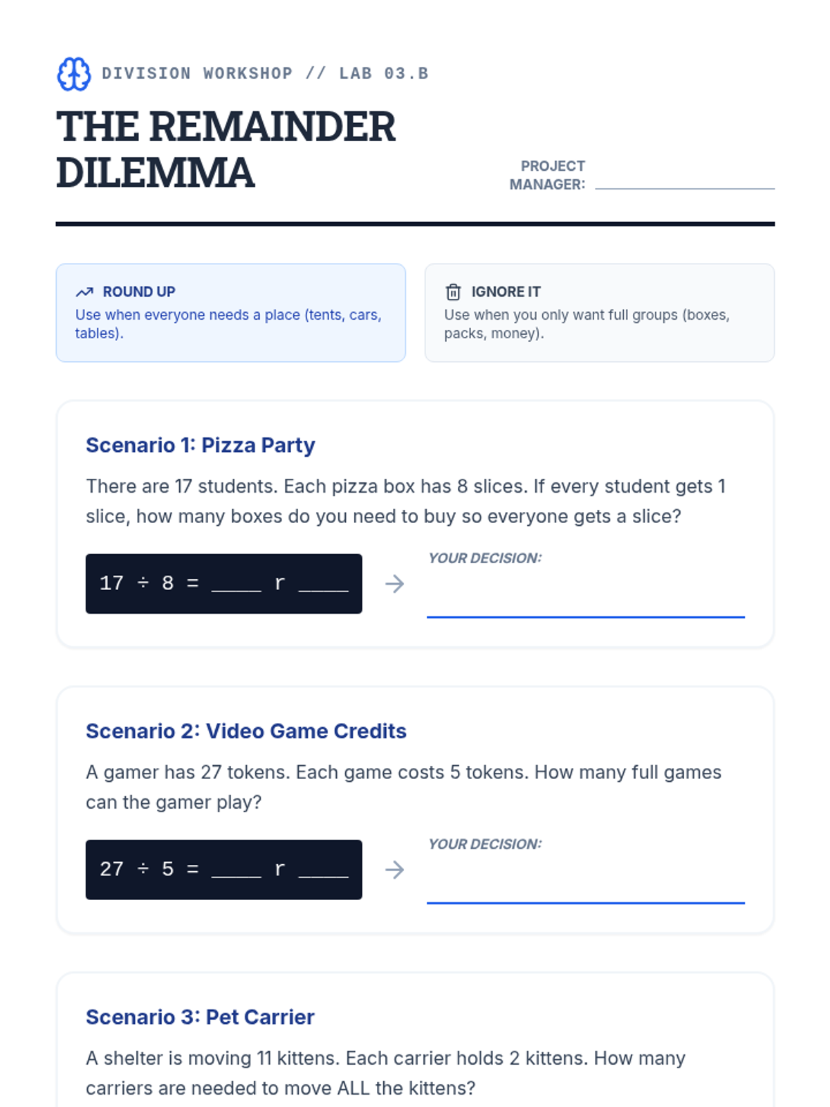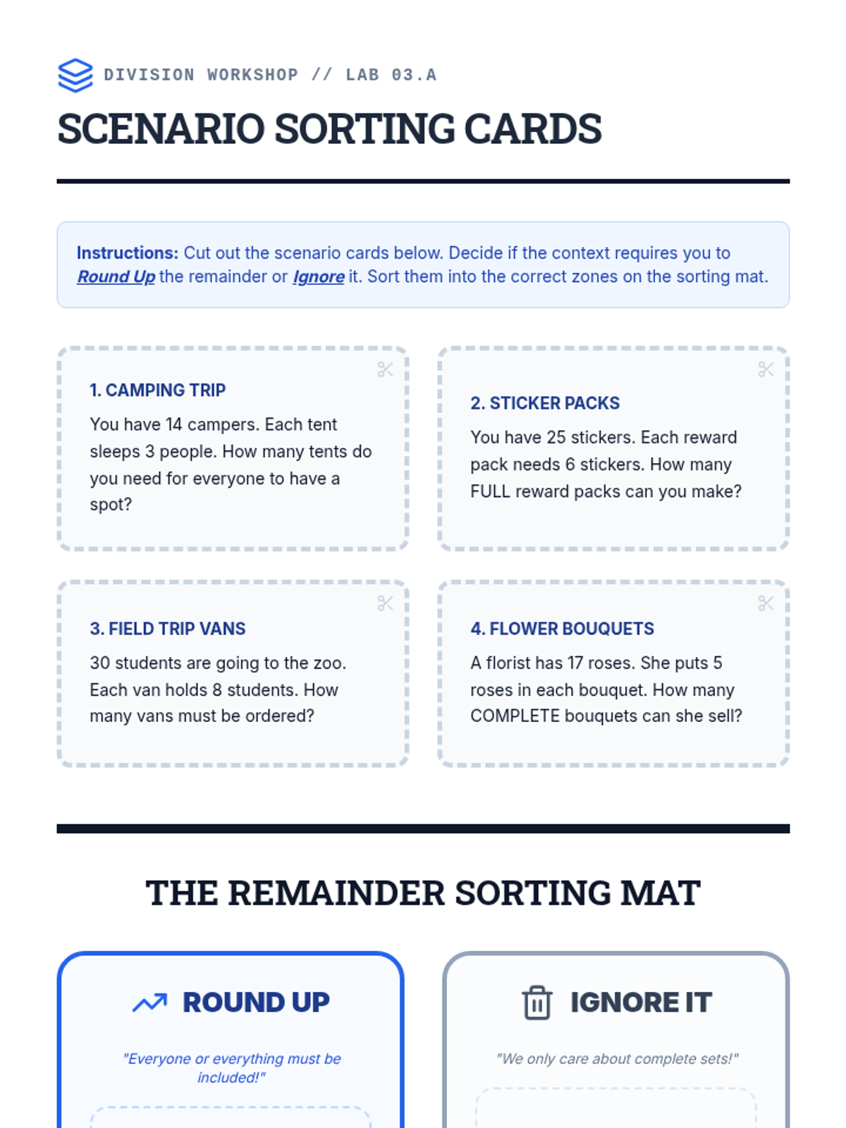 A 4th-grade math sequence focusing on division and remainders using physical and virtual manipulatives. Students progress from basic sharing/grouping concepts to interpreting remainders in word problems and scaffolding the long division algorithm.